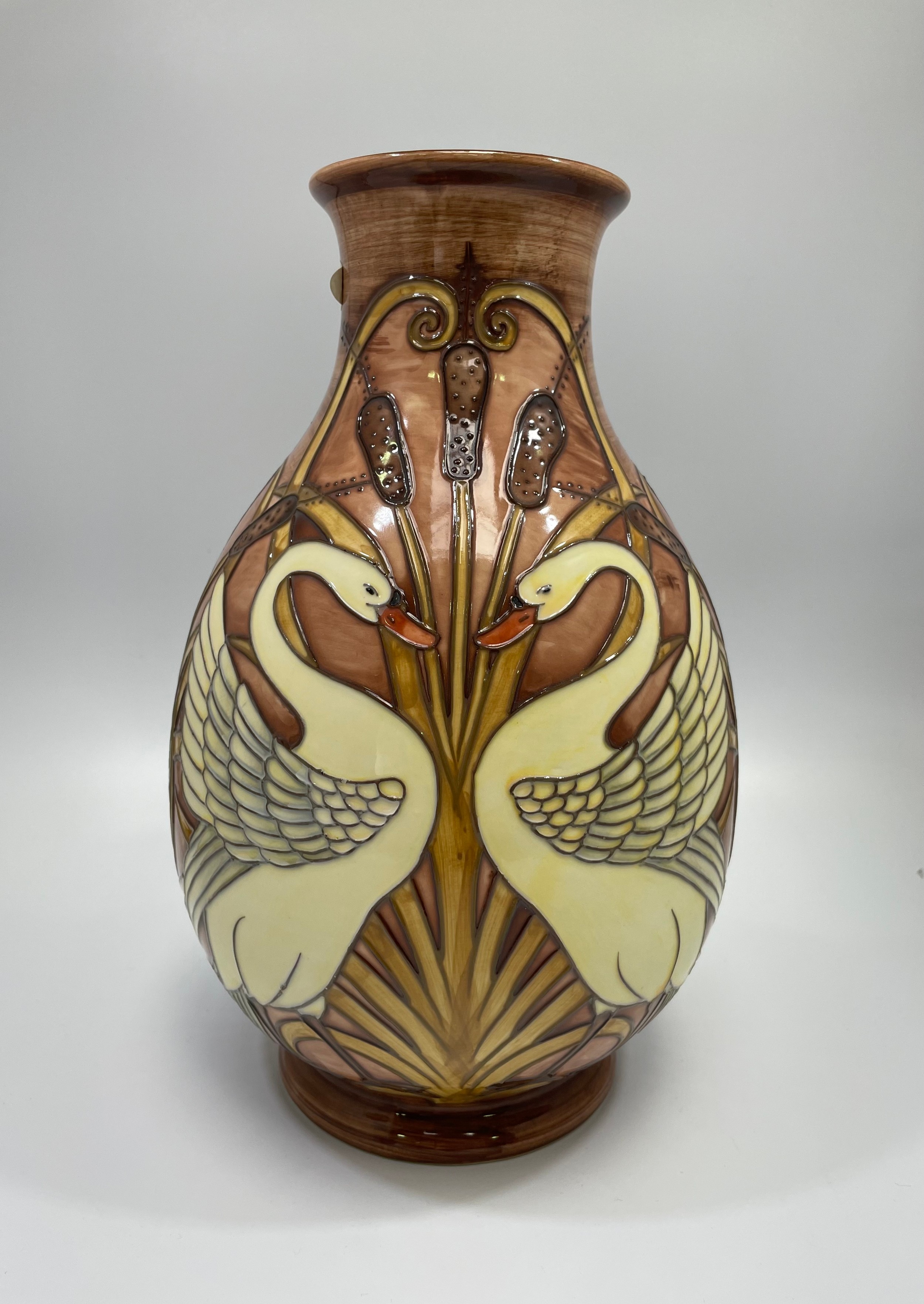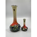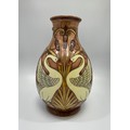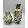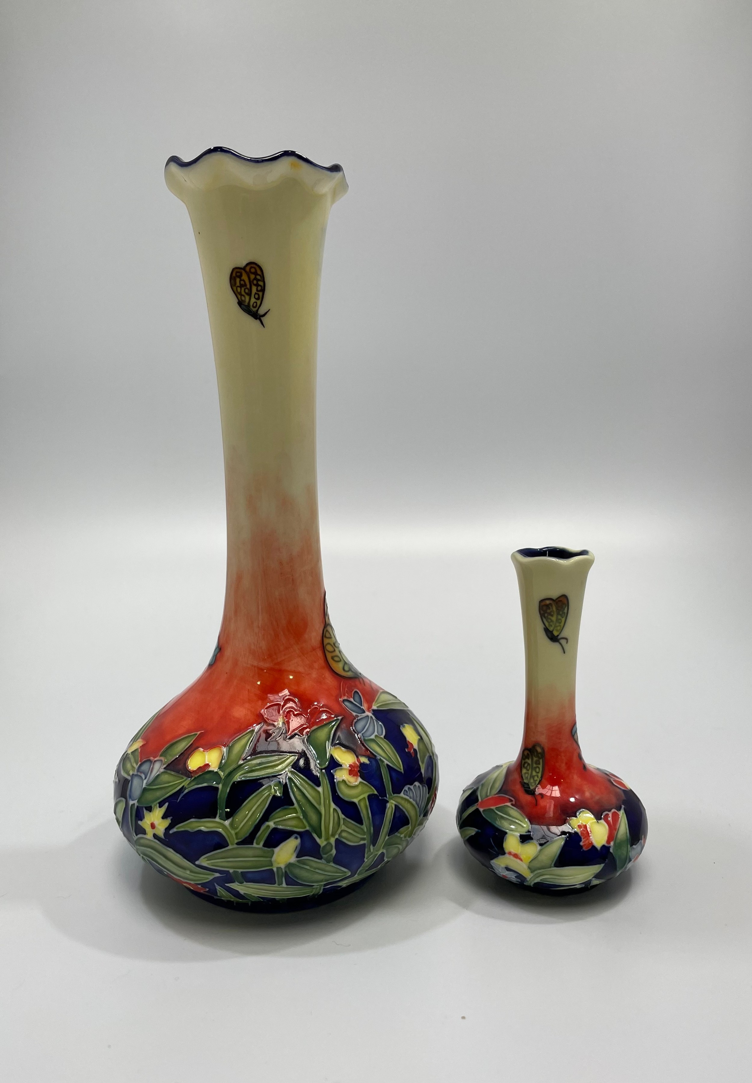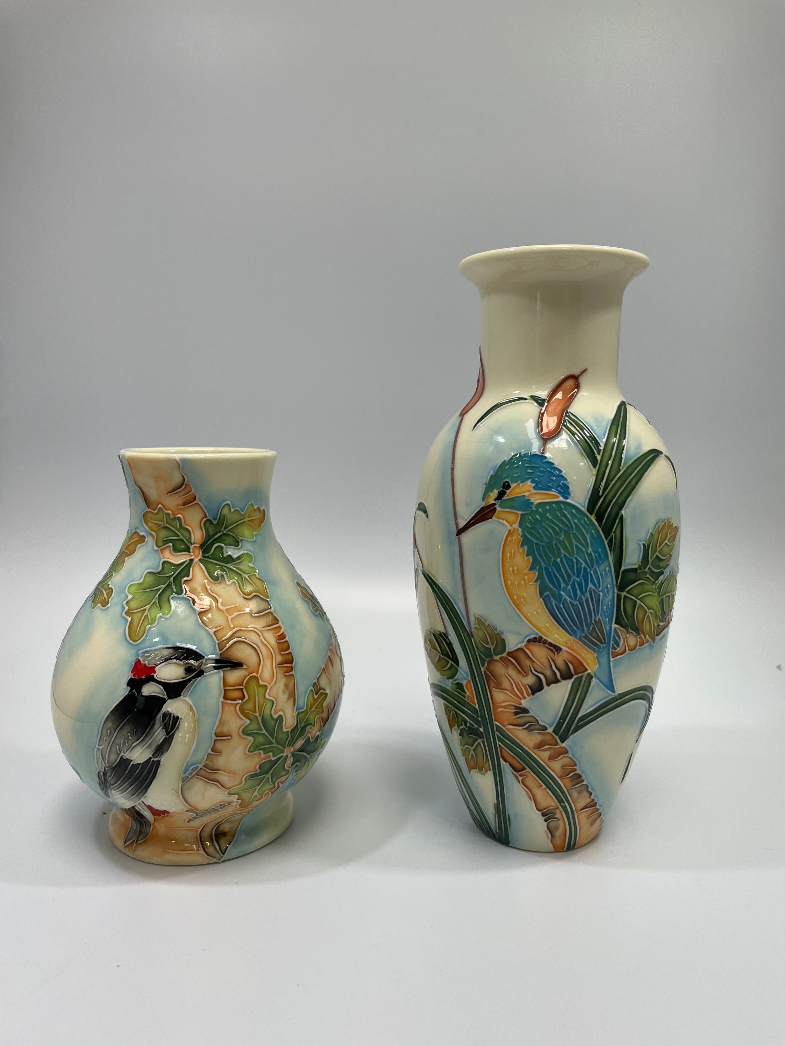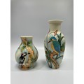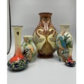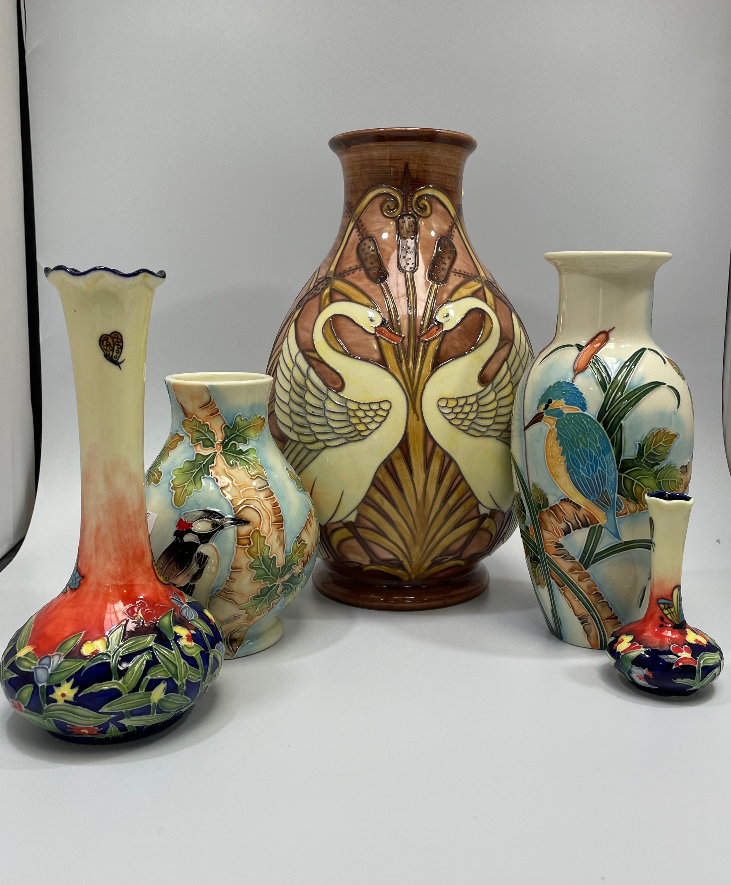 Three Old Tupton Ware tube-lined hand painted bird-themed vases, Courting Swans, Kingfisher and Woodpecker, together with two bud-vases of the same Butterfly design