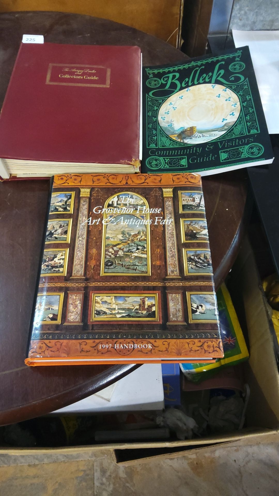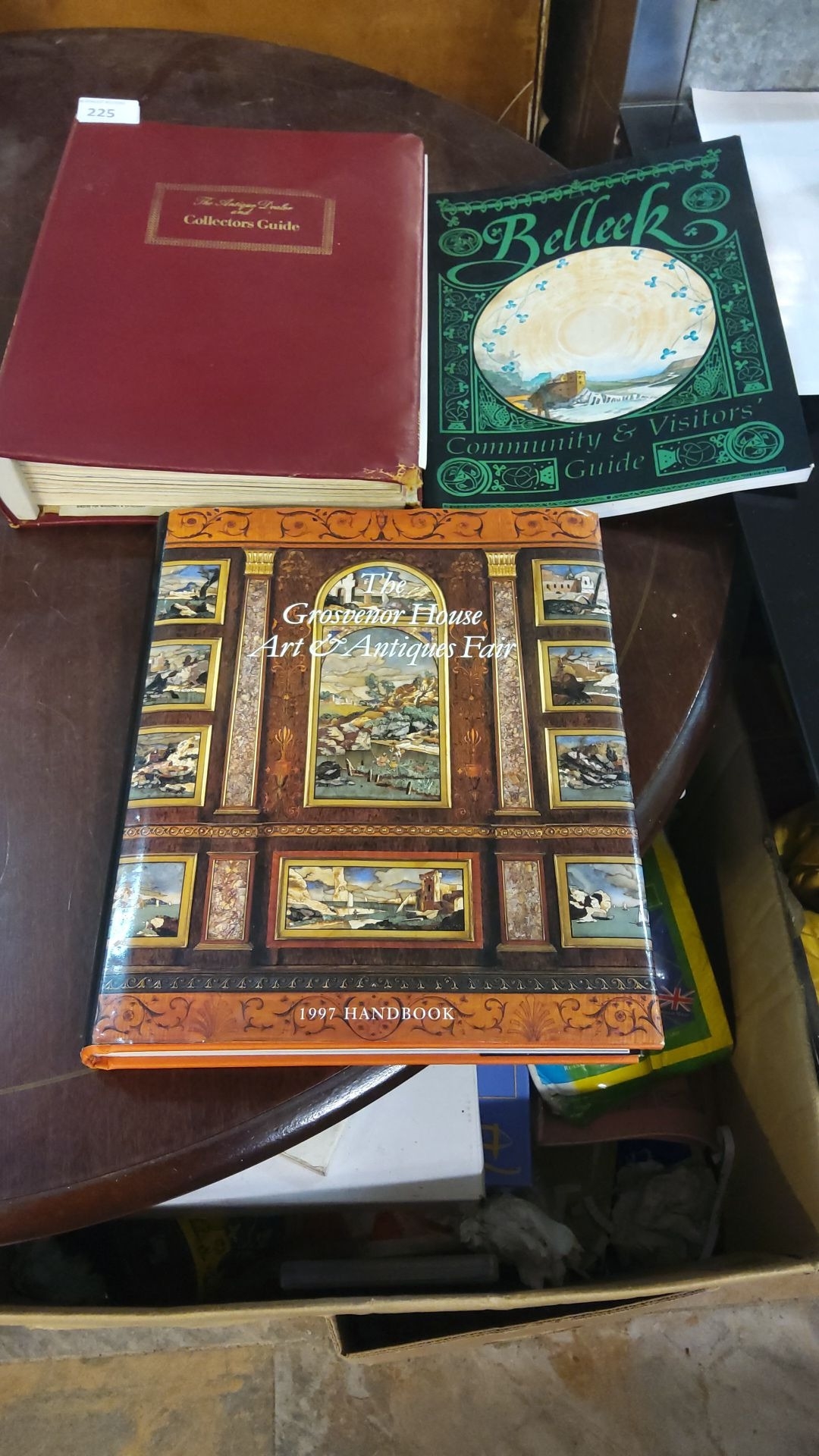 Set of three collectible guides: Antique Trader Collectors Guide, Belleek Community & Visitors Guide, and Grosvenor House Art & Antiques Fair 1997 Handbook.