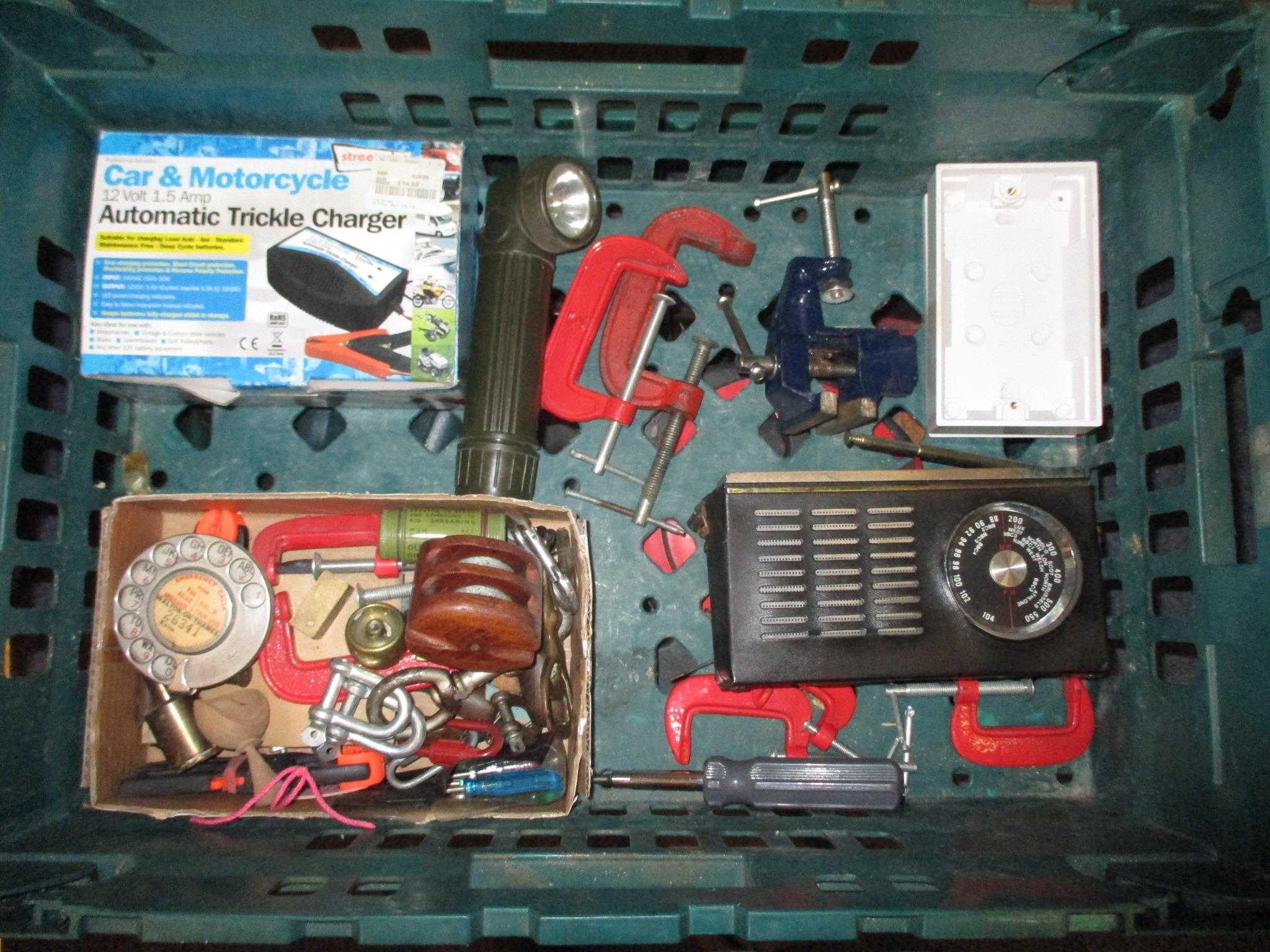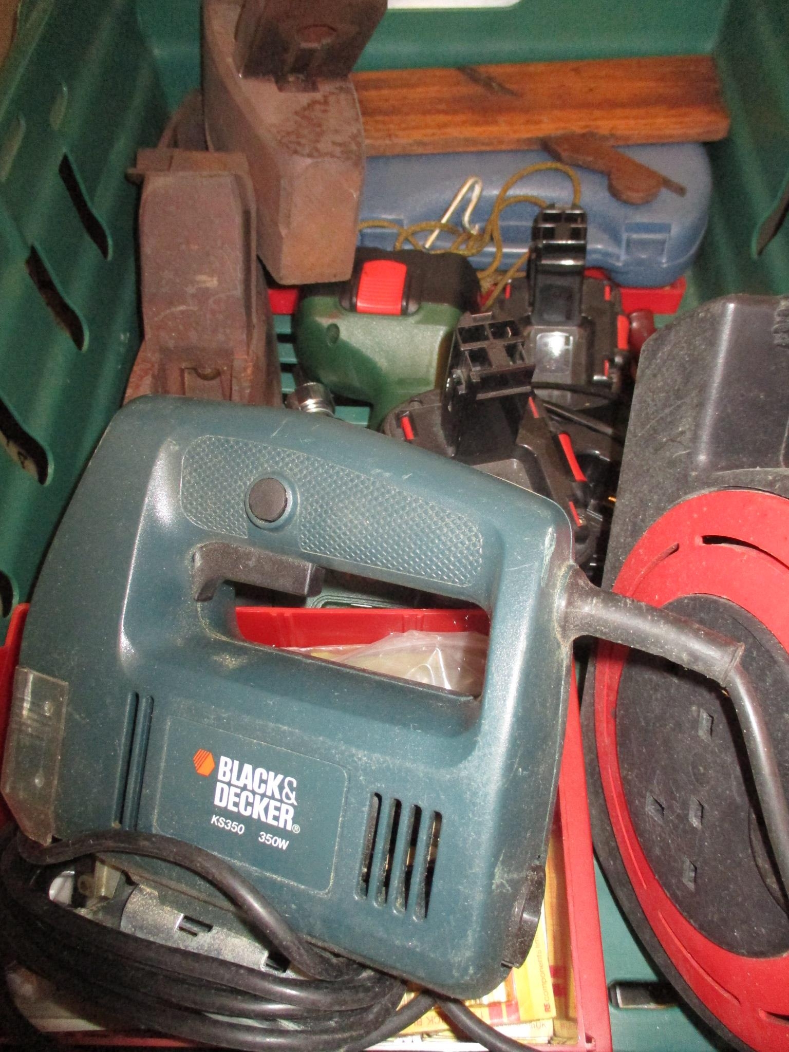 A quantity of hand tools to include box planes, an electric jig-saw, a portable radio and a 12 volt trickle charger