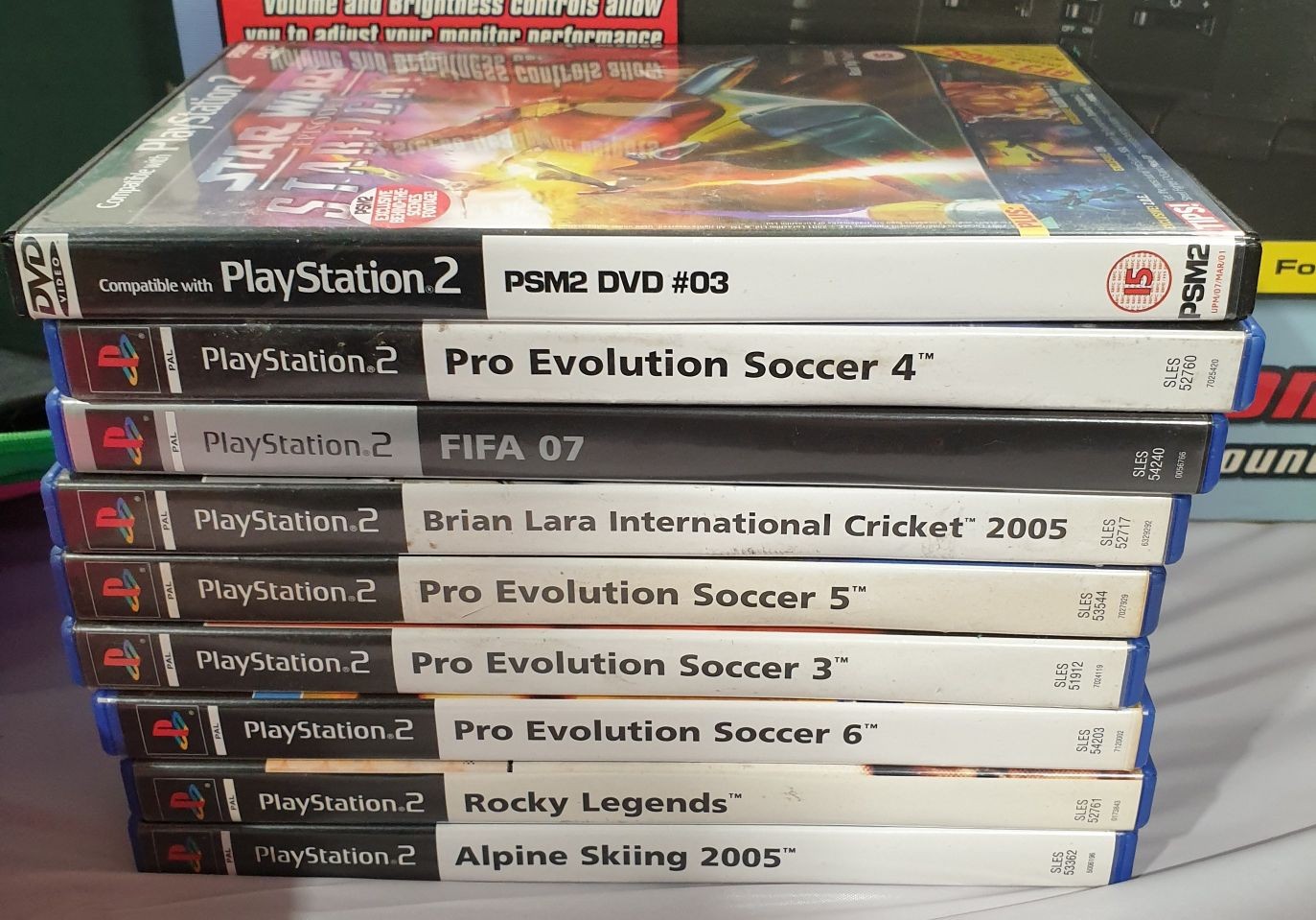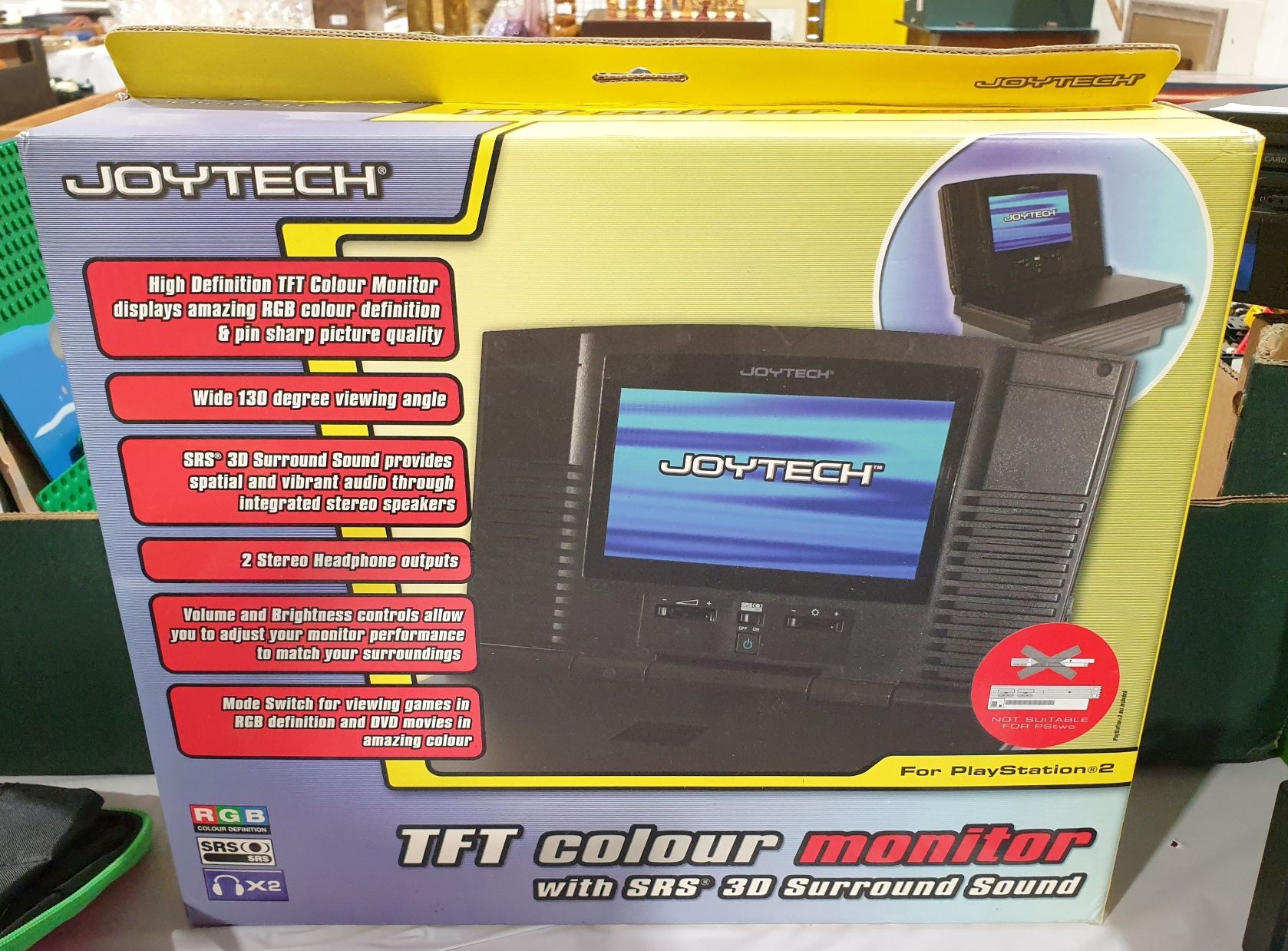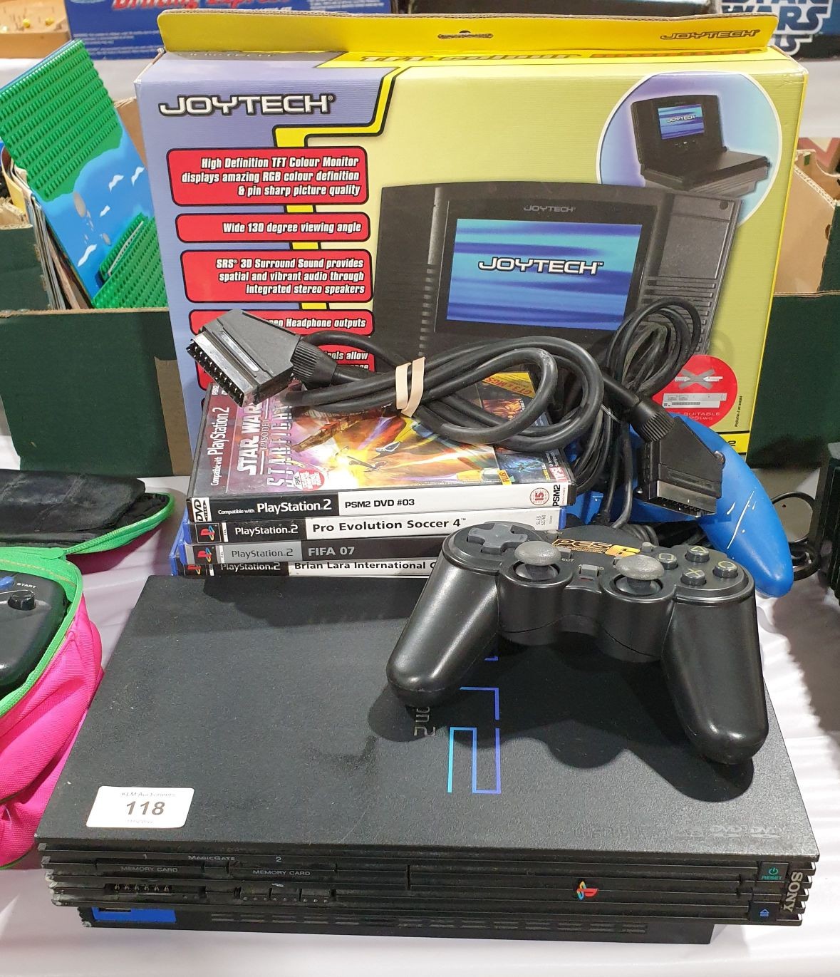 A Sony Play Station 2 with a Joytech folding screen together with controllers and games.