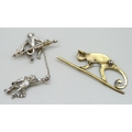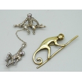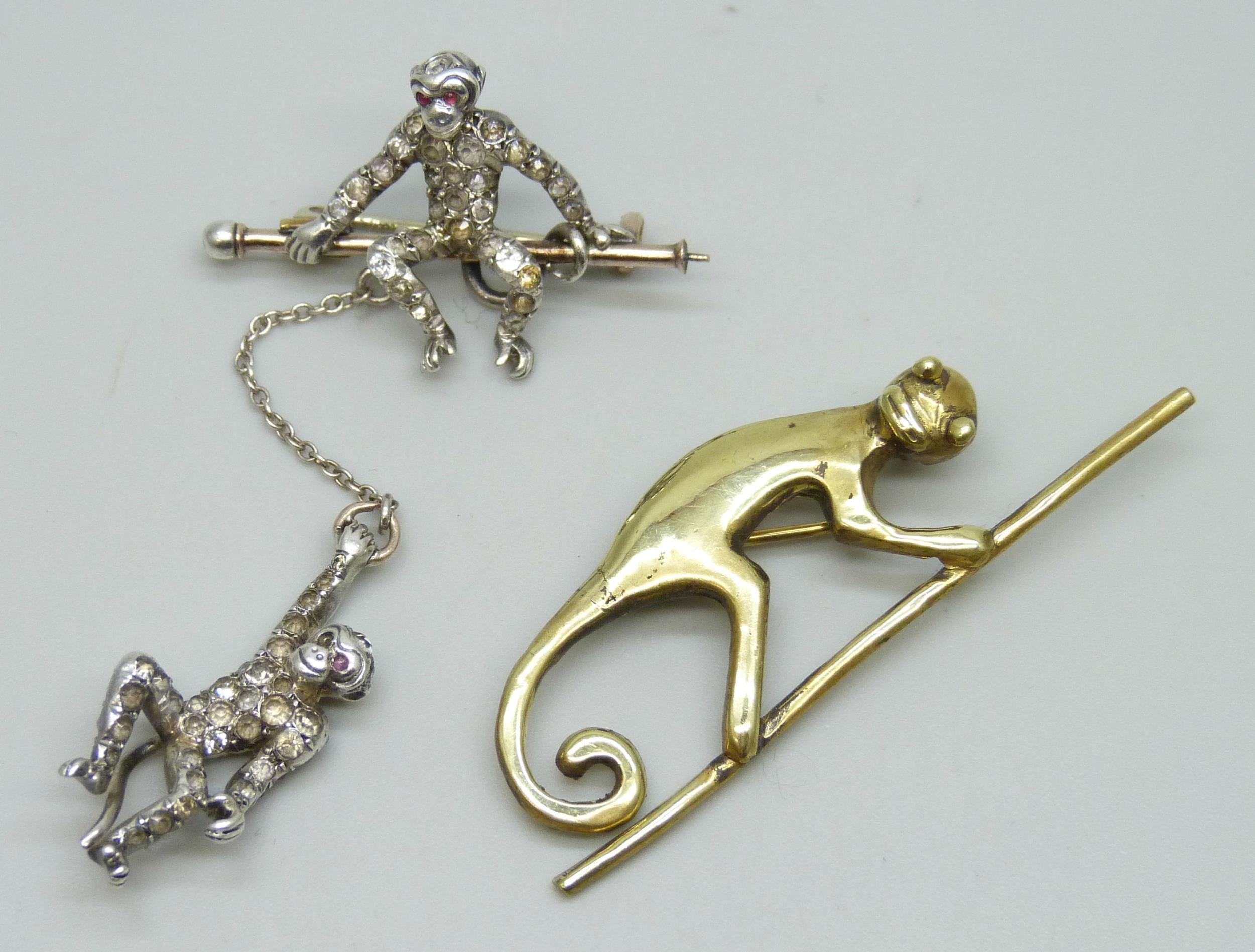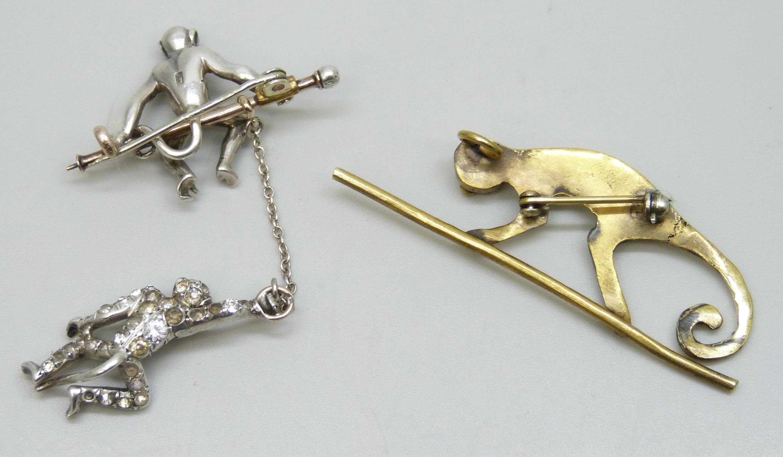 A white metal and paste stone brooch in the form of two monkeys, with control mark, some replacement stones, and another brooch, a/f, 5.3cm