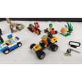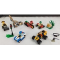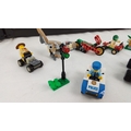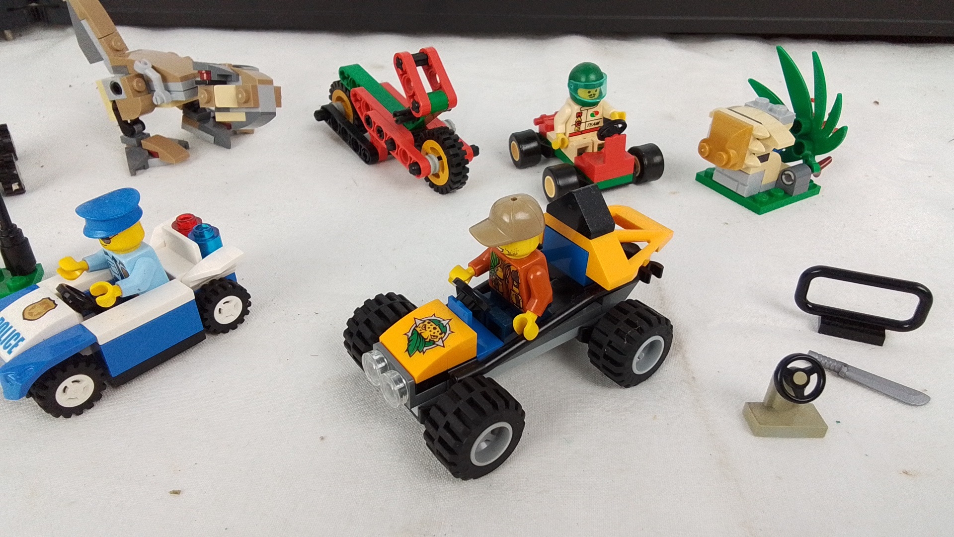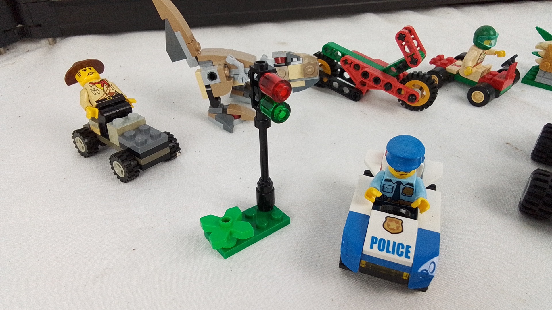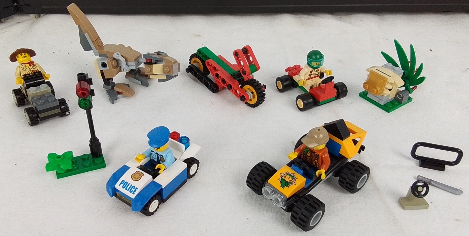 Collection of LEGO mini models including a police car with officer, two small buggies with minifigures, a Technic-style motorcycle, a brick-built dinosaur, and assorted accessories including traffic light, foliage and roadside elements.