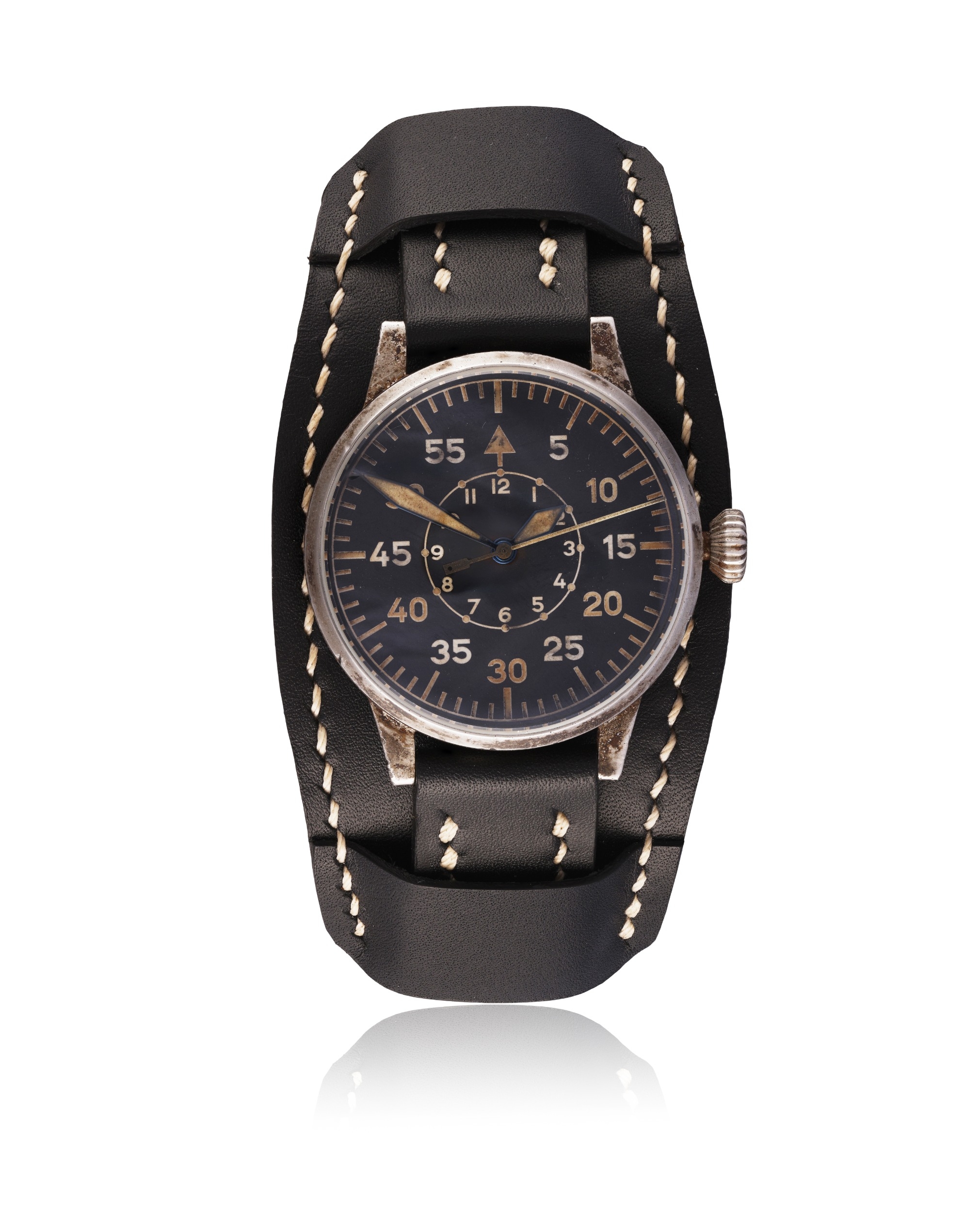 LACO REF. 862097, STAINLESS STEEL PILOT'S WRISTWATCH "FLIEGER" A modern pilot's wristwatch by Laco. Year: 2024 Dial: Black dial with Arabic numerals, inner hour track, outer minute track, triangular marker at 12, syringe hands Movement: Manual wind, Laco signed, movement no. DM12.2/586 Case: Stainless steel case, engraved "FLIEGER" and military-style markings, case no. FI. 23883 Size: 41 mm approx. Gross Weight: 80 g approx. Bracelet/Strap: Black leather strap with stainless steel pin buckle Signature: Dial, case and movement signed Accessories: Full set with box and papers, original brown leather Laco strap and additional black leather strap