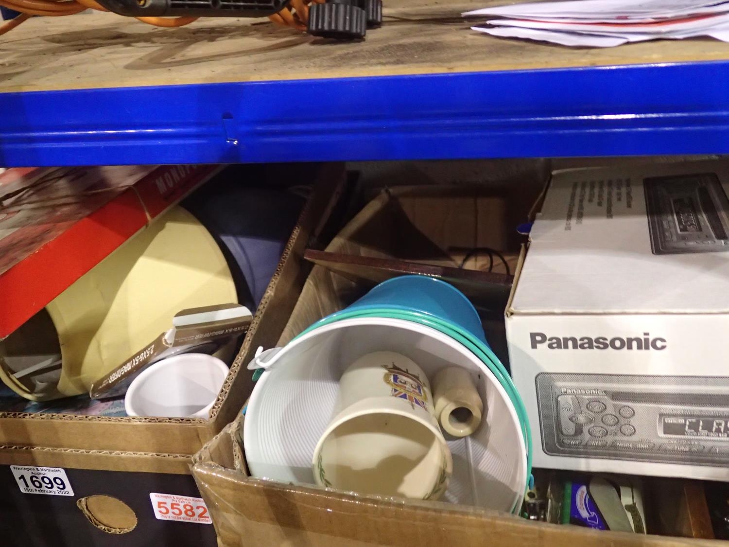 Two boxes of mixed items including a Panasonic Radio. Not available for in-house P&P, contact Paul O'Hea at Mailboxes on 01925 659133