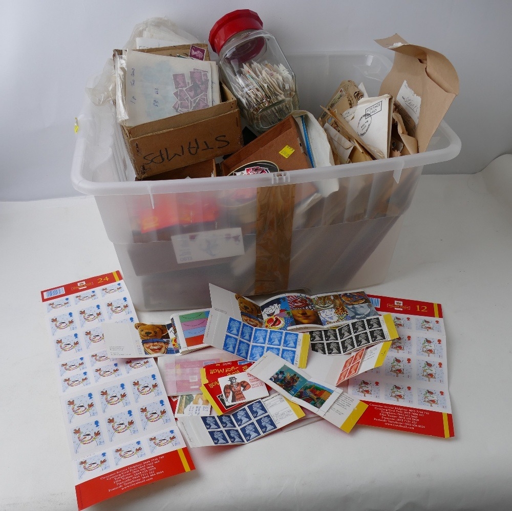 Large collection of loose stamps, first day covers, Philatelic Bulletin magazines from 1970's and 80's and large quantity of packs of unused Royal Mail first and second class stamps