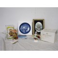 A boxed Royal Albert Old Country Roses posy basket (a/f chips) in box, a boxed Leonardo Collection resin pig figure 'Smoky Bacon', a Royal Copenhagen 1988 Christmas plate, and a mounted china wall plaque of a sailing ship