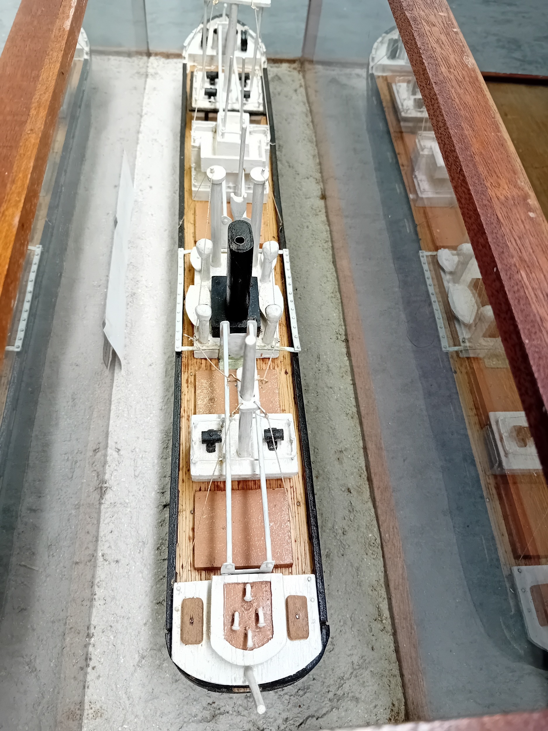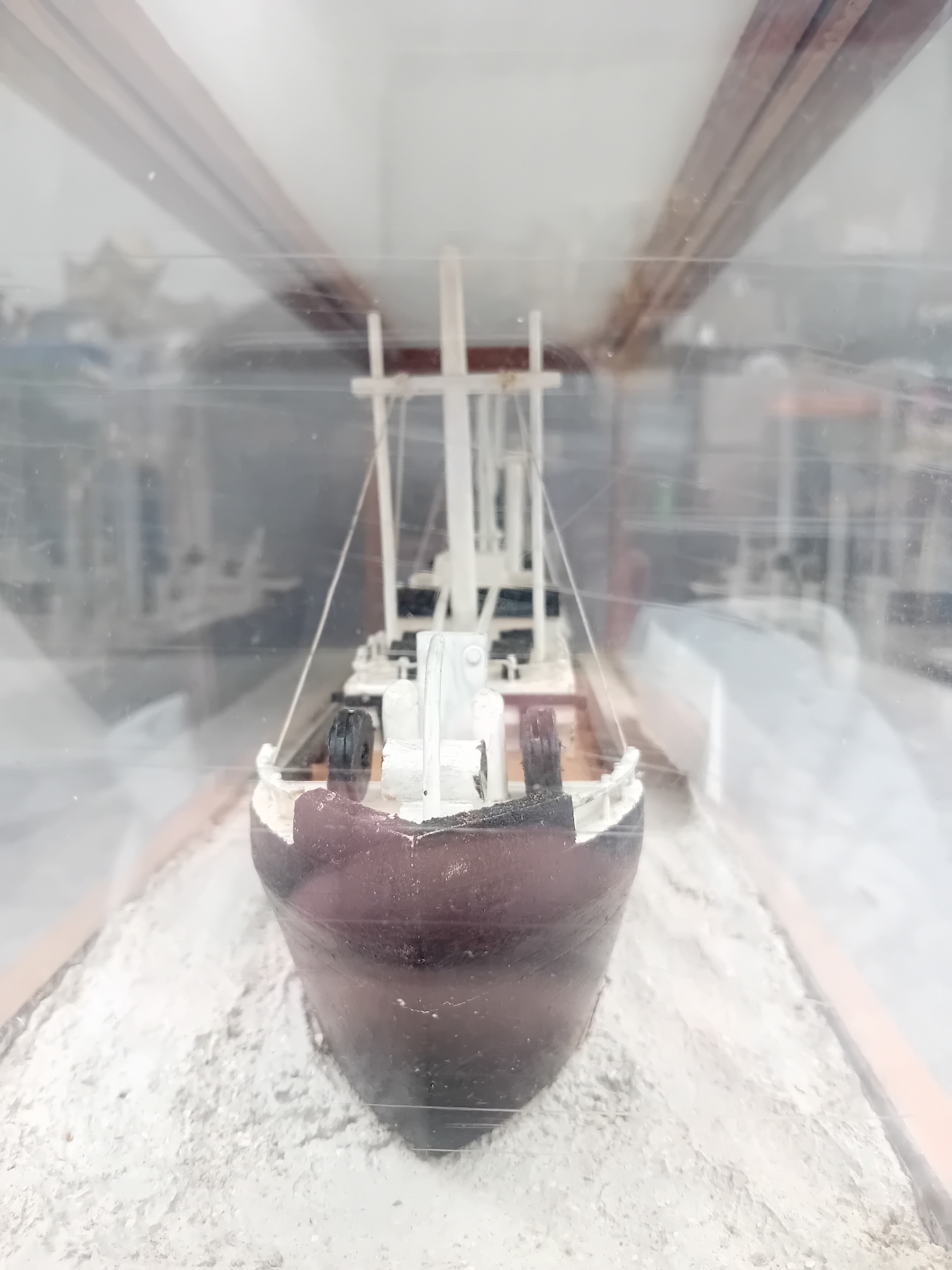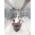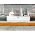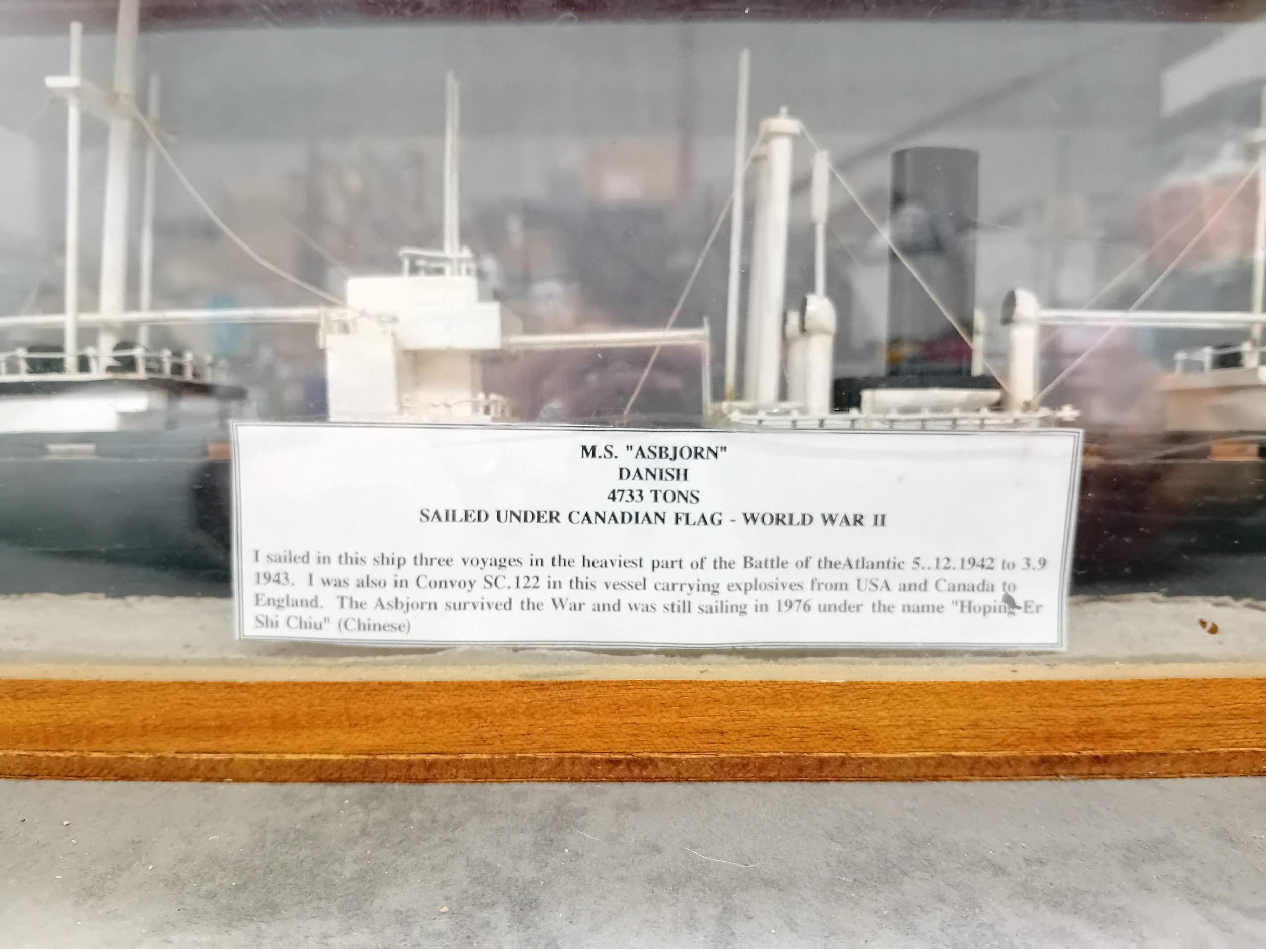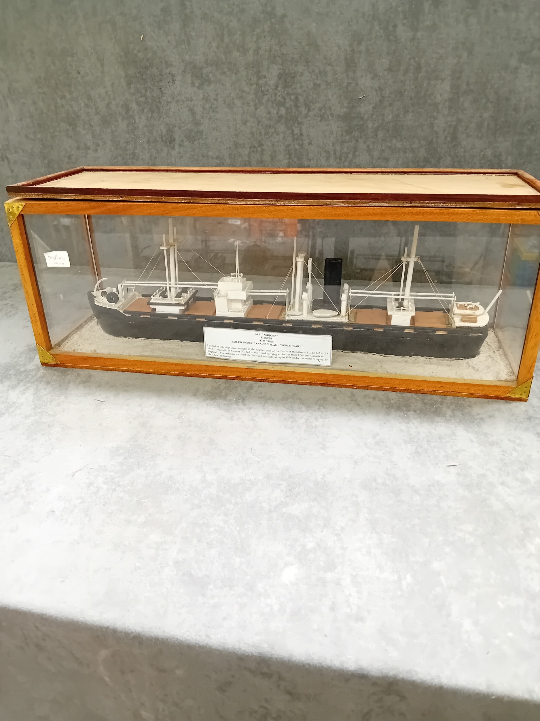 Model of the M.S Asbjorn Danish 4733 tons sailed under Canadian flag world war 2 in glass display case size is 61cm long 23cm tall 19cm deep