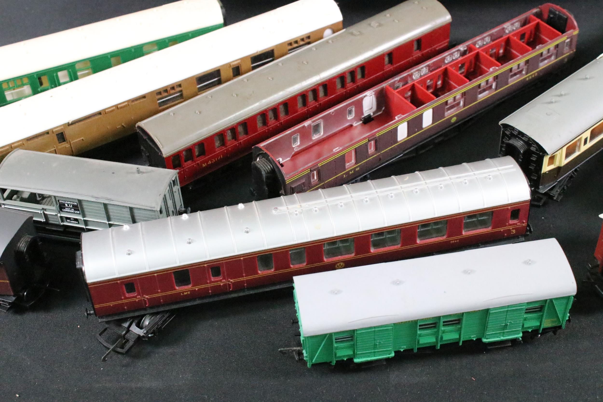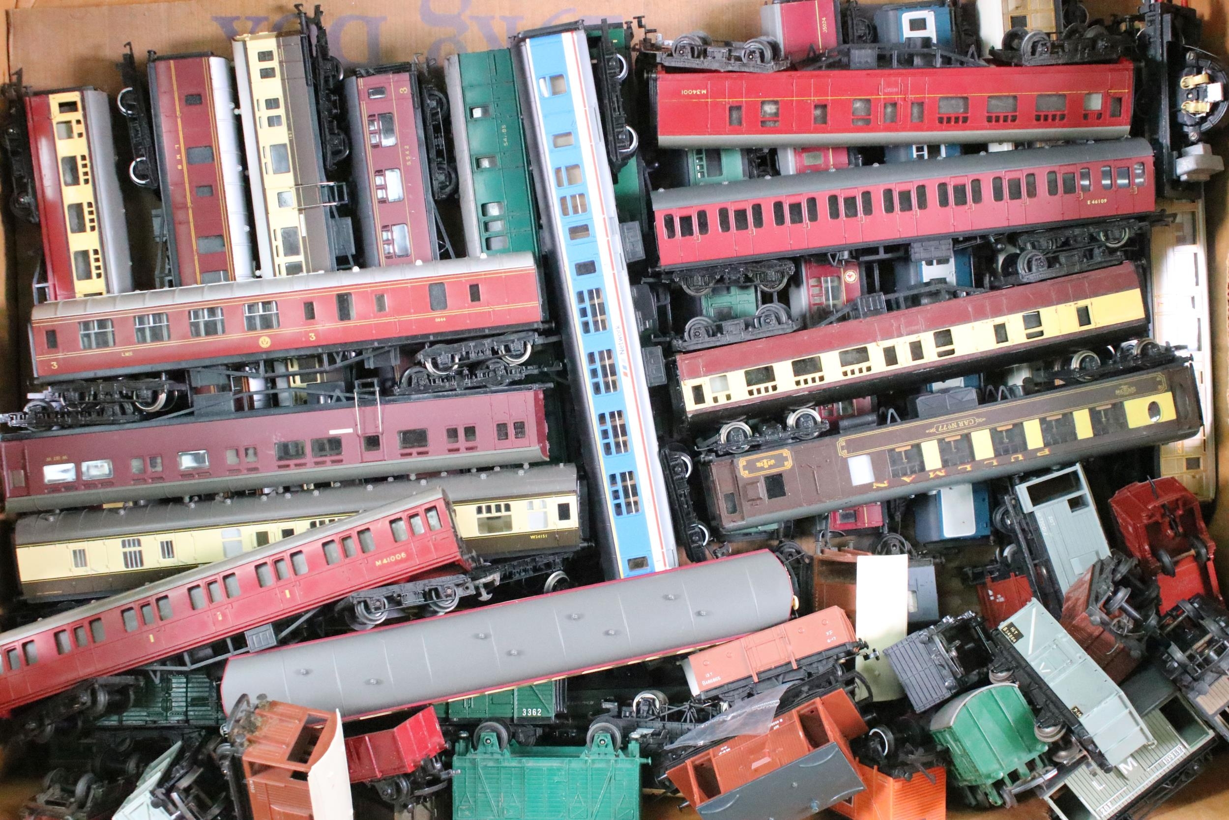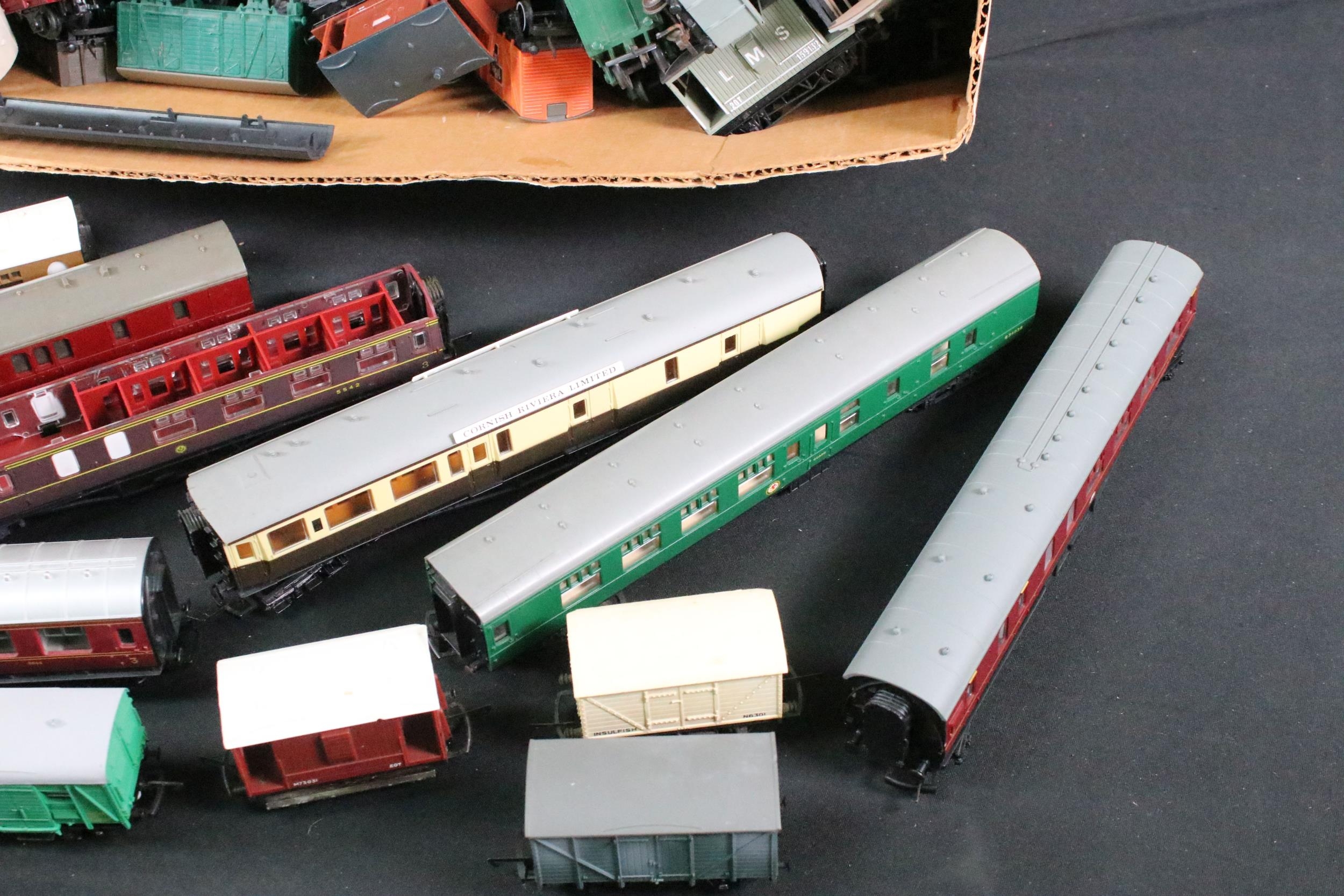 64 OO gauge items of rolling stock featuring Hornby, Airfix, Triang etc, featuring various coaches and vans