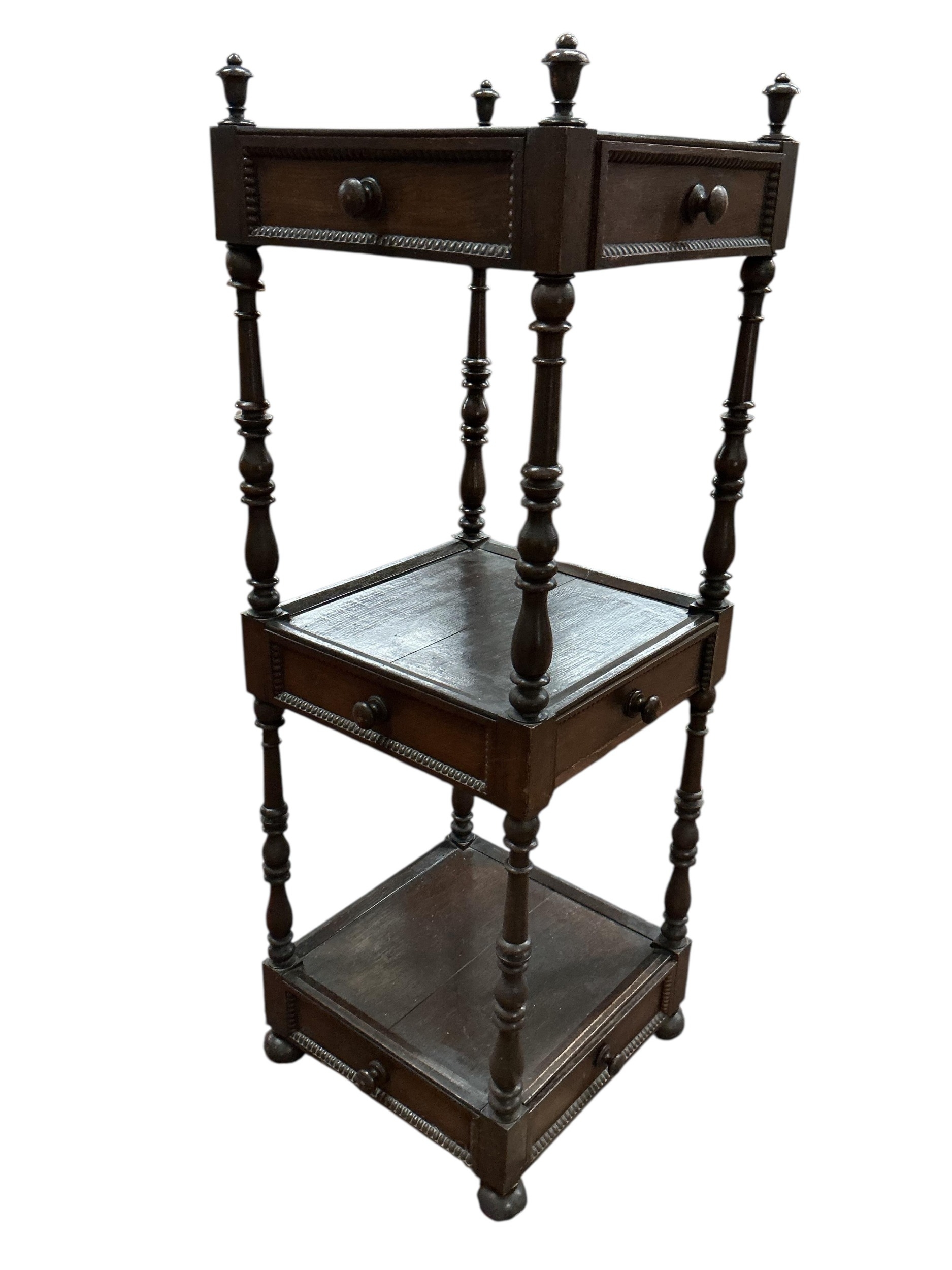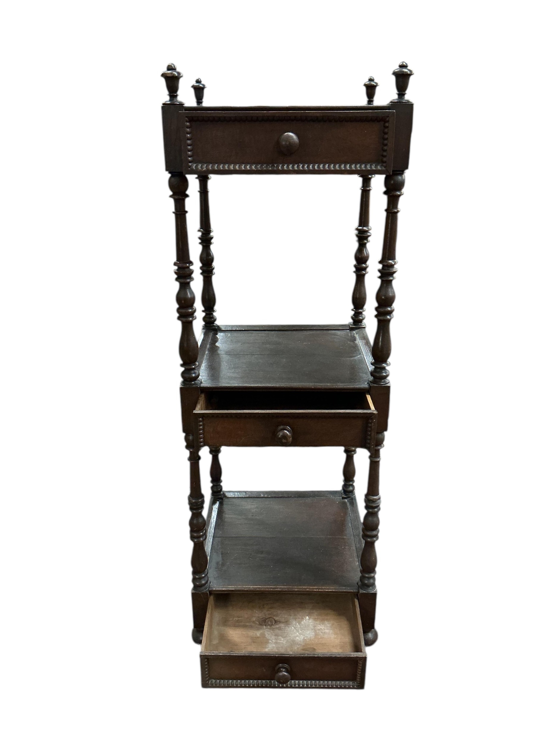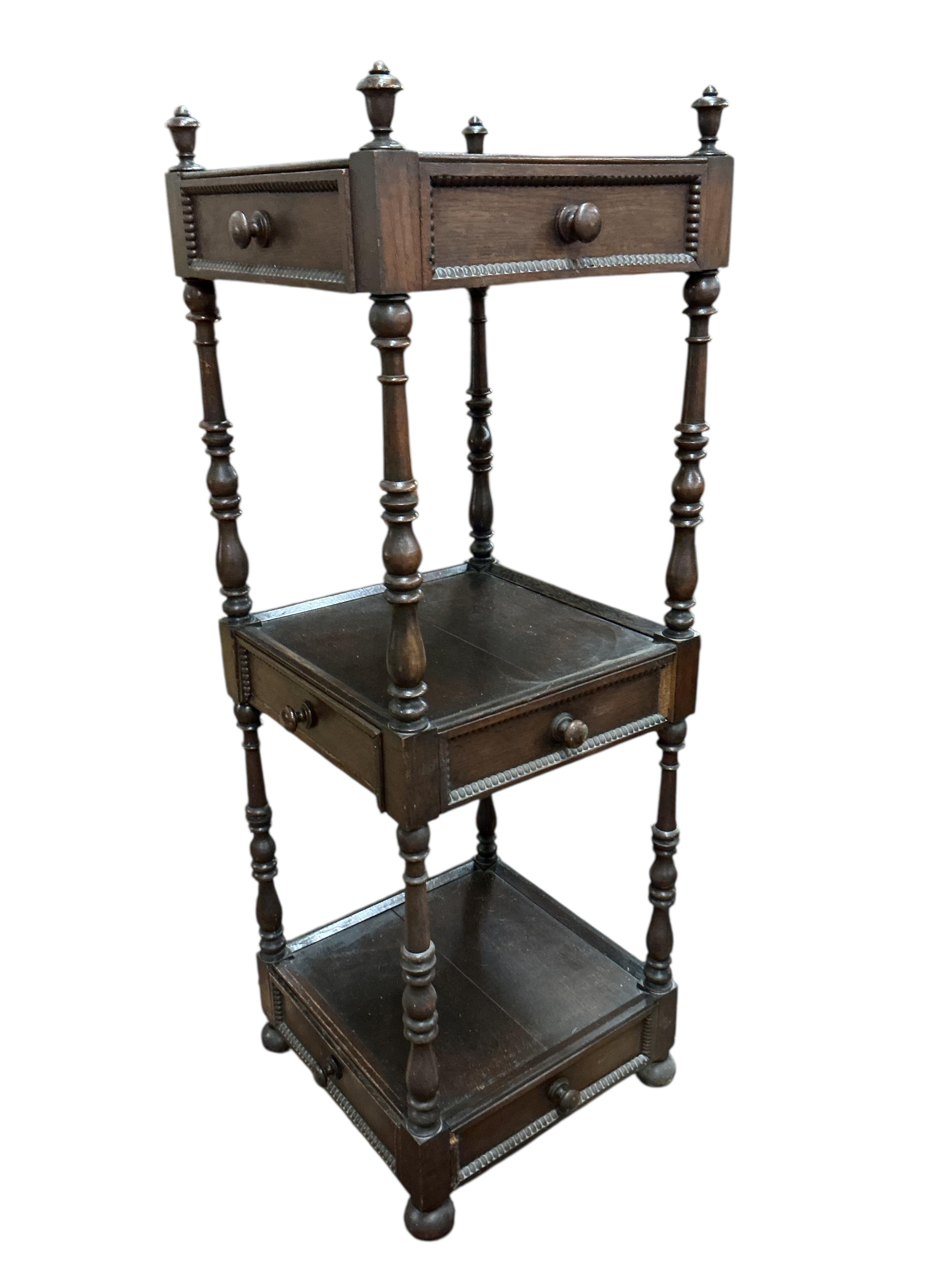 A Regency style oak three tier whatnot, width 46cm, height 136cm