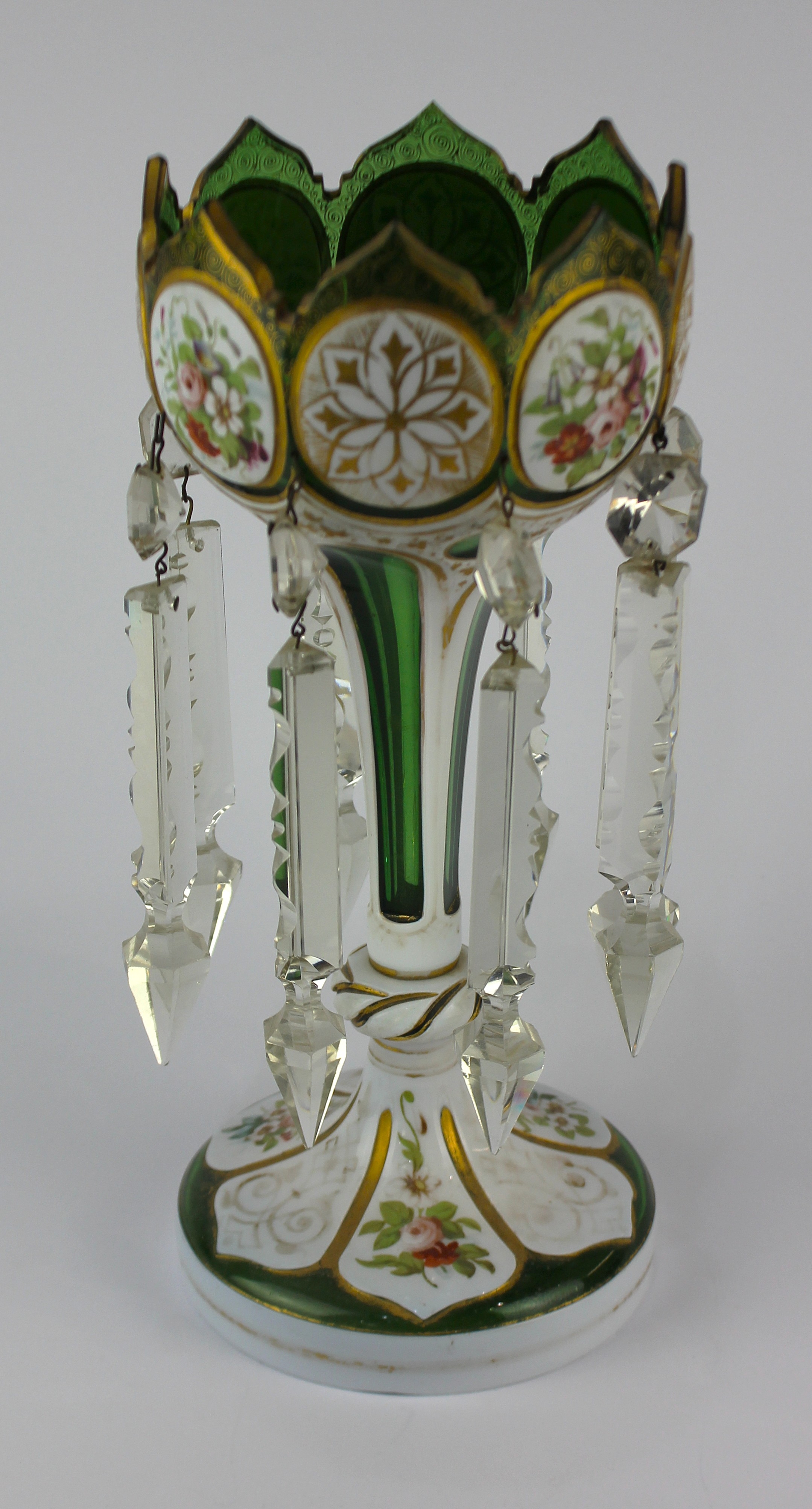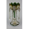 A 19th century Bohemian green glass and enamel decorated table lustre, decorated with alternating floral and geometric gilt panels, with clear glass drops, height 29cm
