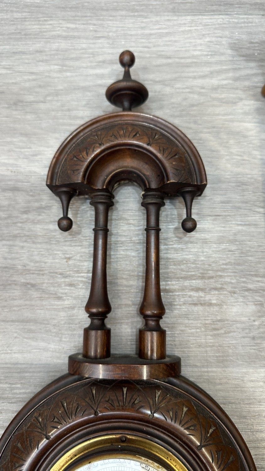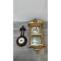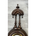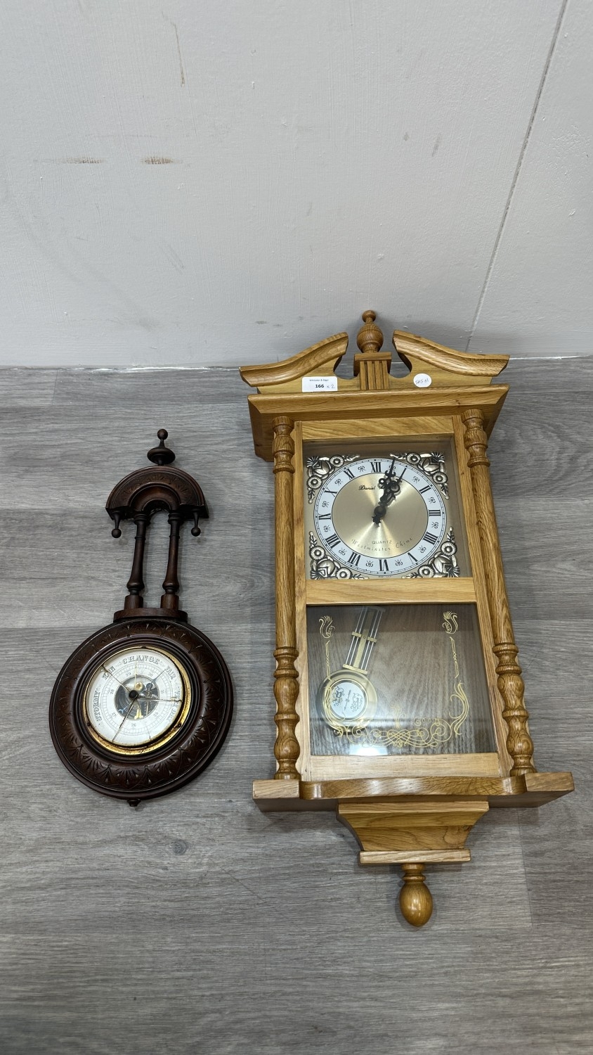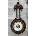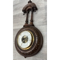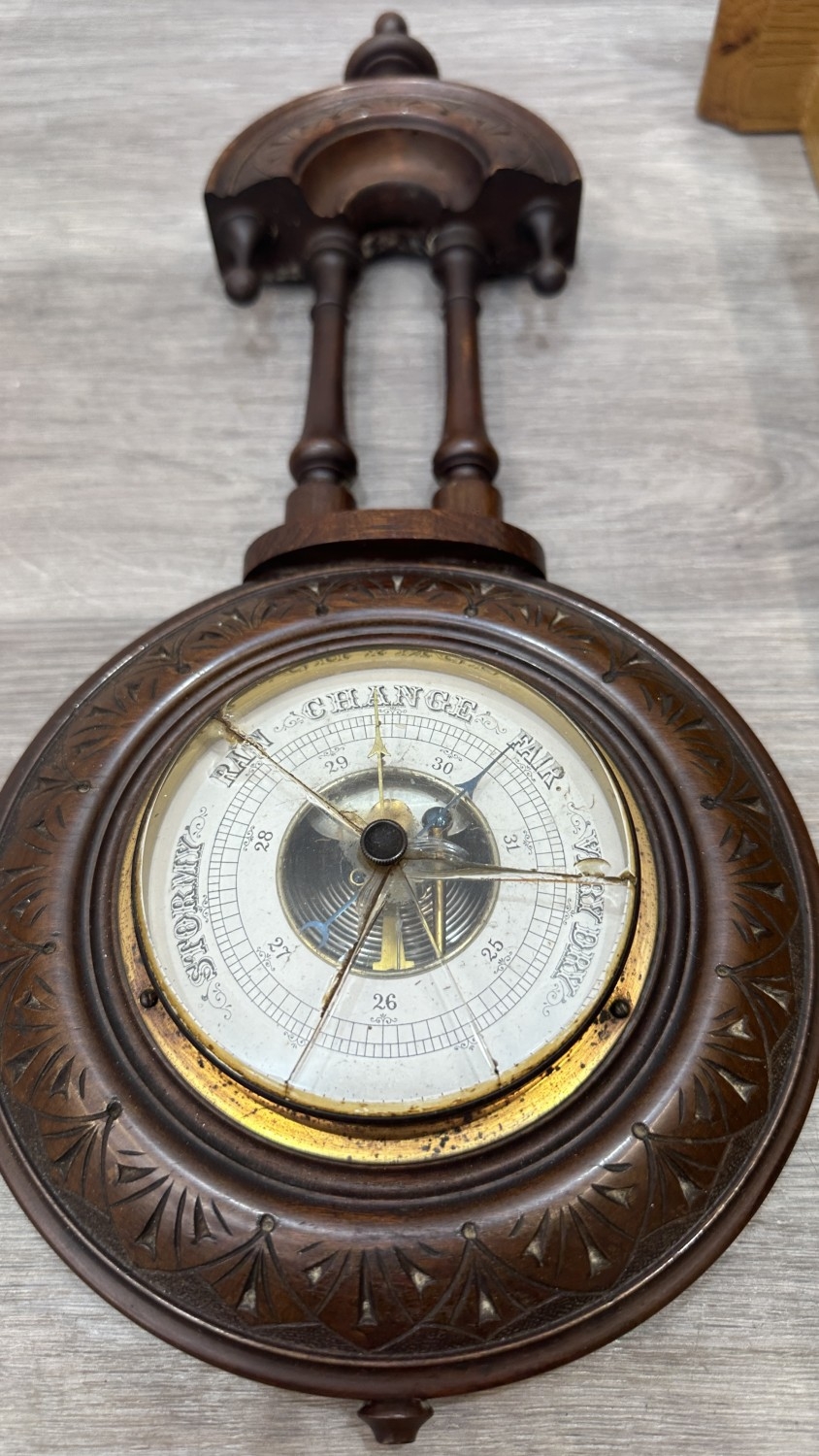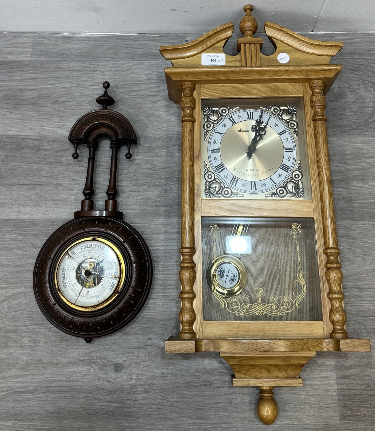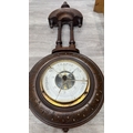 Two items, one late 19th/early 20th century carved mahogany cased aneroid barometer and one late 20th century Daniel Dakota oak cased quartz Westminster chime wall clock - largest approx. 62cm high x 29cm wide x 11cm deep