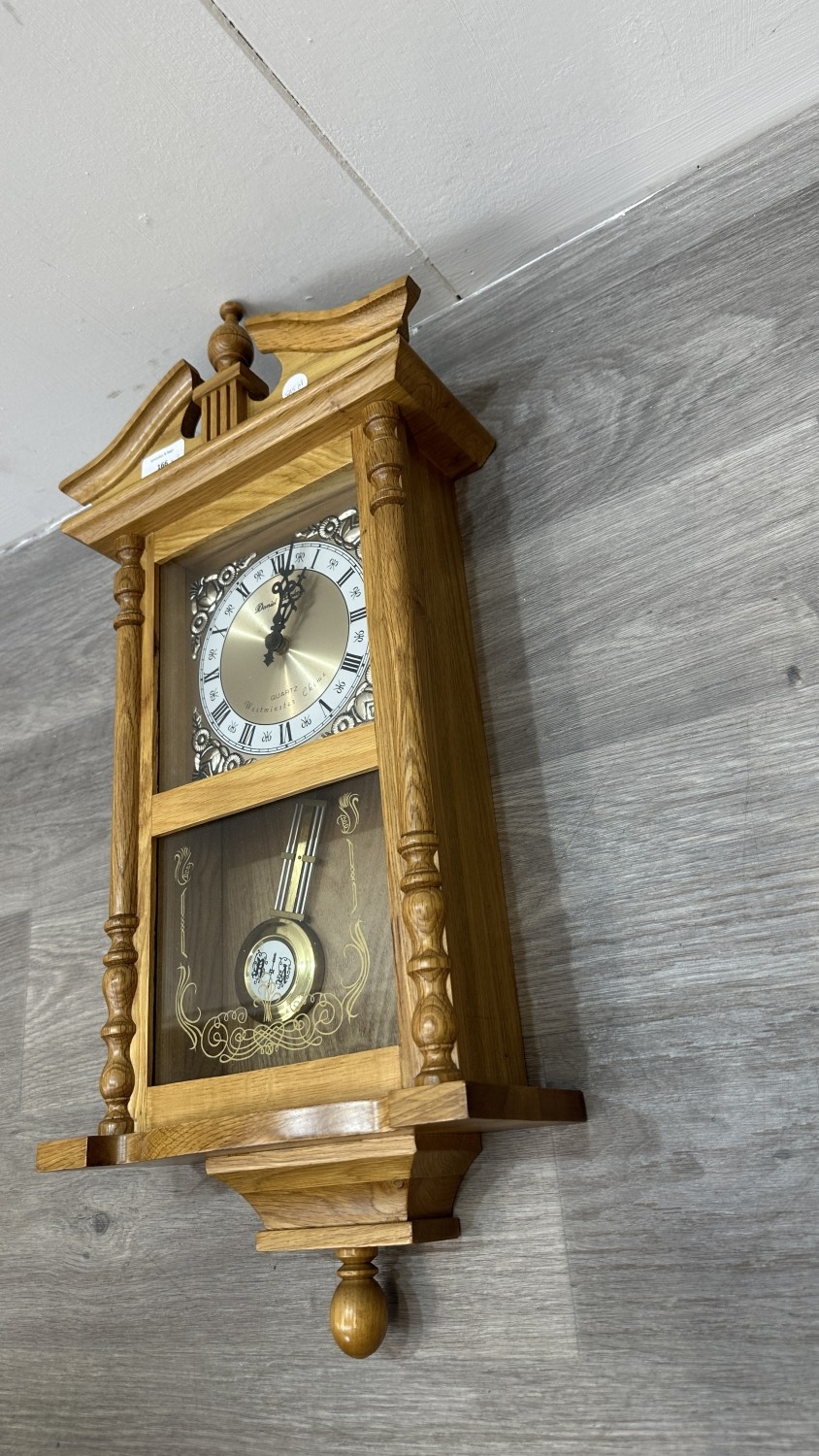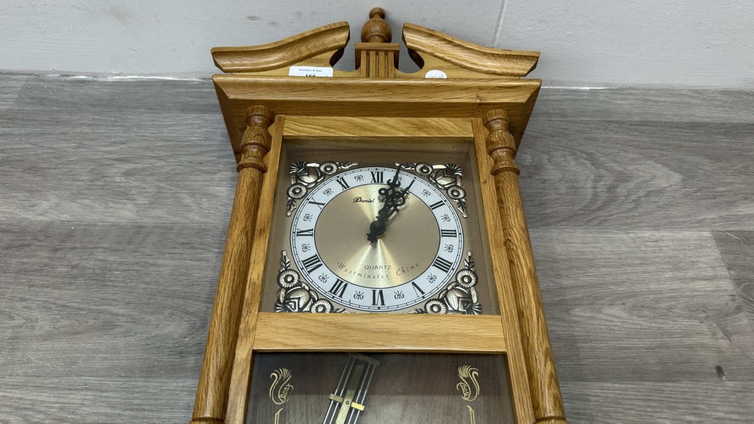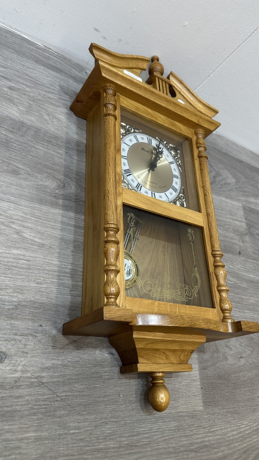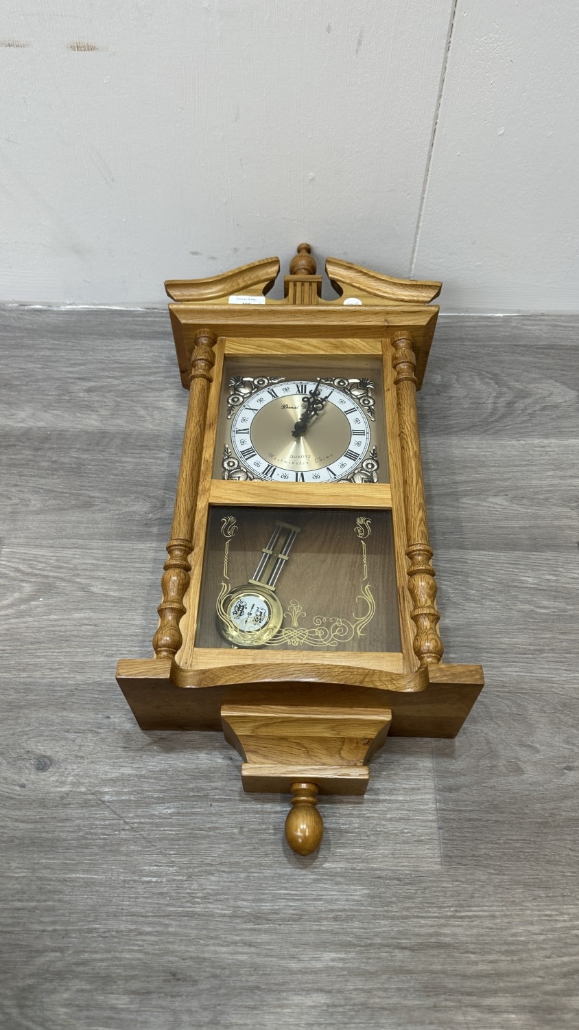 Two items, one late 19th/early 20th century carved mahogany cased aneroid barometer and one late 20th century Daniel Dakota oak cased quartz Westminster chime wall clock - largest approx. 62cm high x 29cm wide x 11cm deep