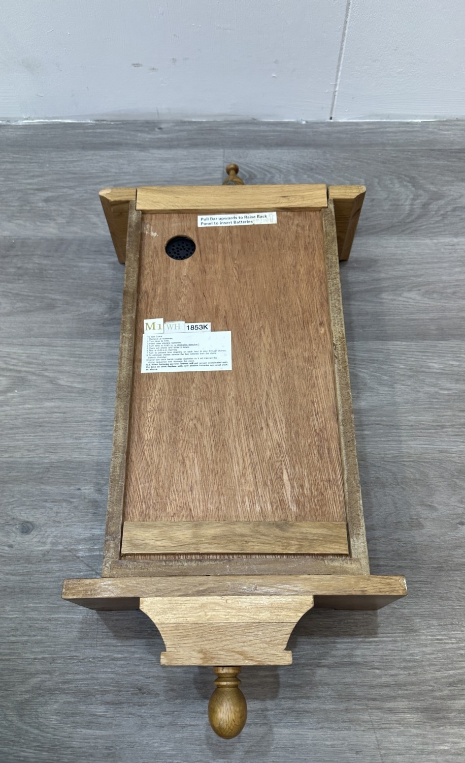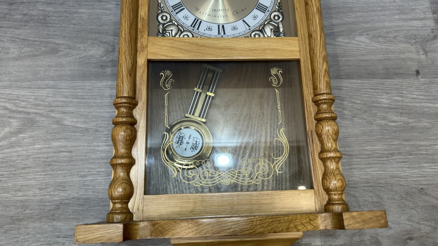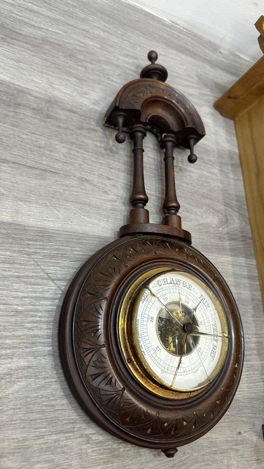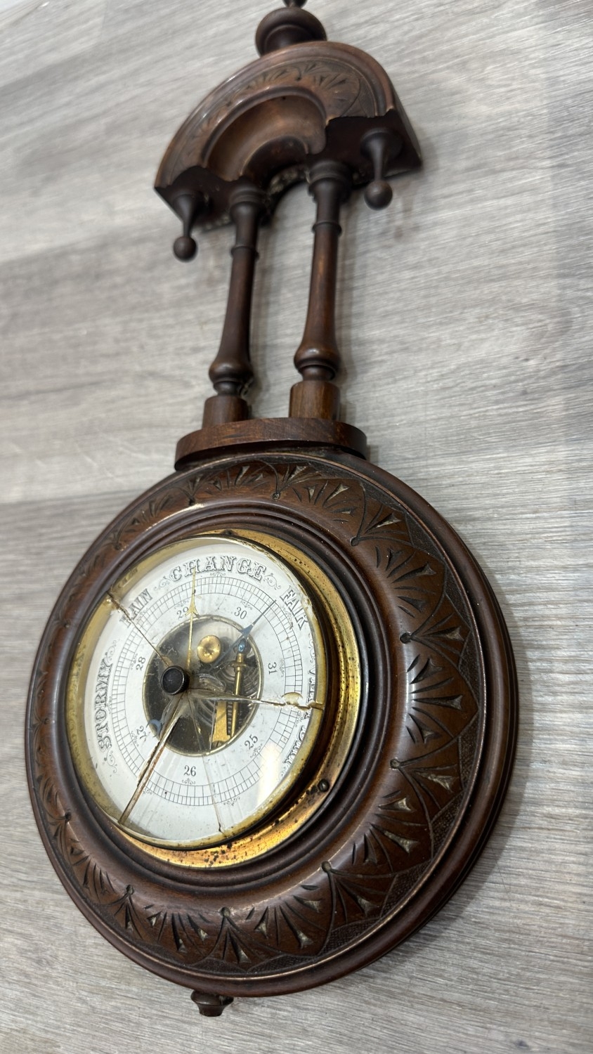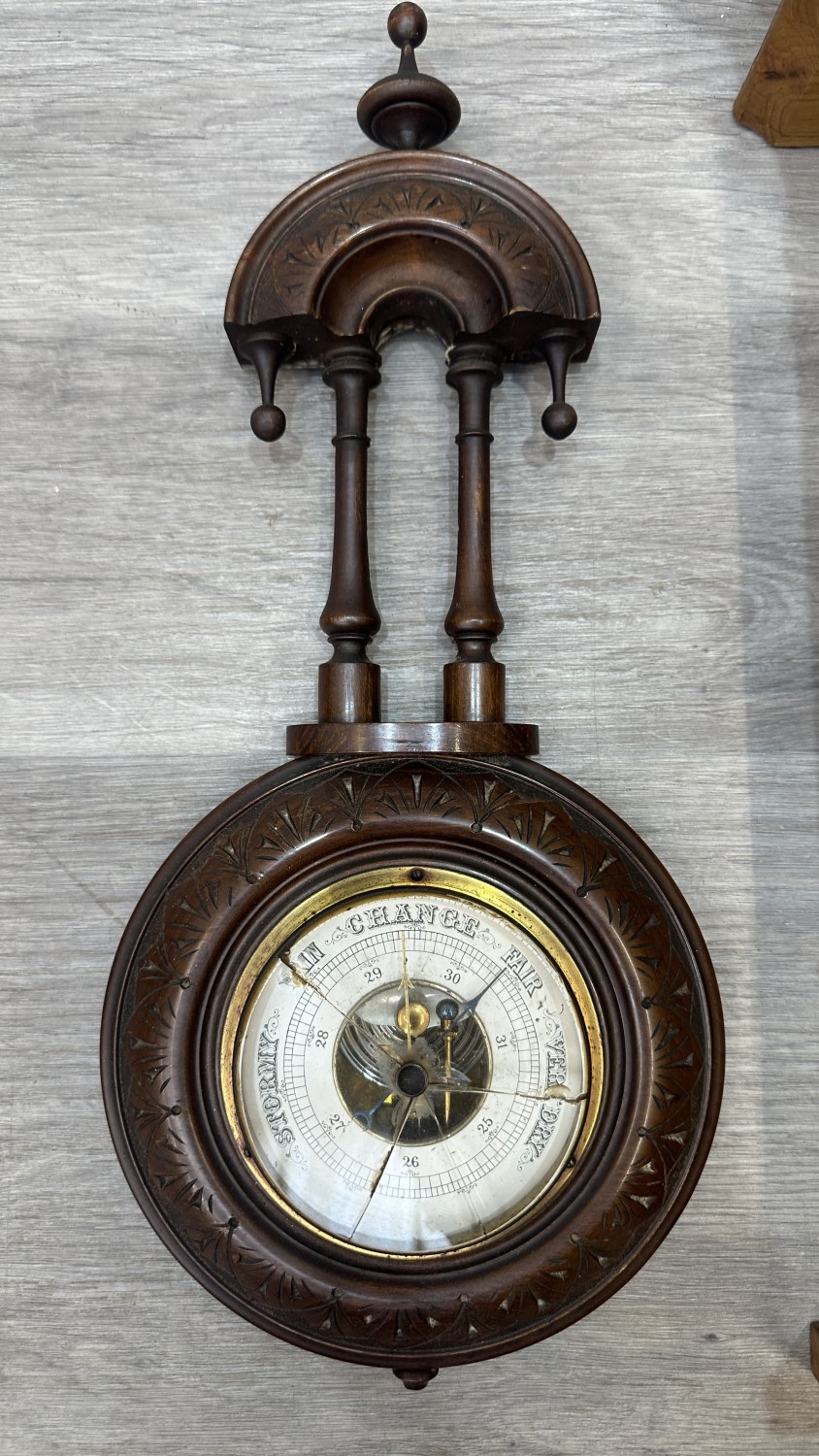 Barometer glass is cracked across multiple places, small chip is visible to bottom finial and thermometer is missing.