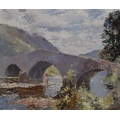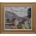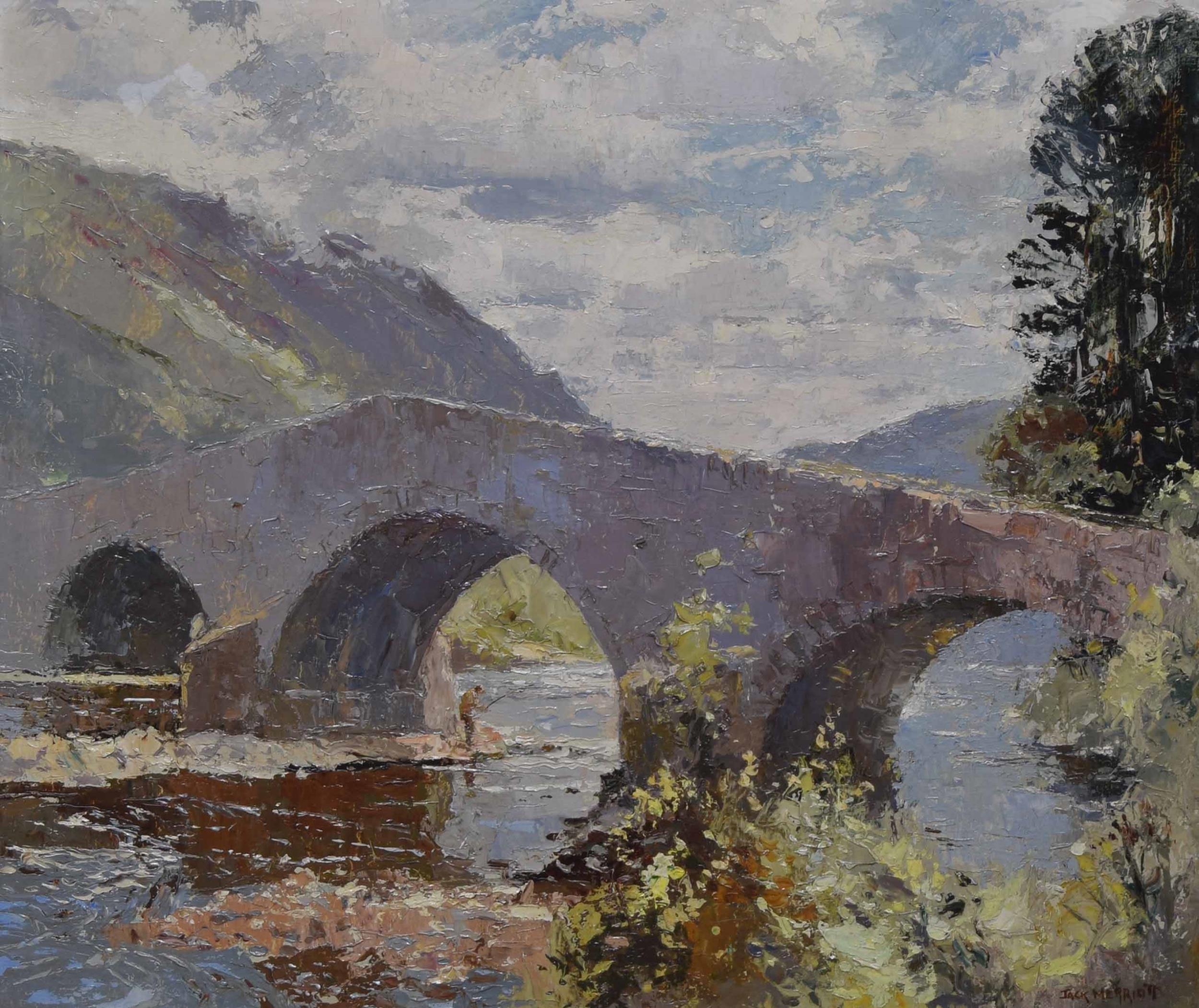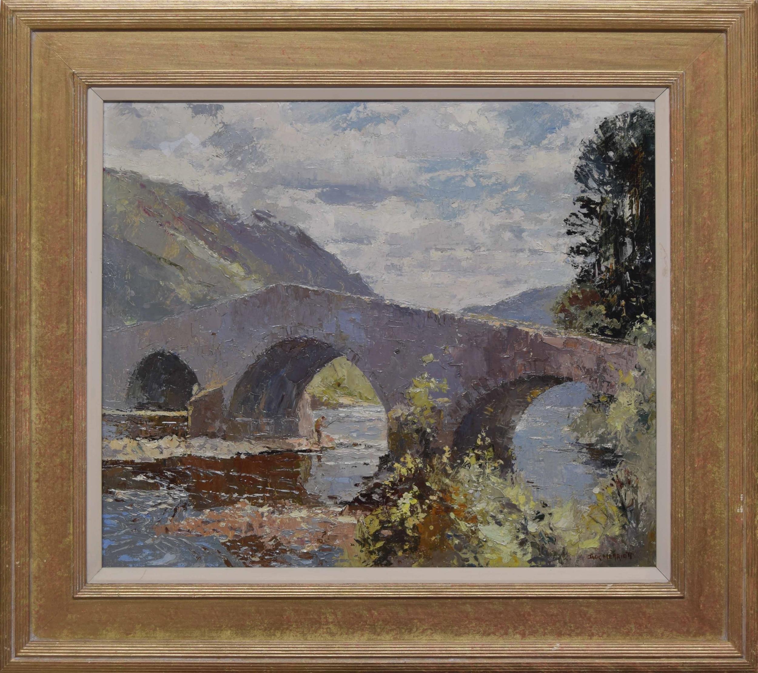 Jack Merriott RI., ROI., RSMA., RWS., (1901-1968) - Summer river landscape with an angler fishing beside a bridge, hills and trees in the distance, signed, oil on canvas, 20" x 24"