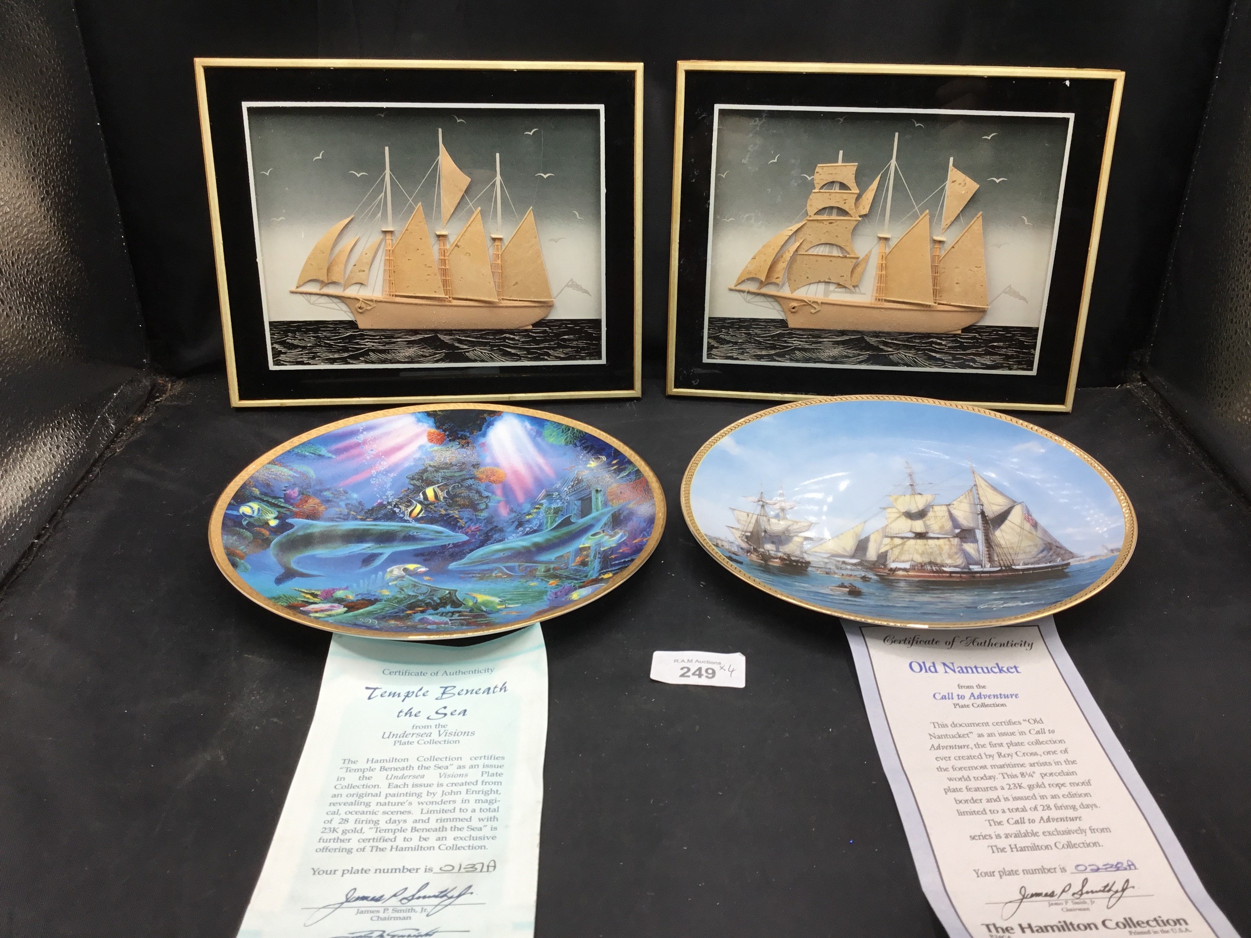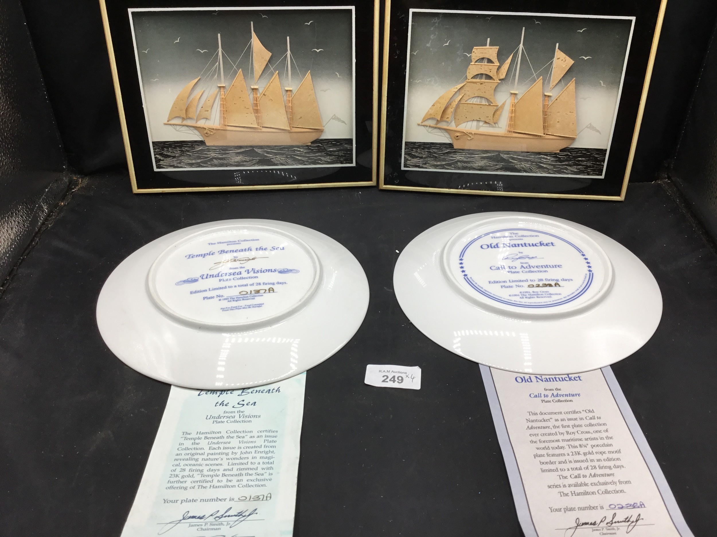 Cork Ships In a Diaroma Frame, Dolphin Plate and A Boxed Ships Plate With Certicates