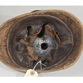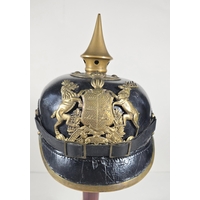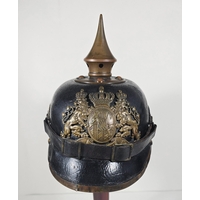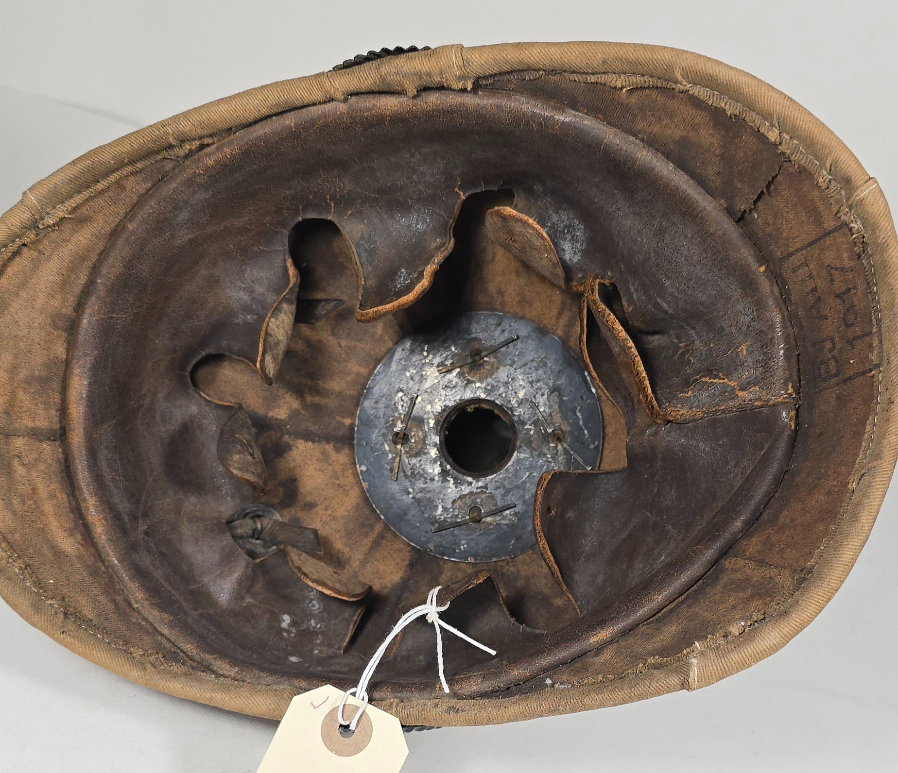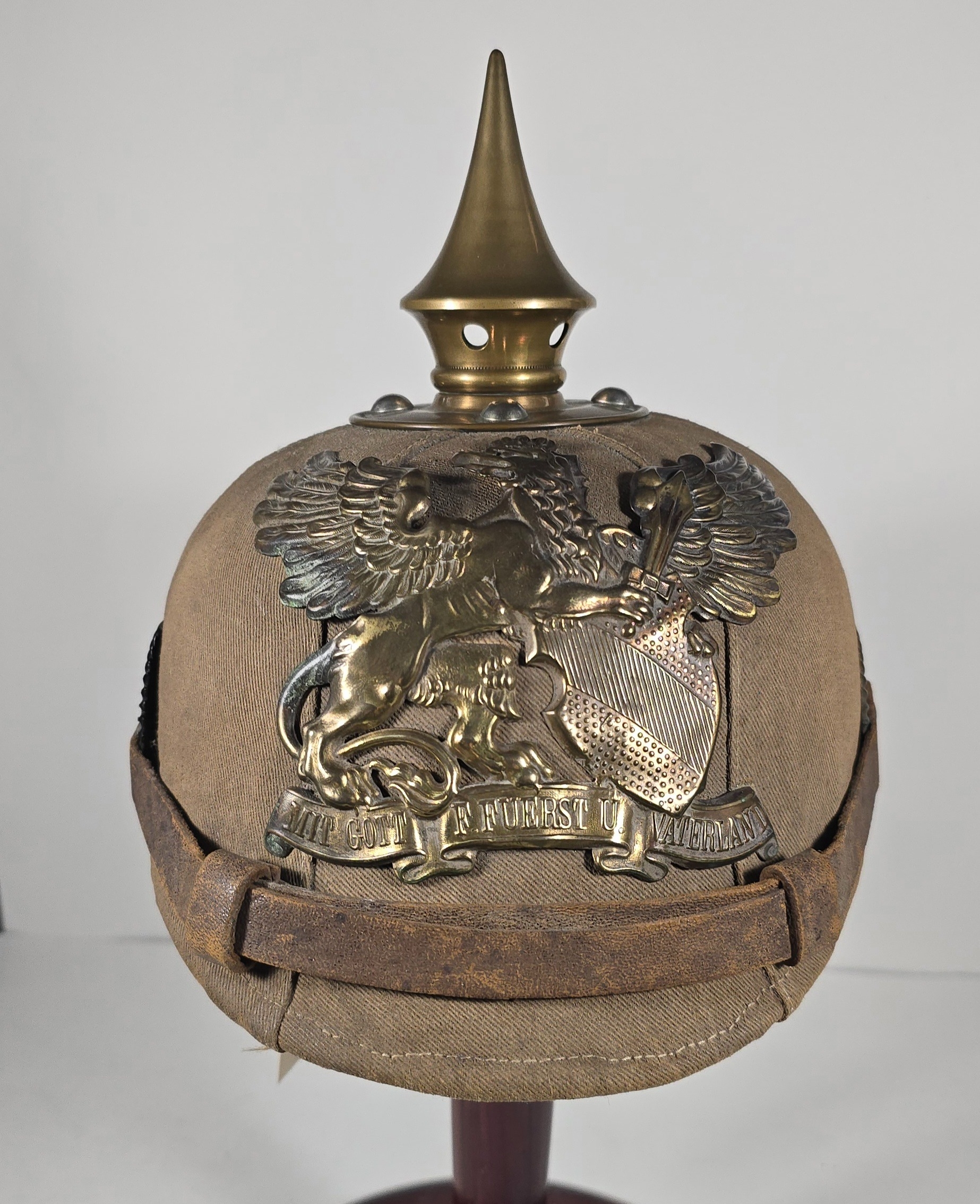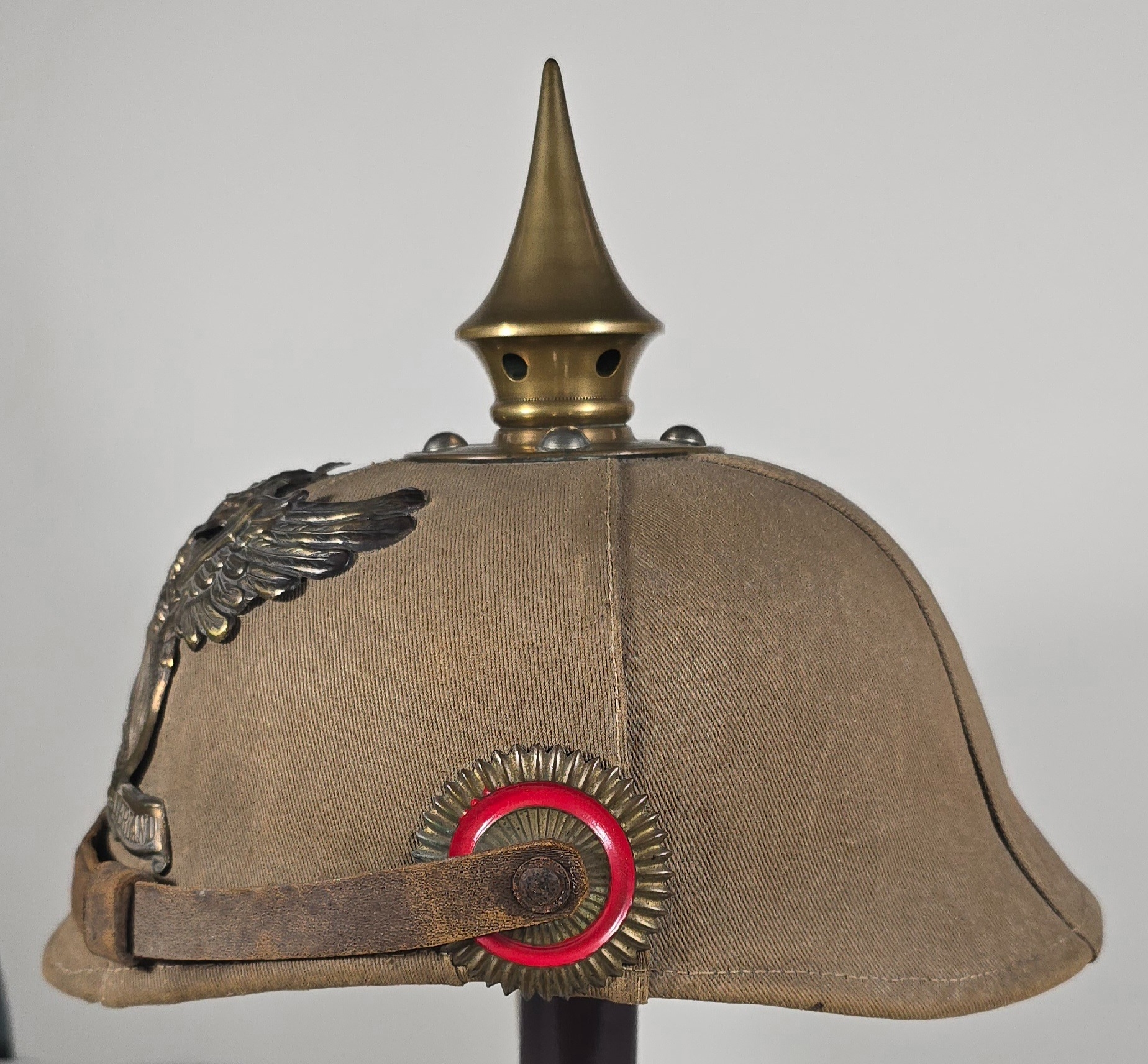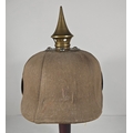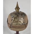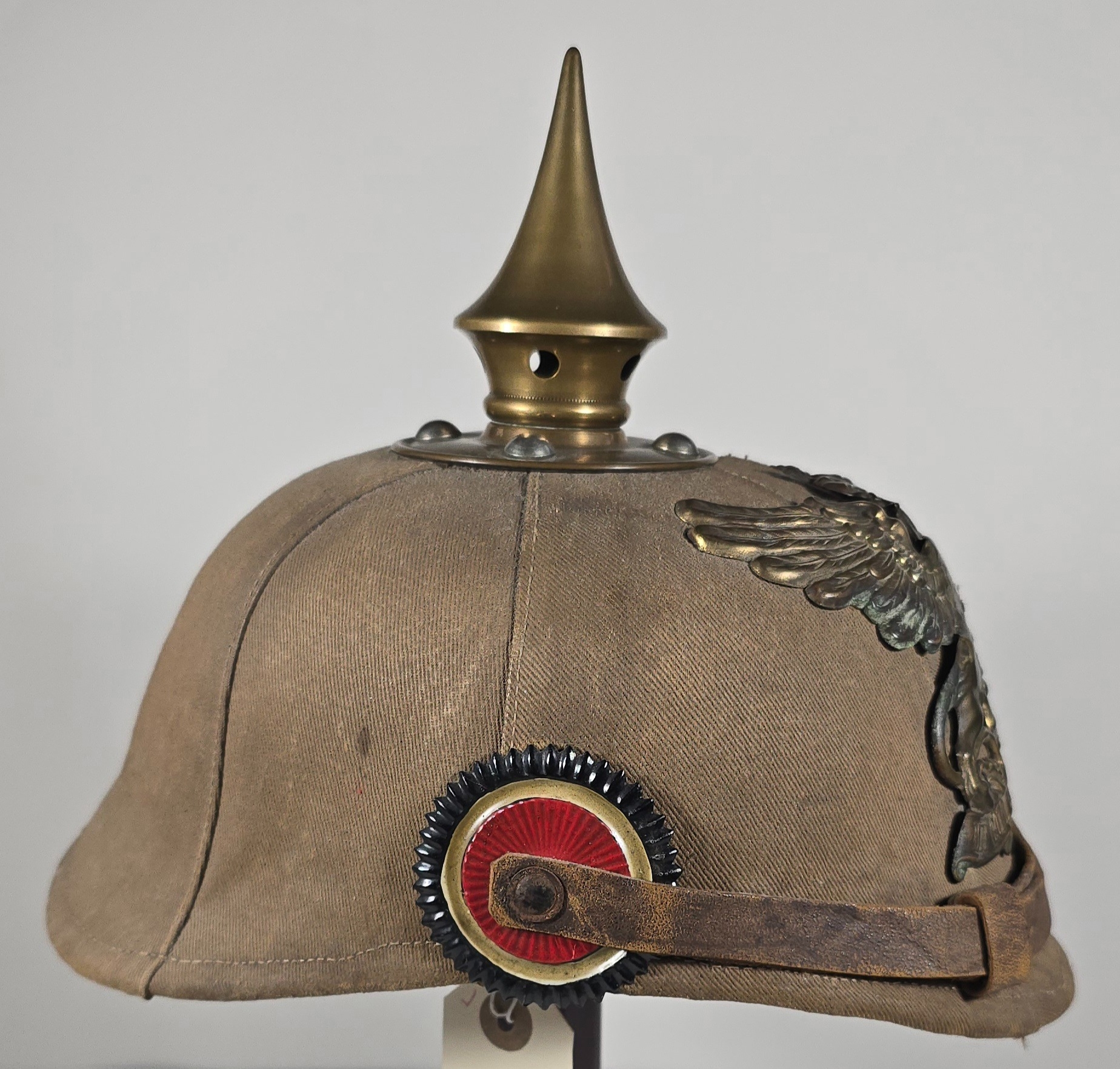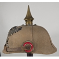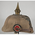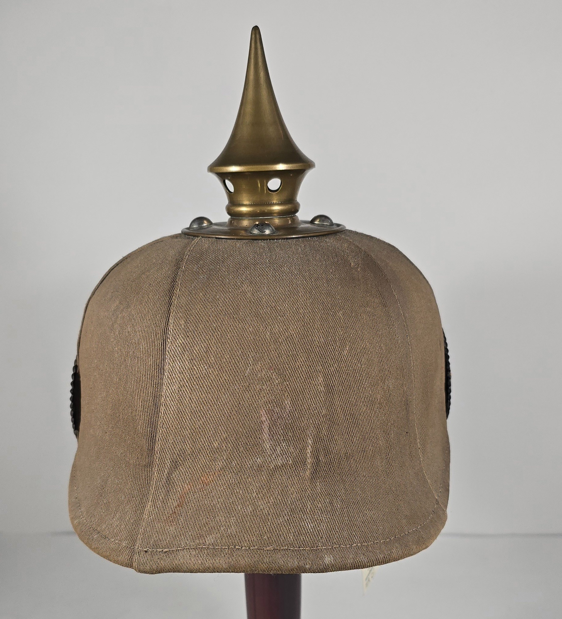 A WWI Barden tropical issue Picklehaube, with khaki cloth covered skull, brass plate and spike, national and state rosettes and leather chin strap, the rear peak marked "BJA111 1917". GC, slight wear to lining.