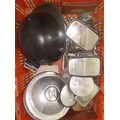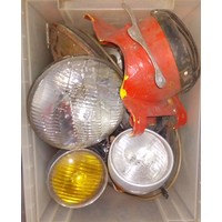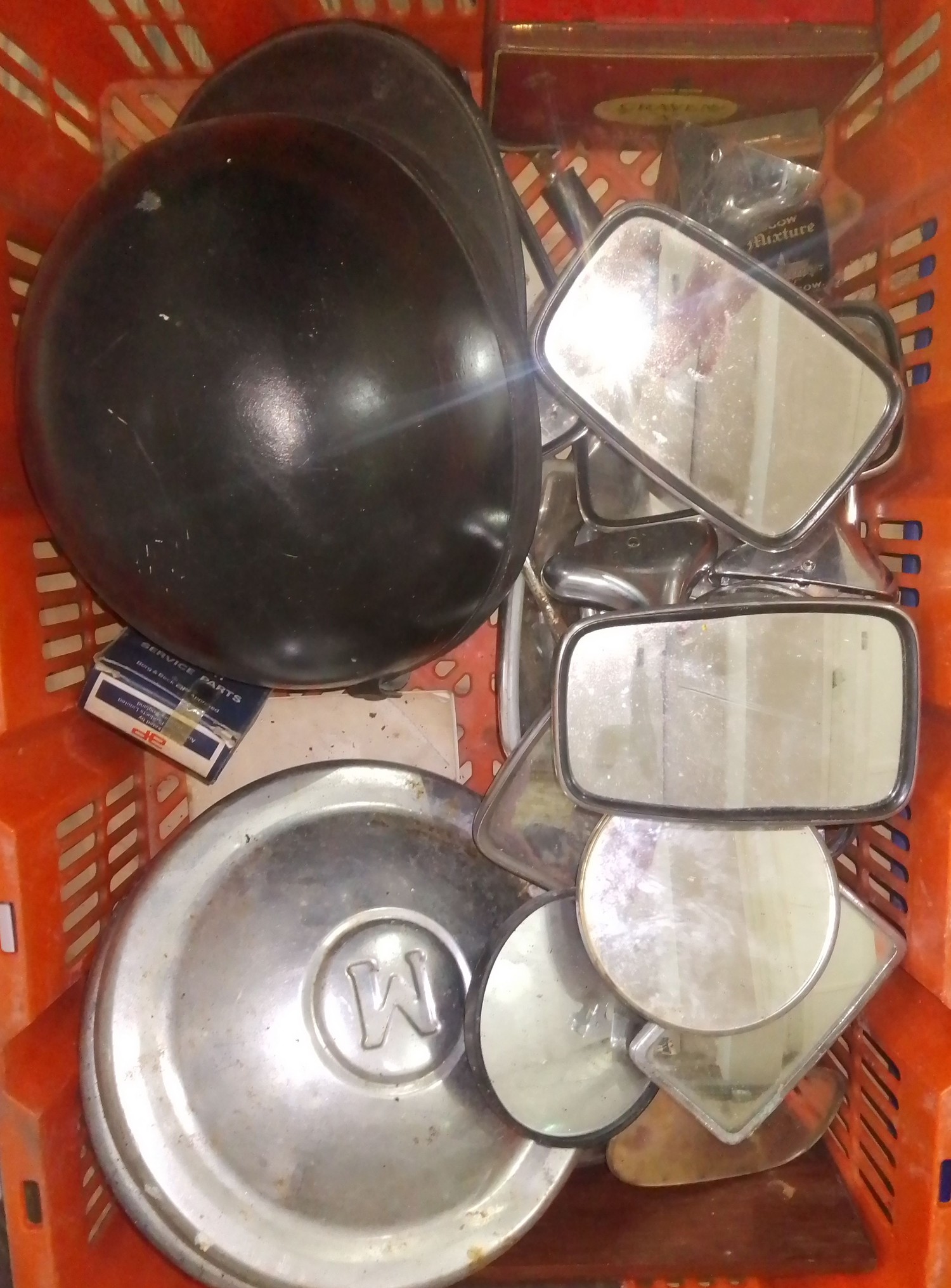 A box of mainly vintage/classic vehicles mirrors, also including a motorcycle helmet and some hub caps.