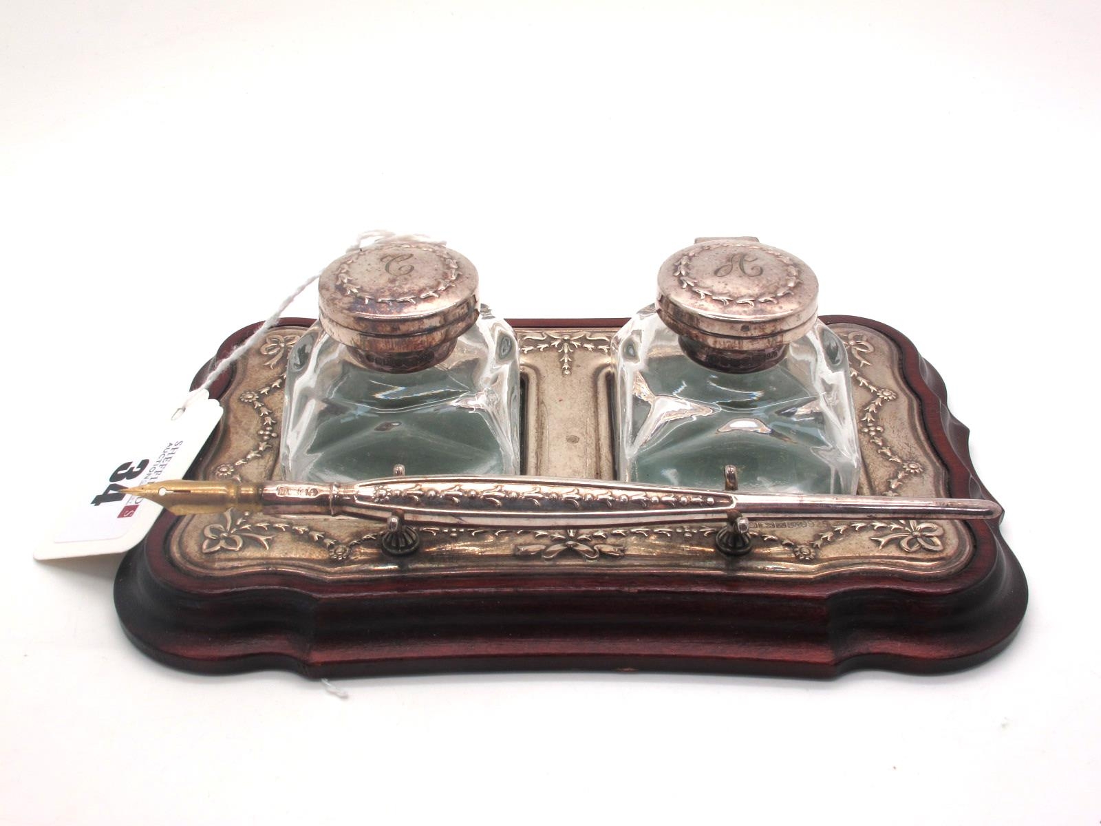 A Decorative Matched Hallmarked Silver Mounted Modern Desk Stand, RC (Carrs), Sheffield 1994, 1997, 1998, of Edwardian style detailed in relief with ribbon tied swags, the hinged lids initialled "C" and "H", wooden stand approximately 17.3cm wide.