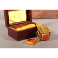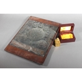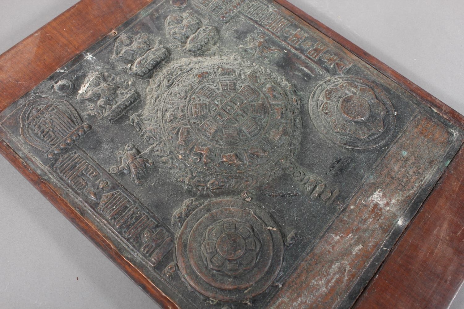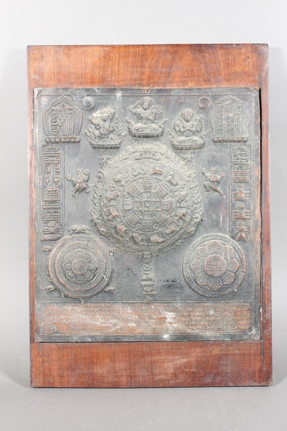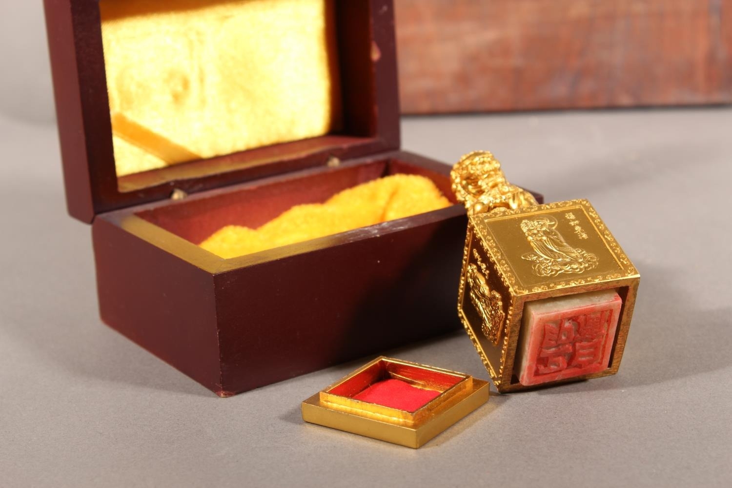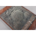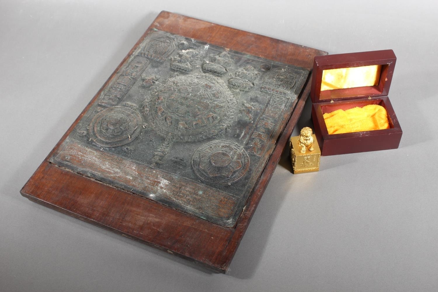 Repoussé hand beaten Thai panel depicting figures and an oriental reproduction seal in case.