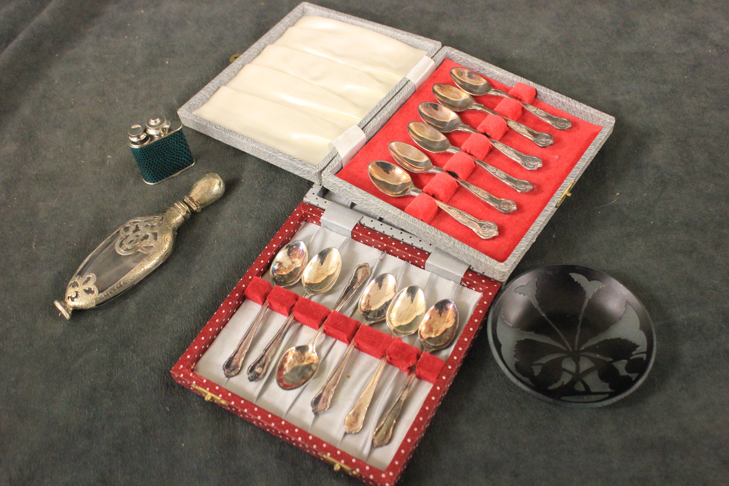 A continental glass scent bottle, with decorative silver-plated mount and cover, 12cm long, a small frosted and acid etched glass pin tray, two boxed sets of silver-plated teaspoons, and a Swiss made 'Splendor' perfume atomiser, scent bottle a.f. (5).