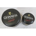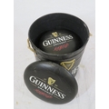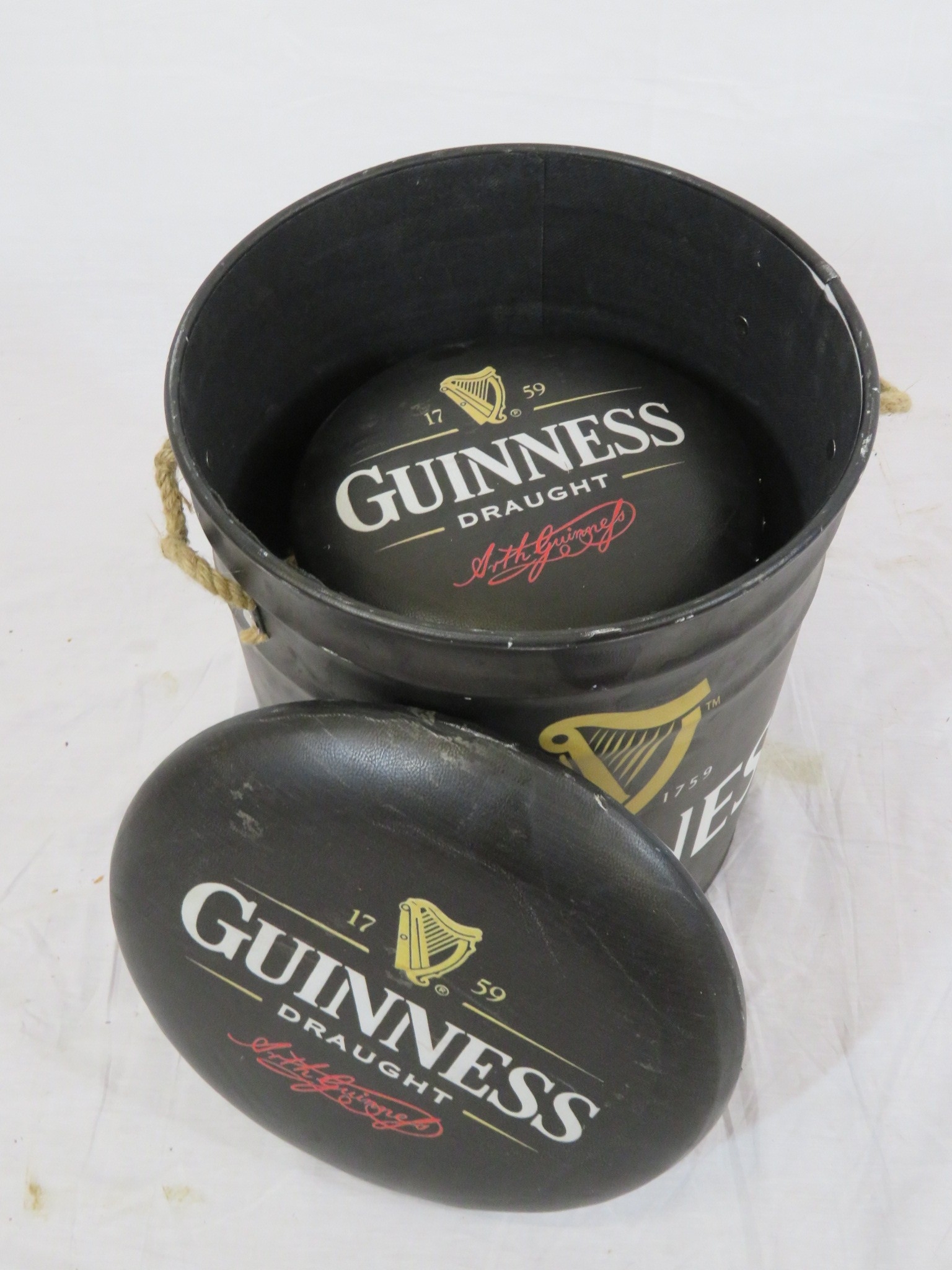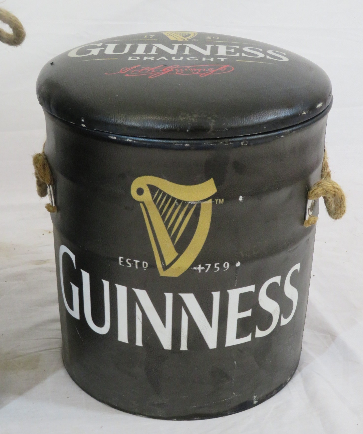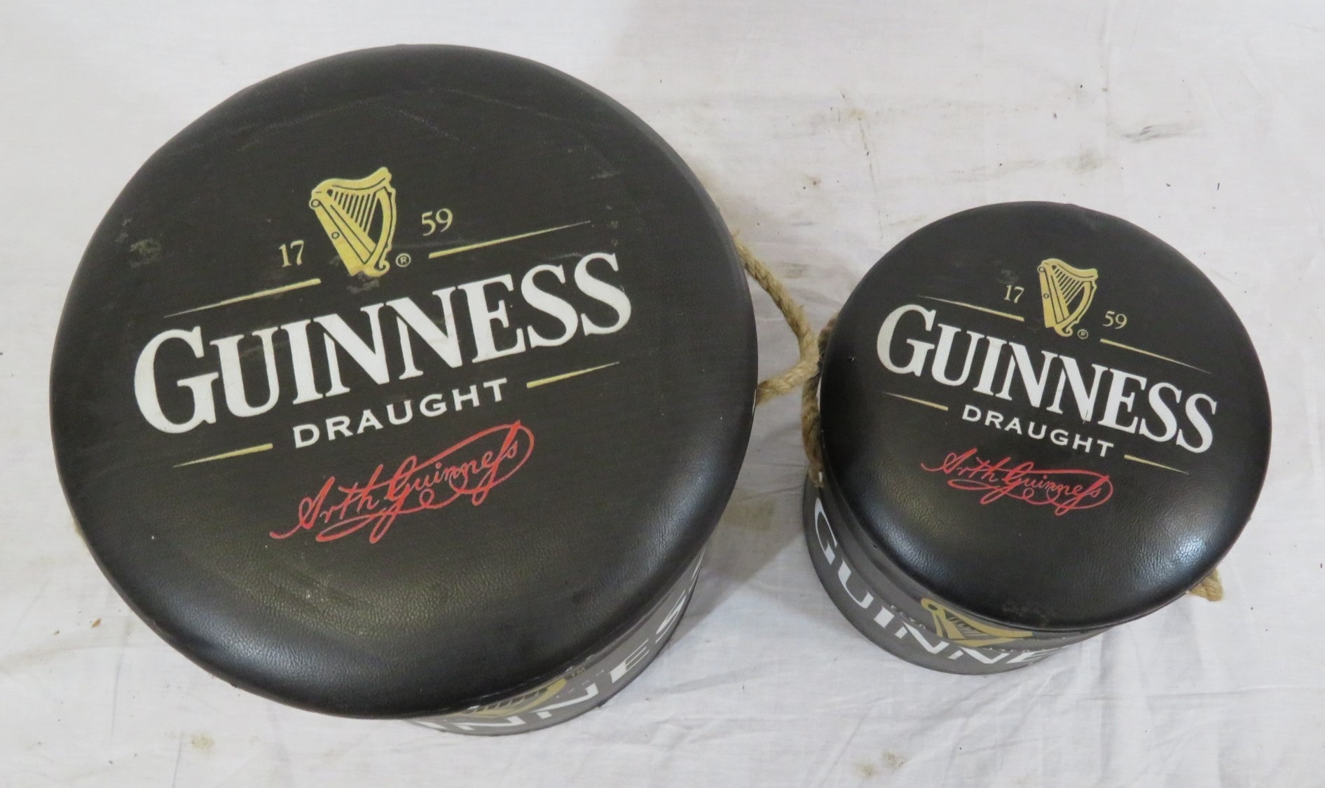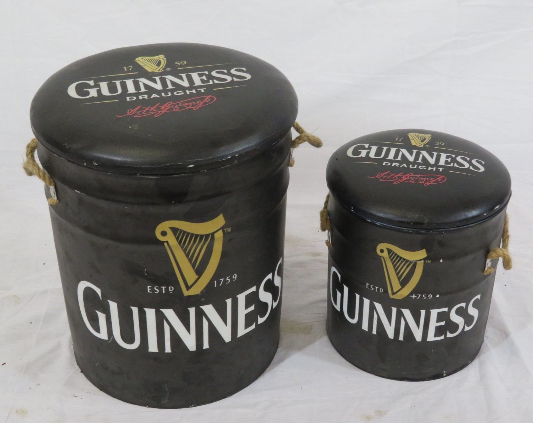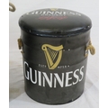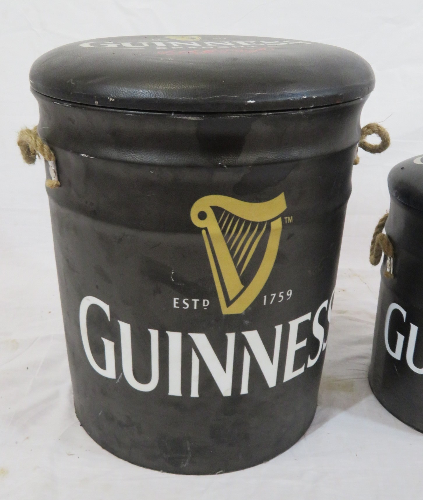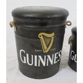 Two Guinness barrel shaped pub stools or pails with cushioned tops