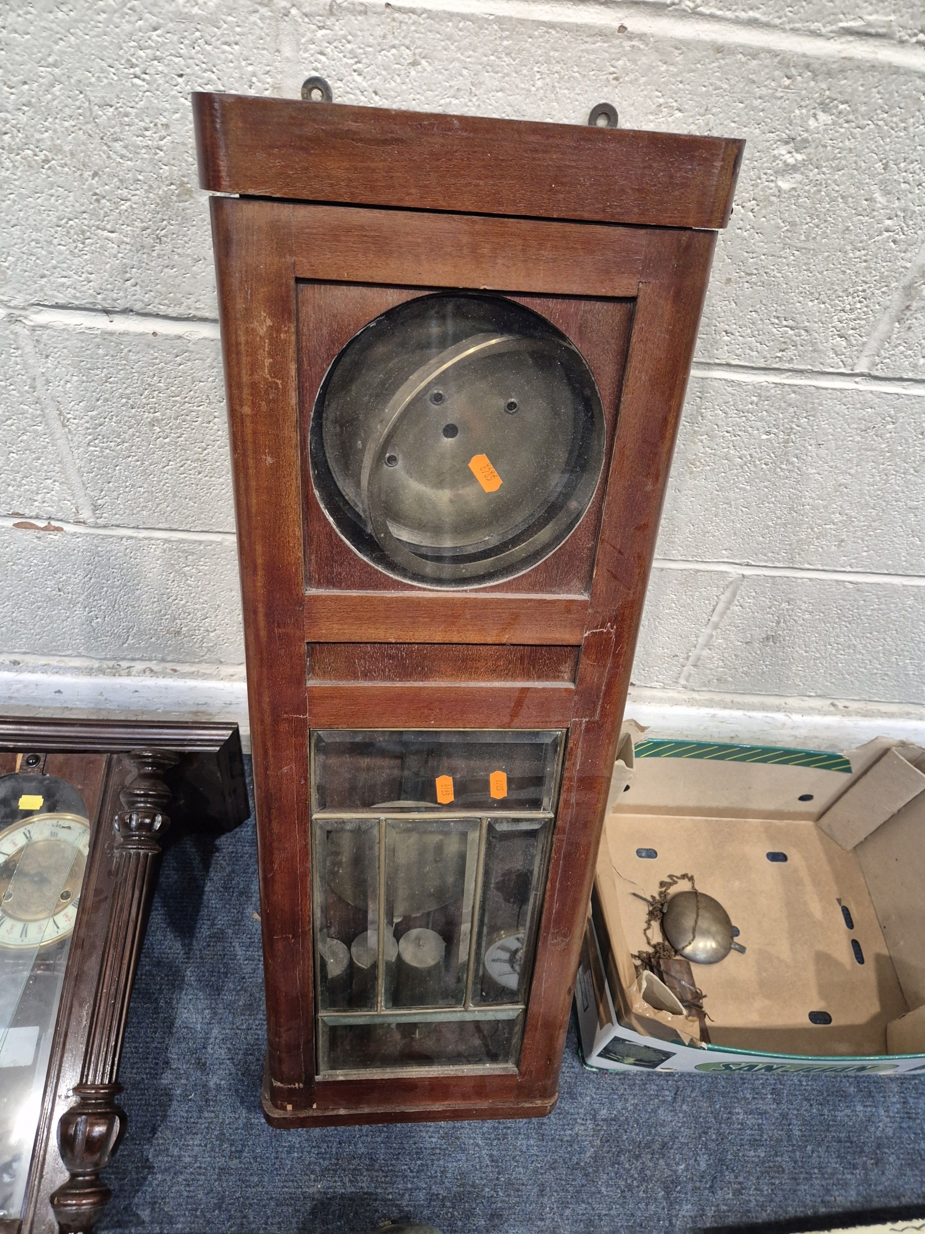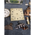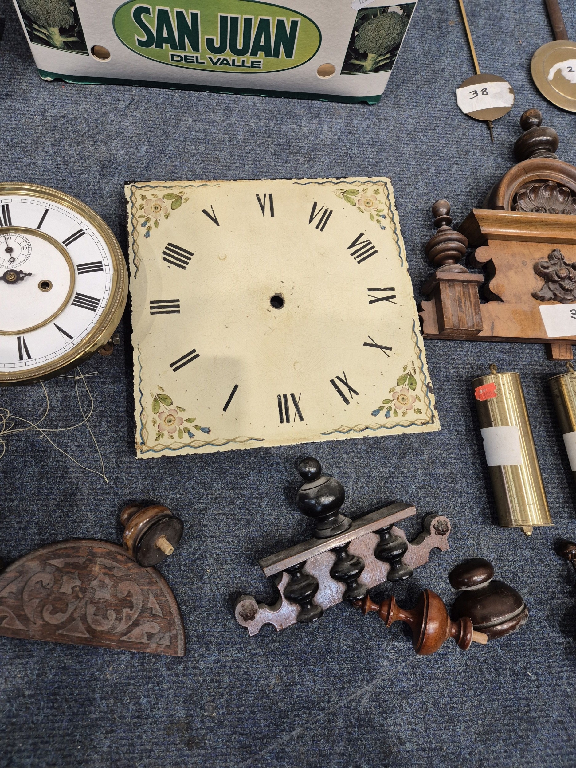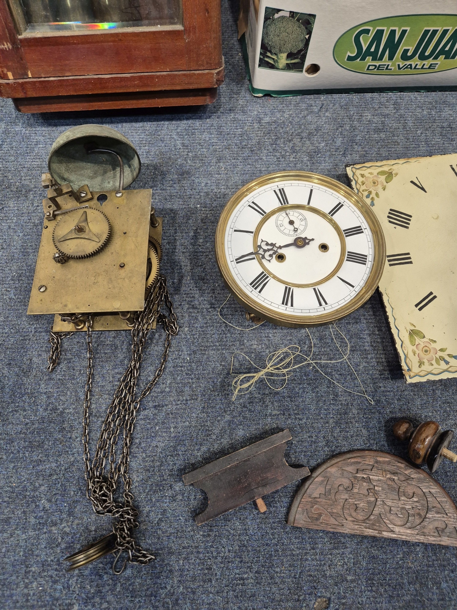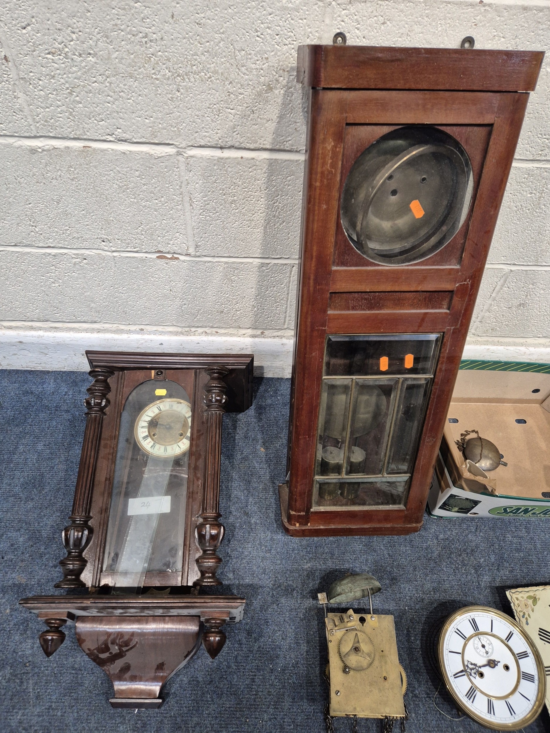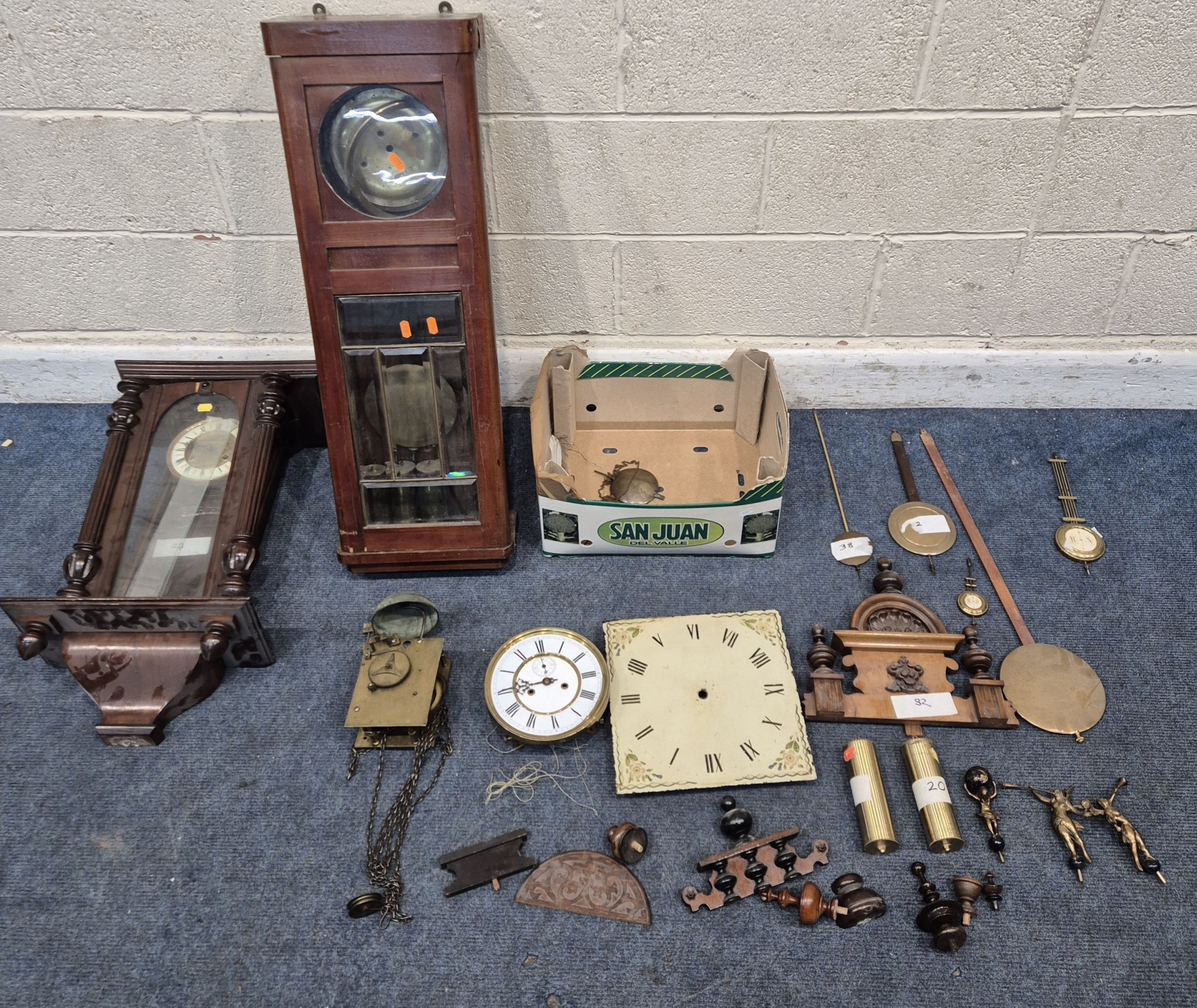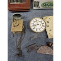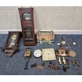 TWO DISTRESSED CLOCKS, along with a large quantity of clock accessories, condition report: marks, scuffs, losses, other wear and tear (2 + box)