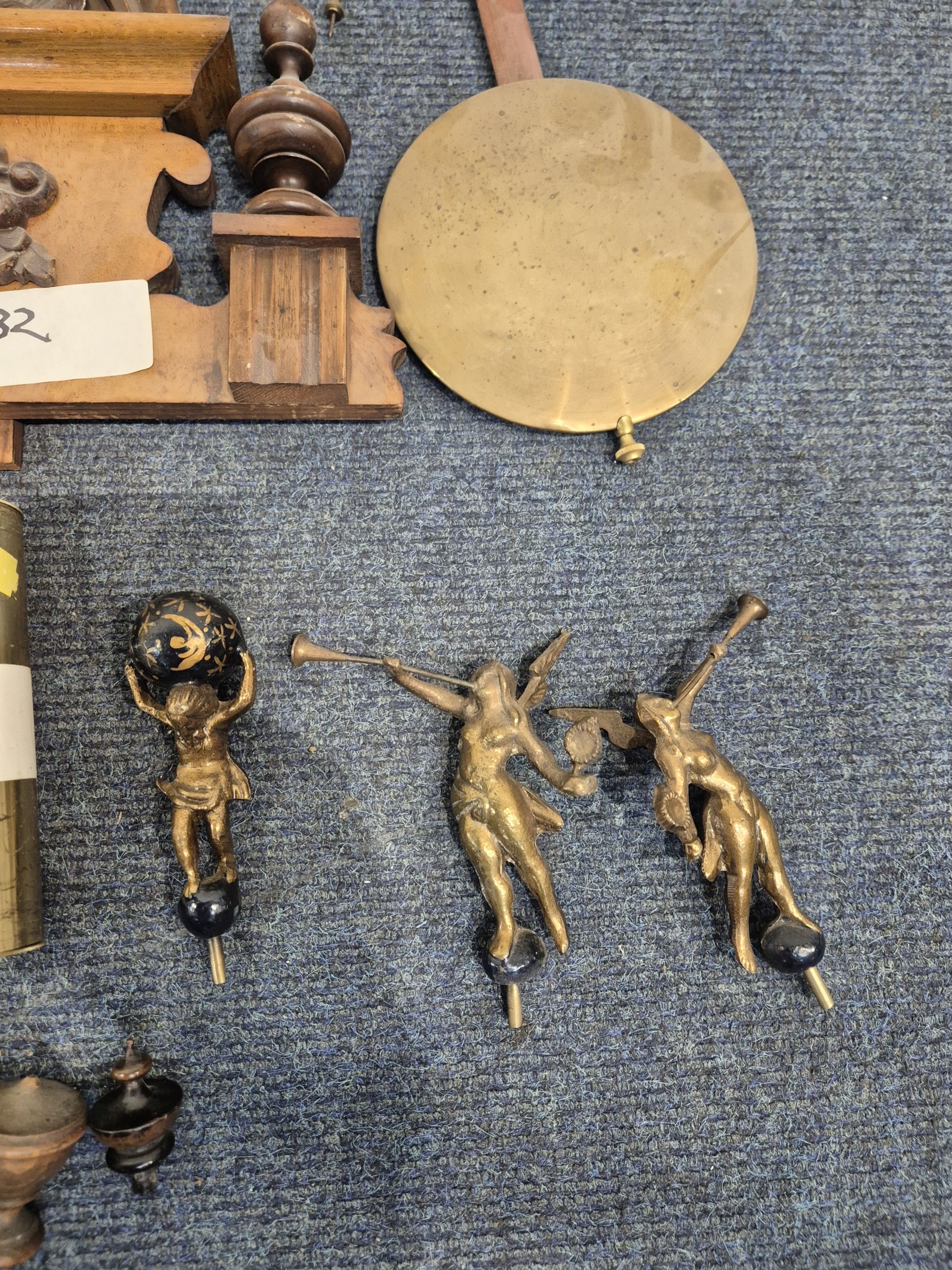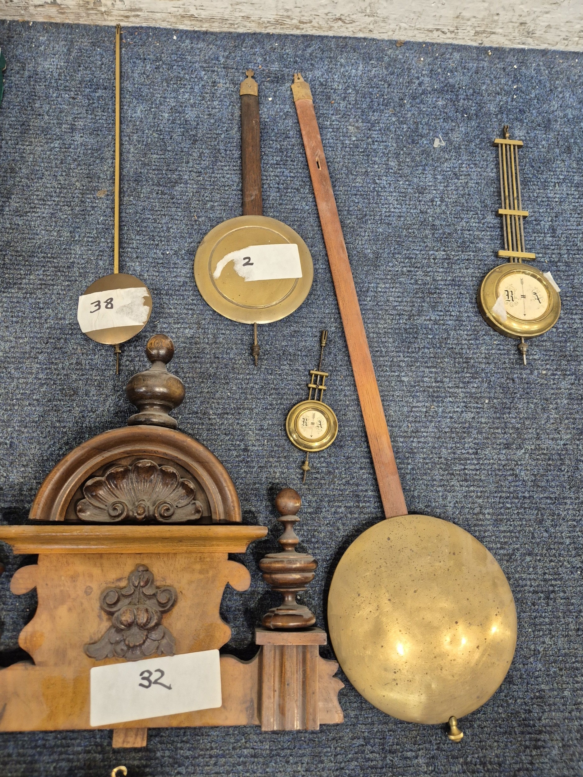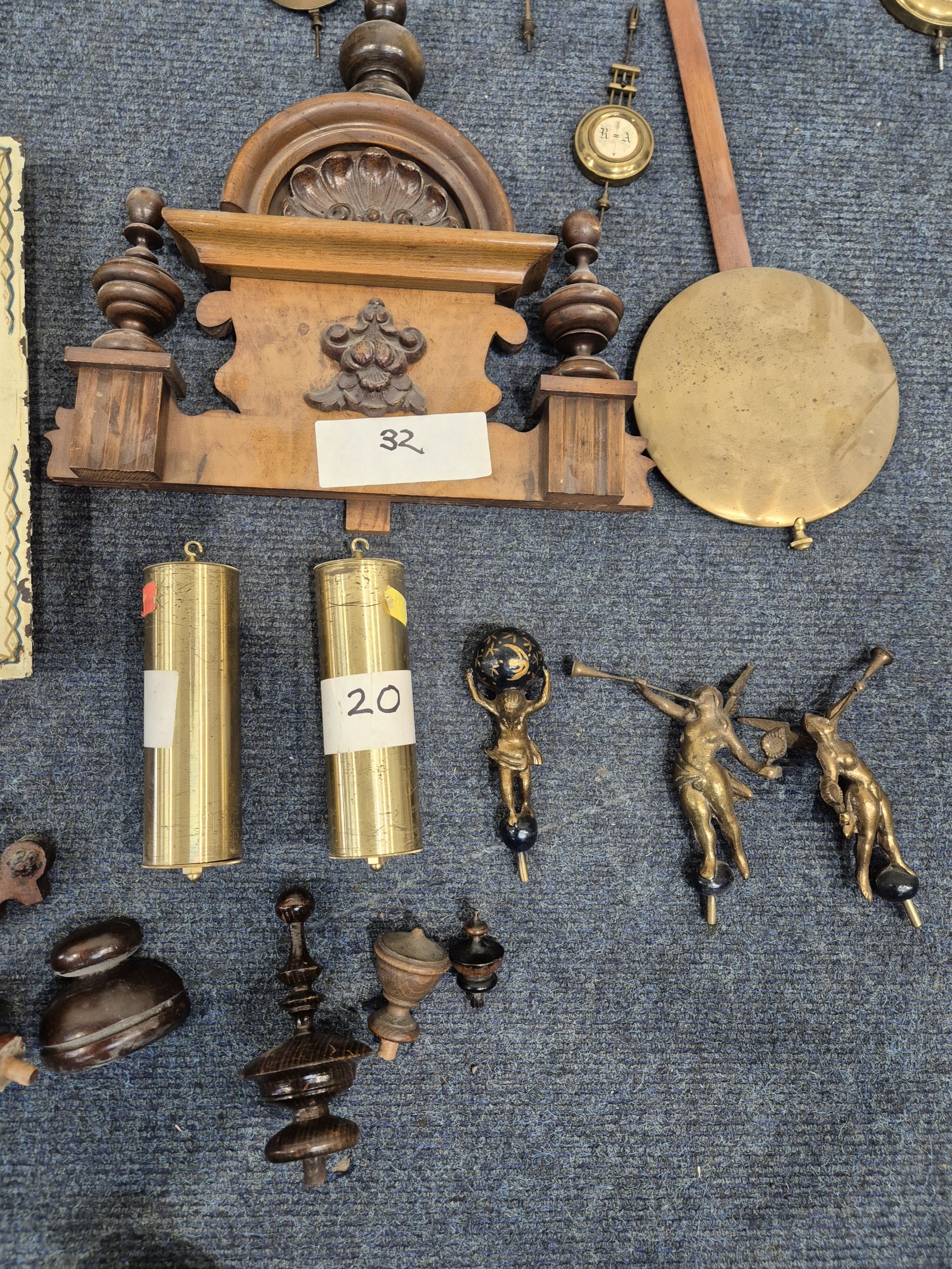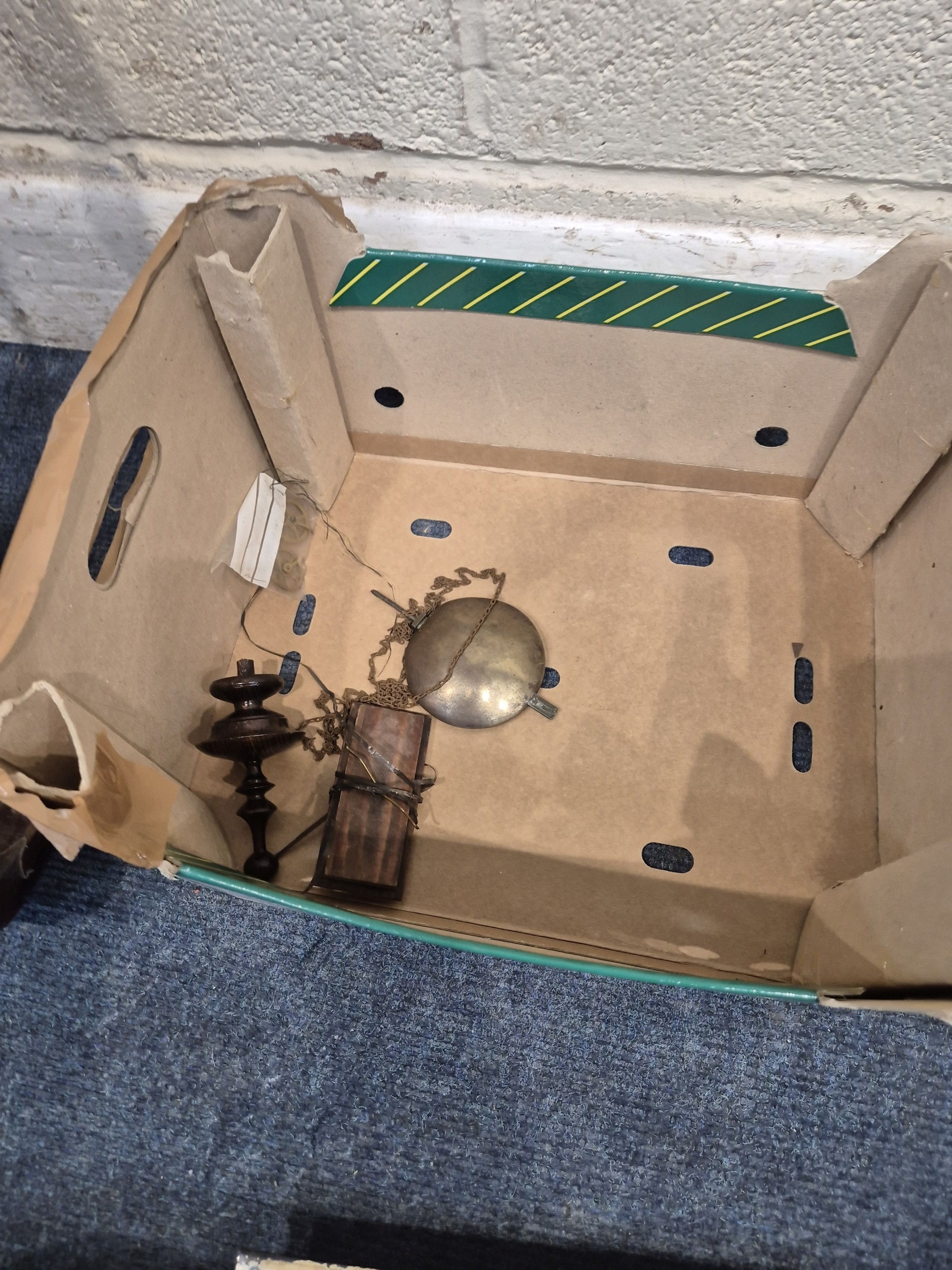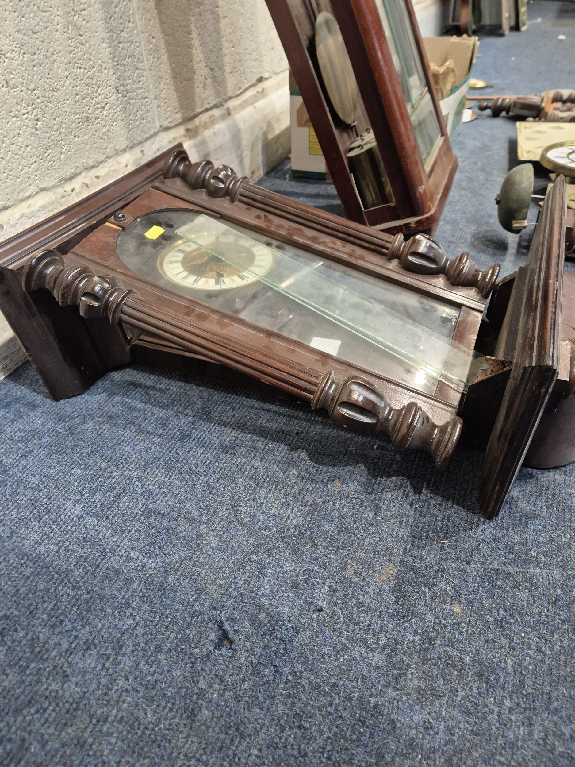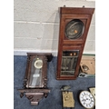 TWO DISTRESSED CLOCKS, along with a large quantity of clock accessories, condition report: marks, scuffs, losses, other wear and tear (2 + box)