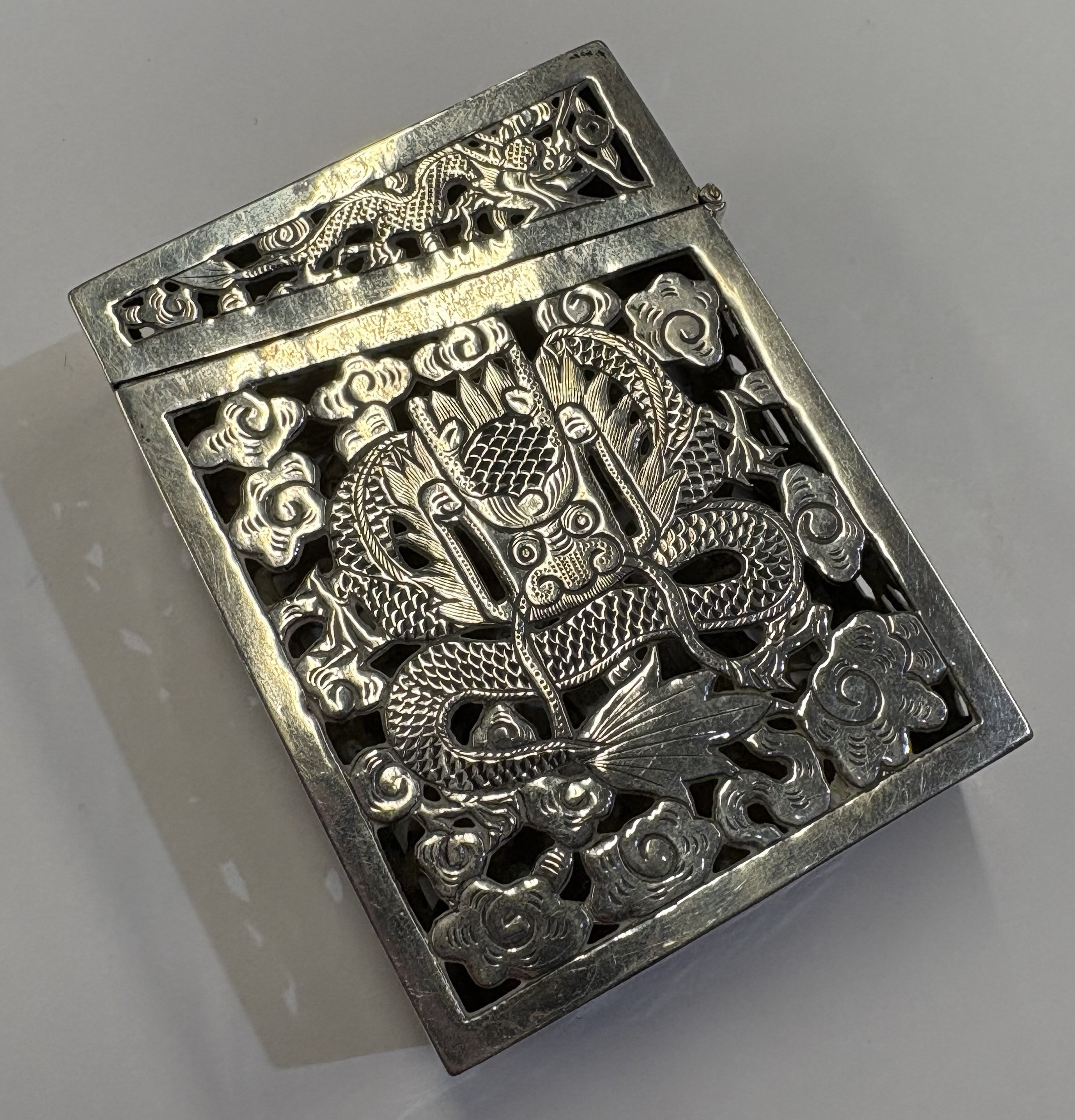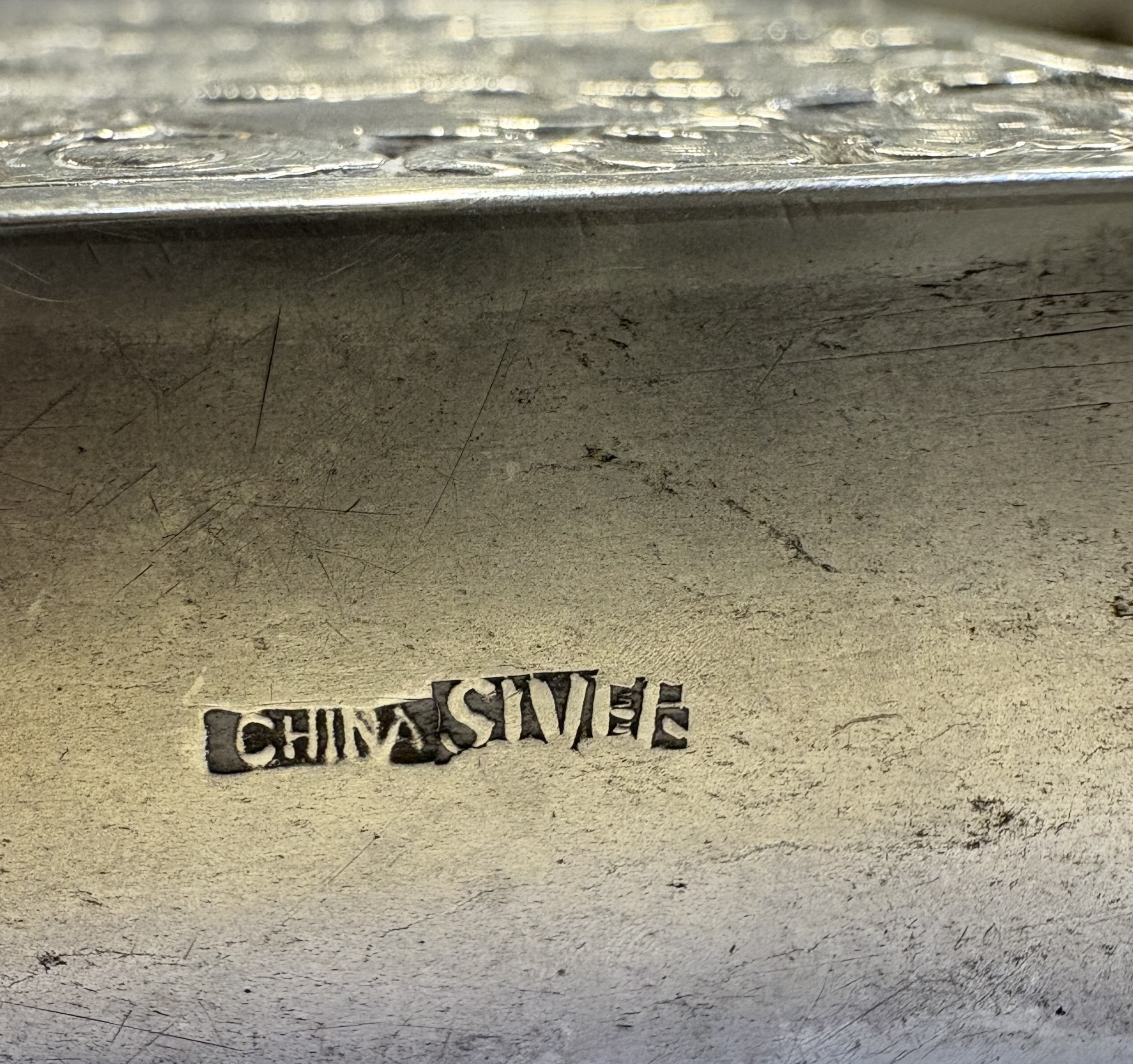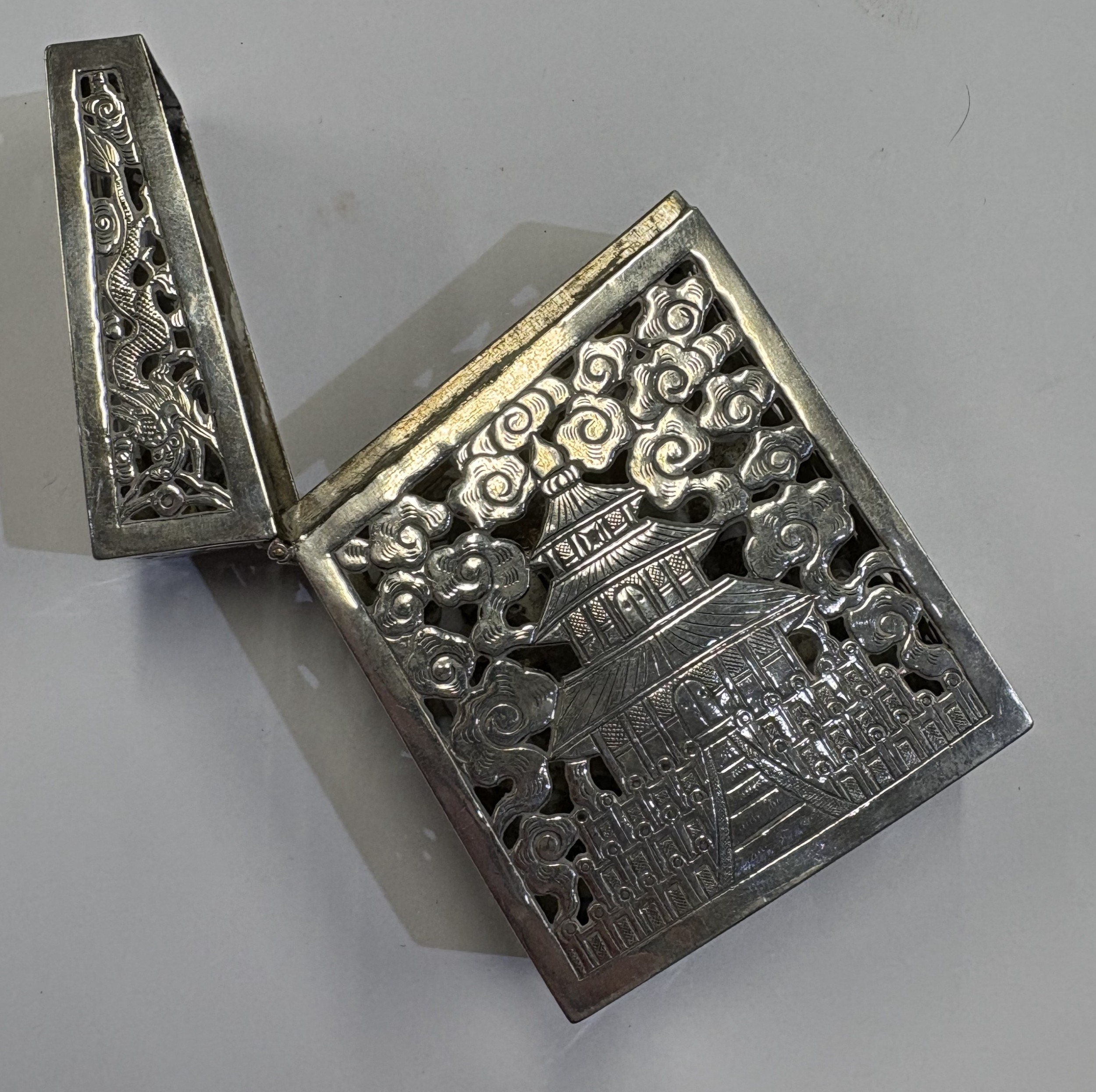A rare Chinese export silver cigarette case chased with figural and temple decoration. Signed to reverse. Circa 1900. Approx. 72 grams. Est. £200 - £300.