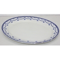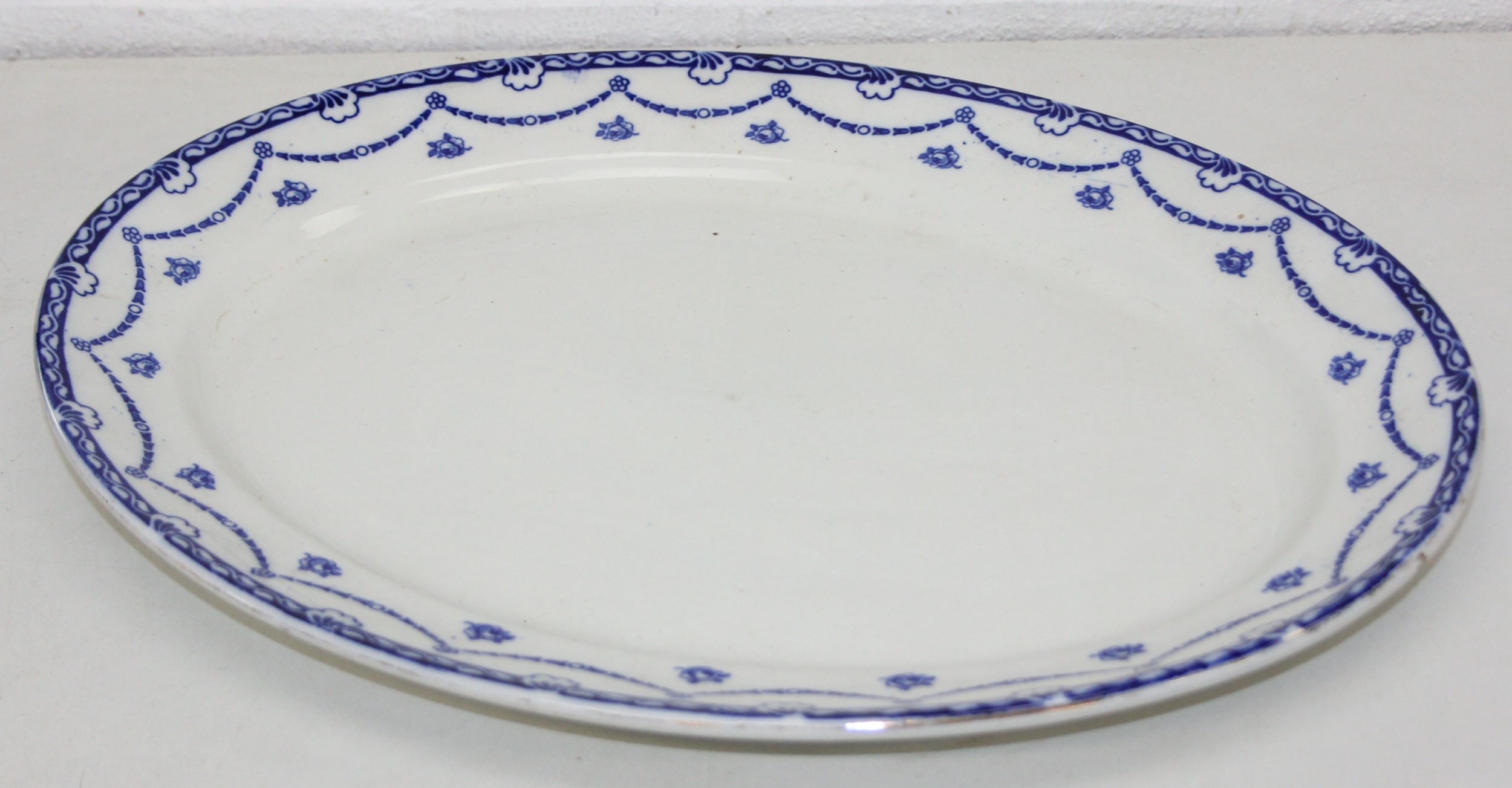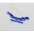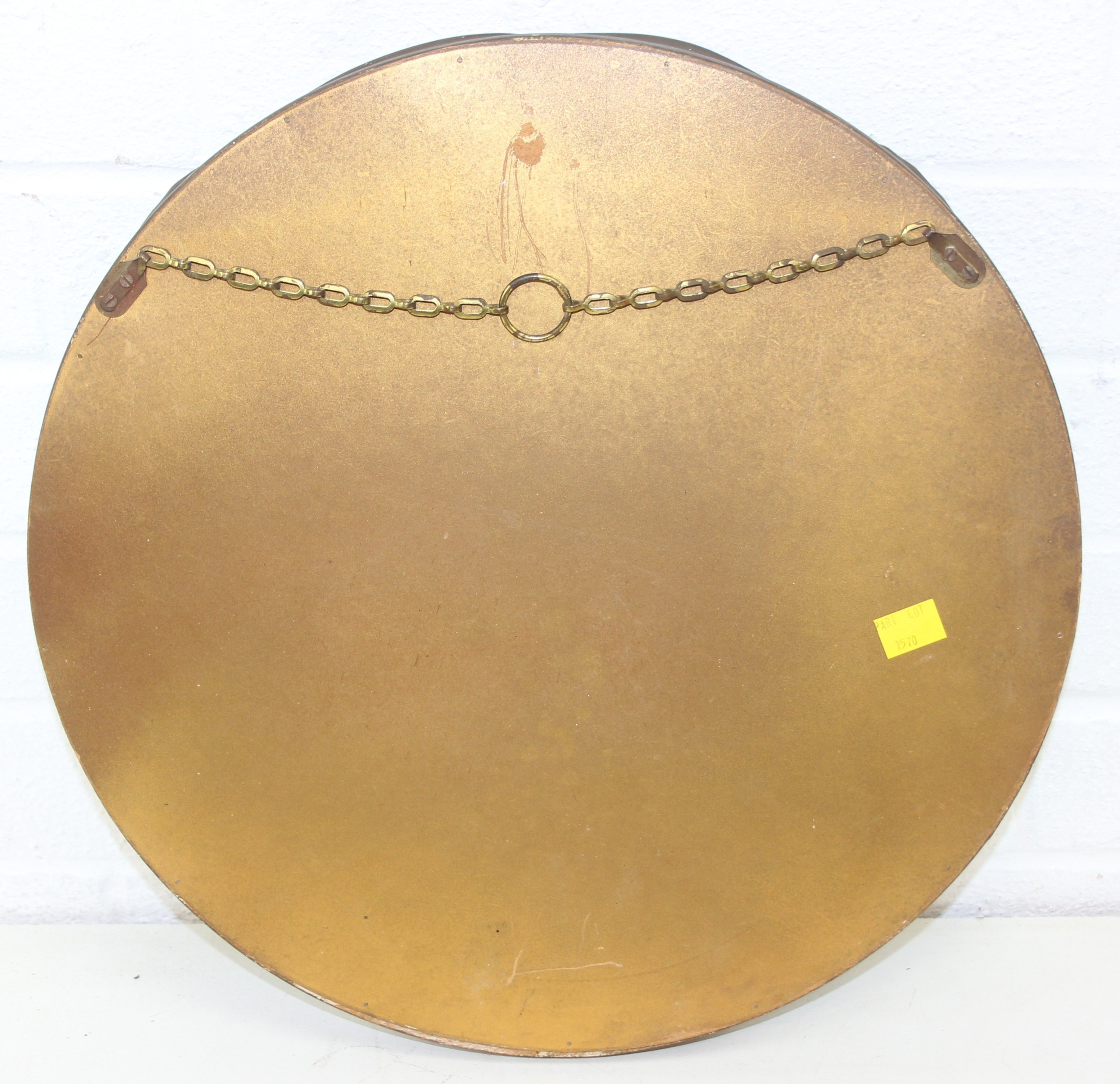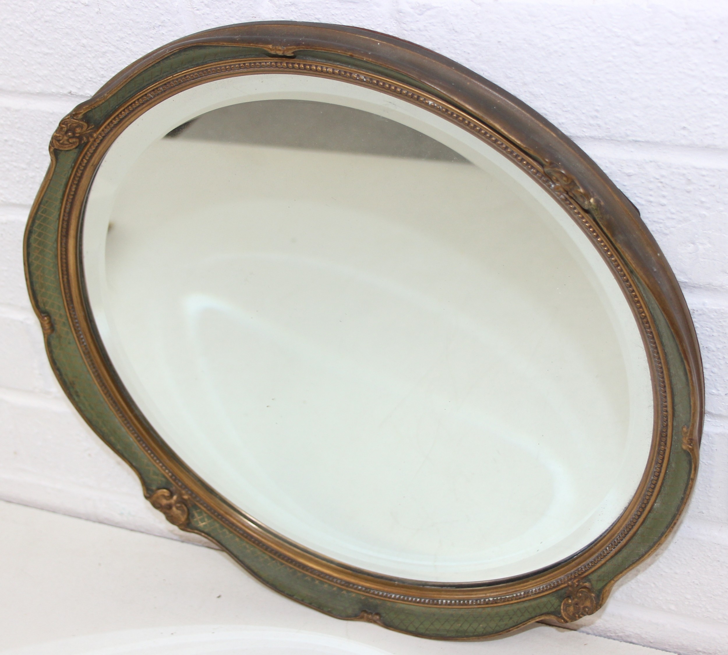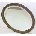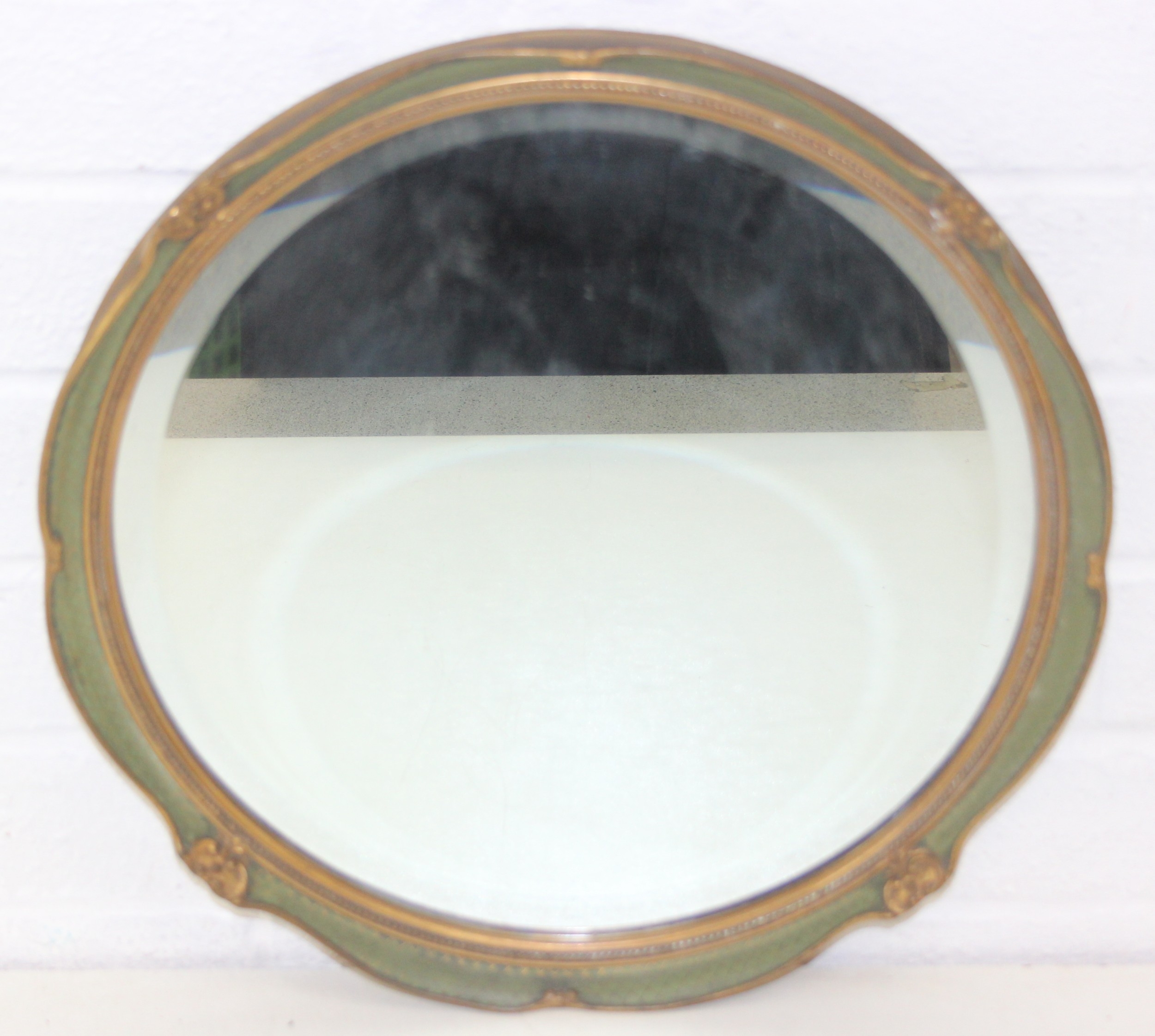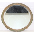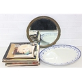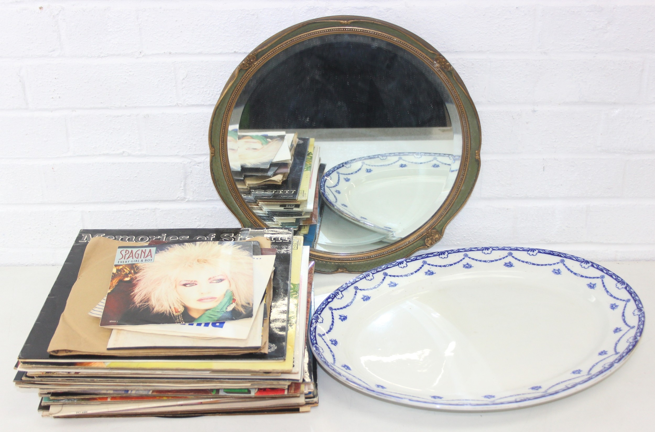 Vintage round bevelled edge mirror in fancy gilt and green frame an antique blue and white meat plate with indistinct makers stamp to base and Various records, mostly 12" vinyl LPs to include ABBA, Rick Wakeman, the mirror 40cm diameter
