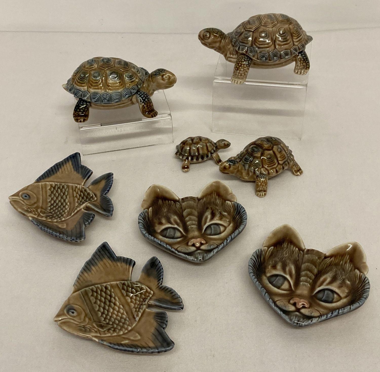 A collection of vintage Wade ceramics. 4 tortoise figures and lidded trinket boxes. Together with 2 cat pin dishes and 2 fish pin dishes by Wade.