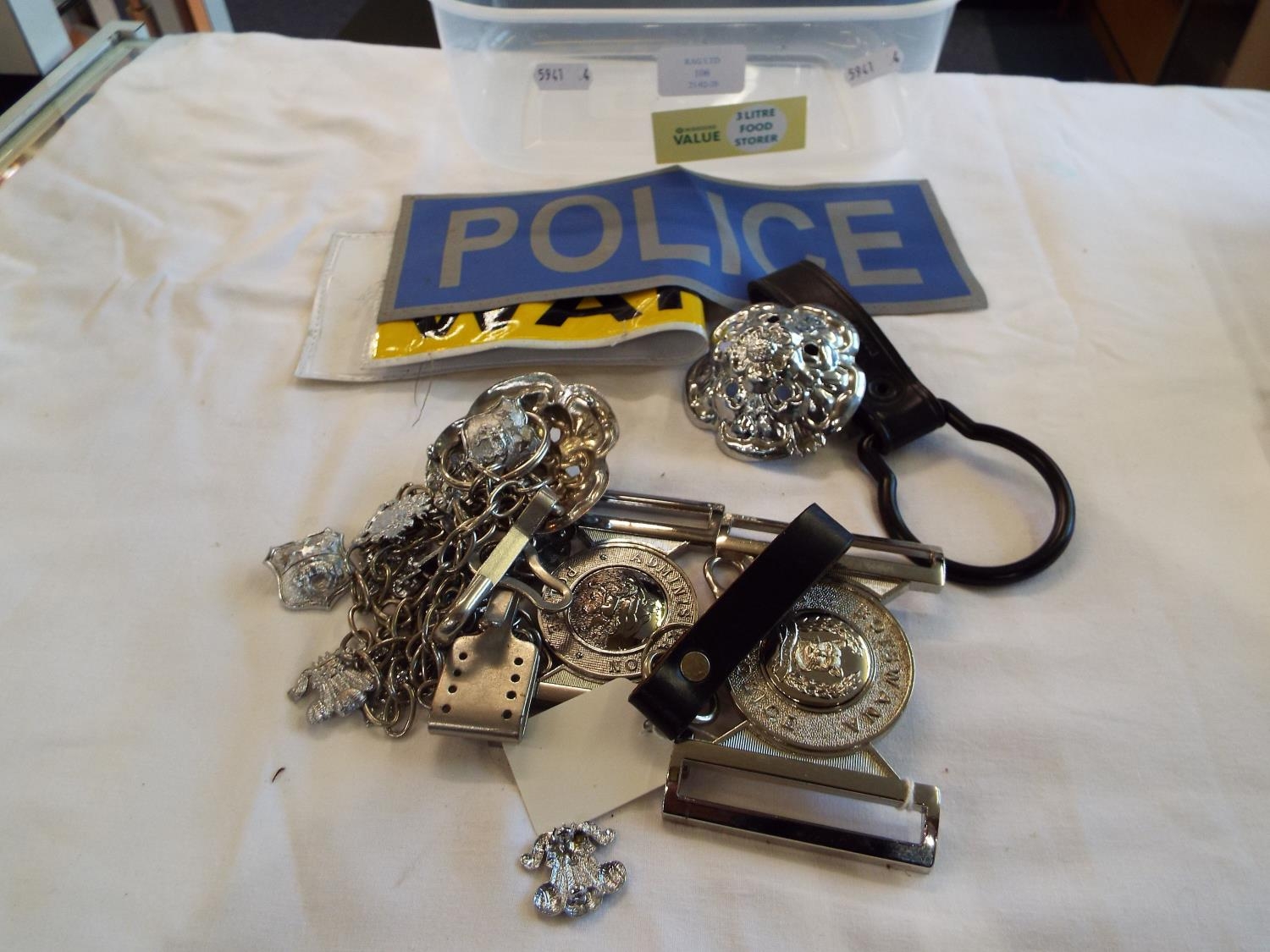 A mixed selection of police ephemera to include buckles, chain, badges, helmet top, armbands etc