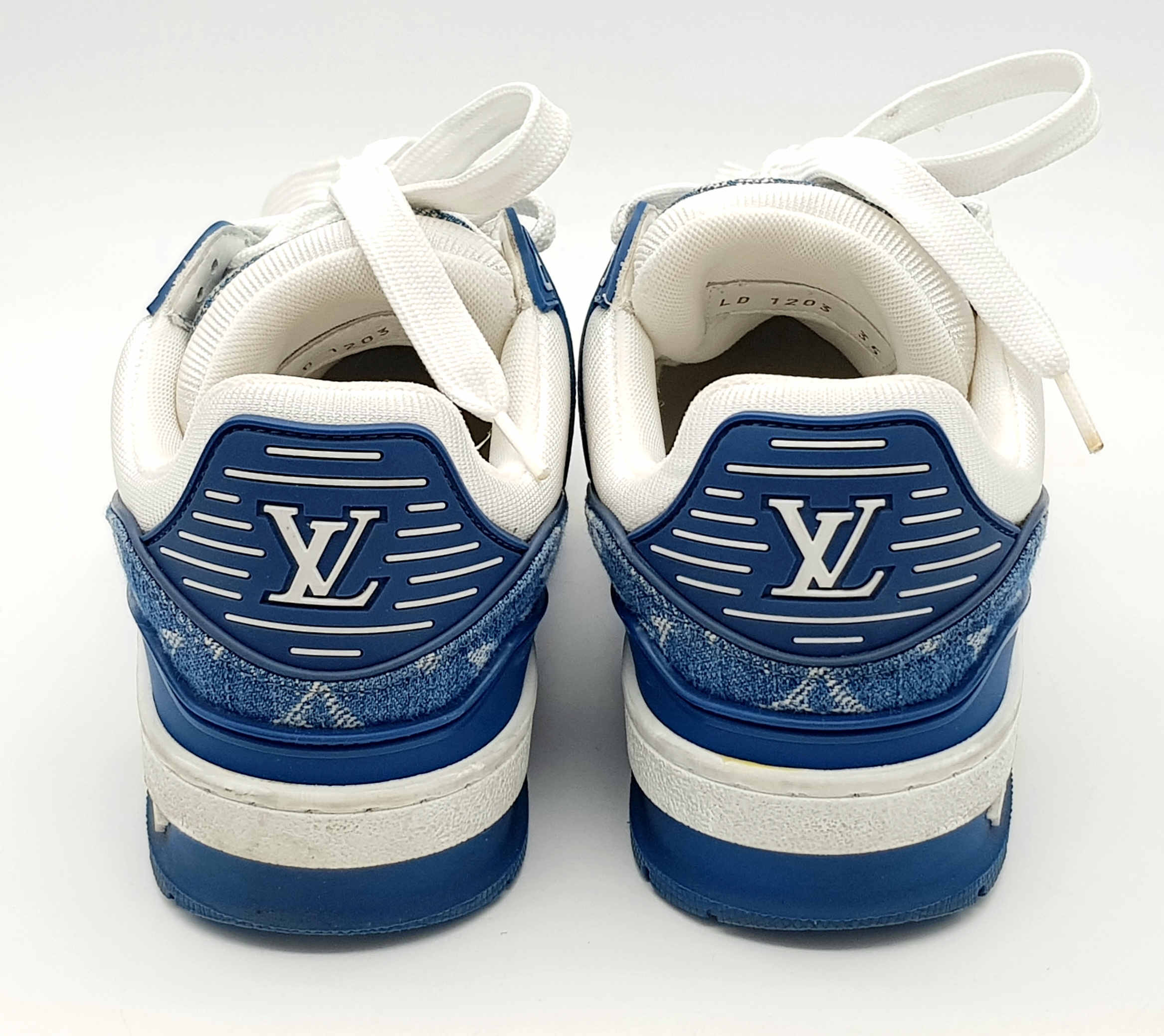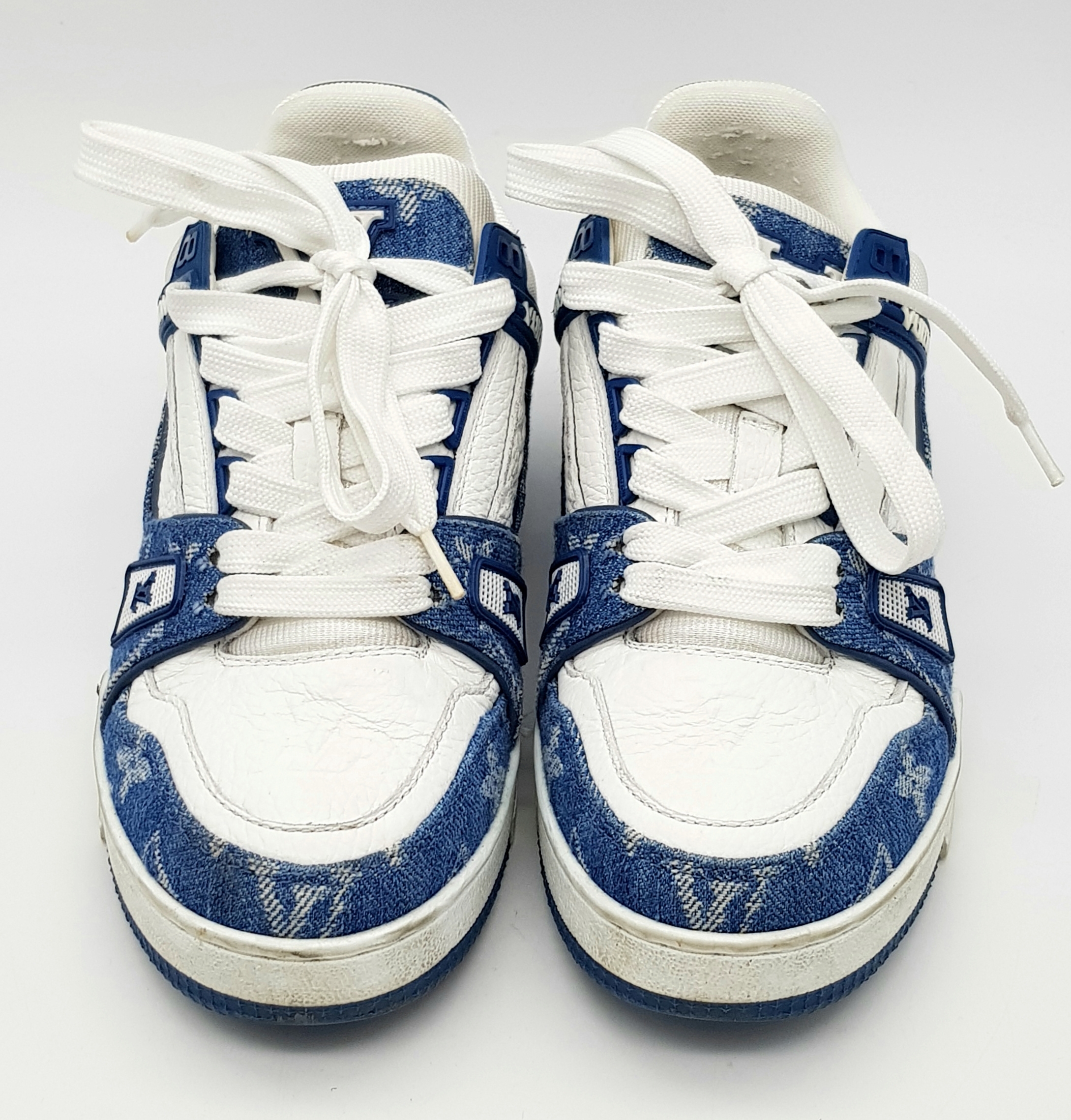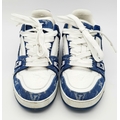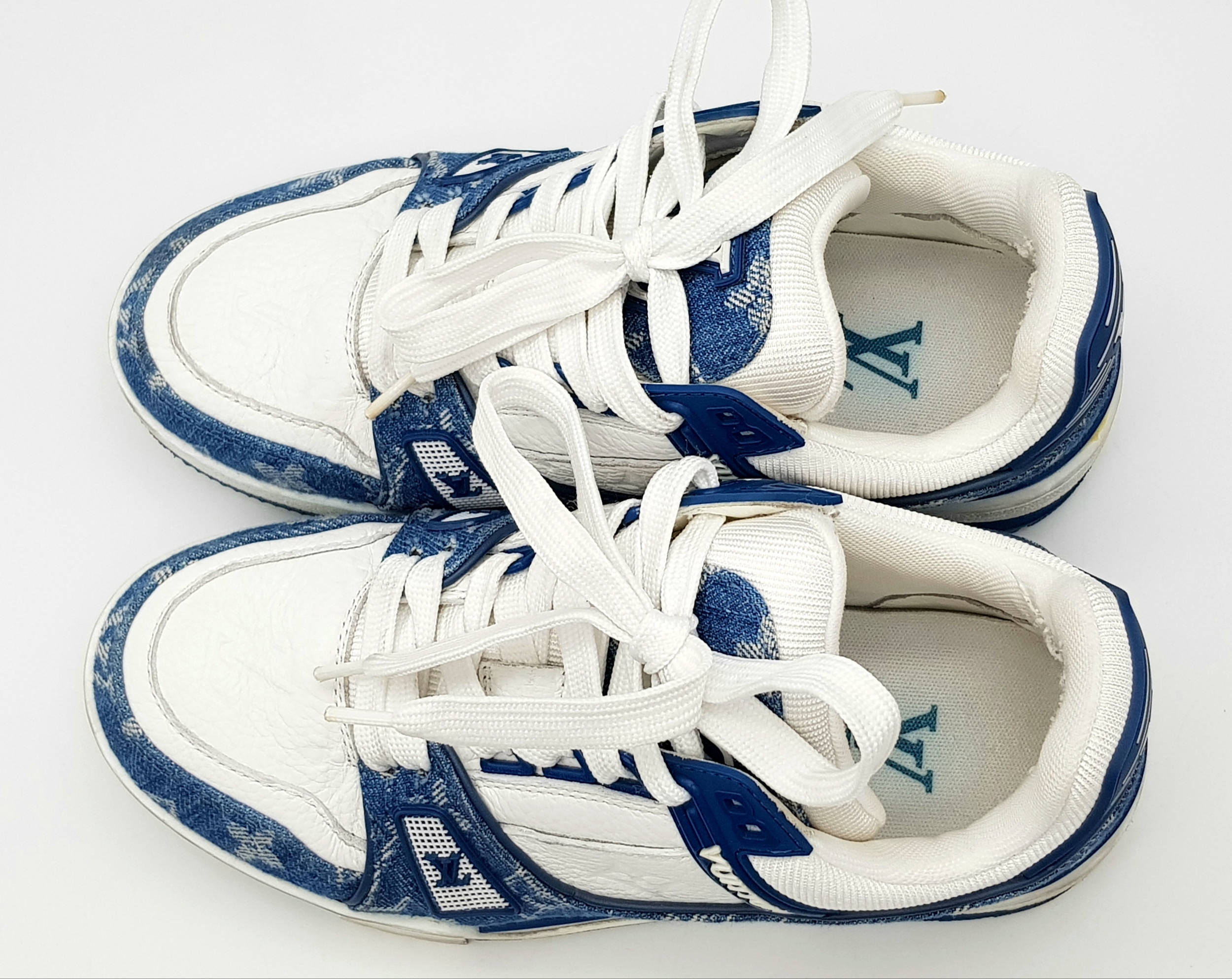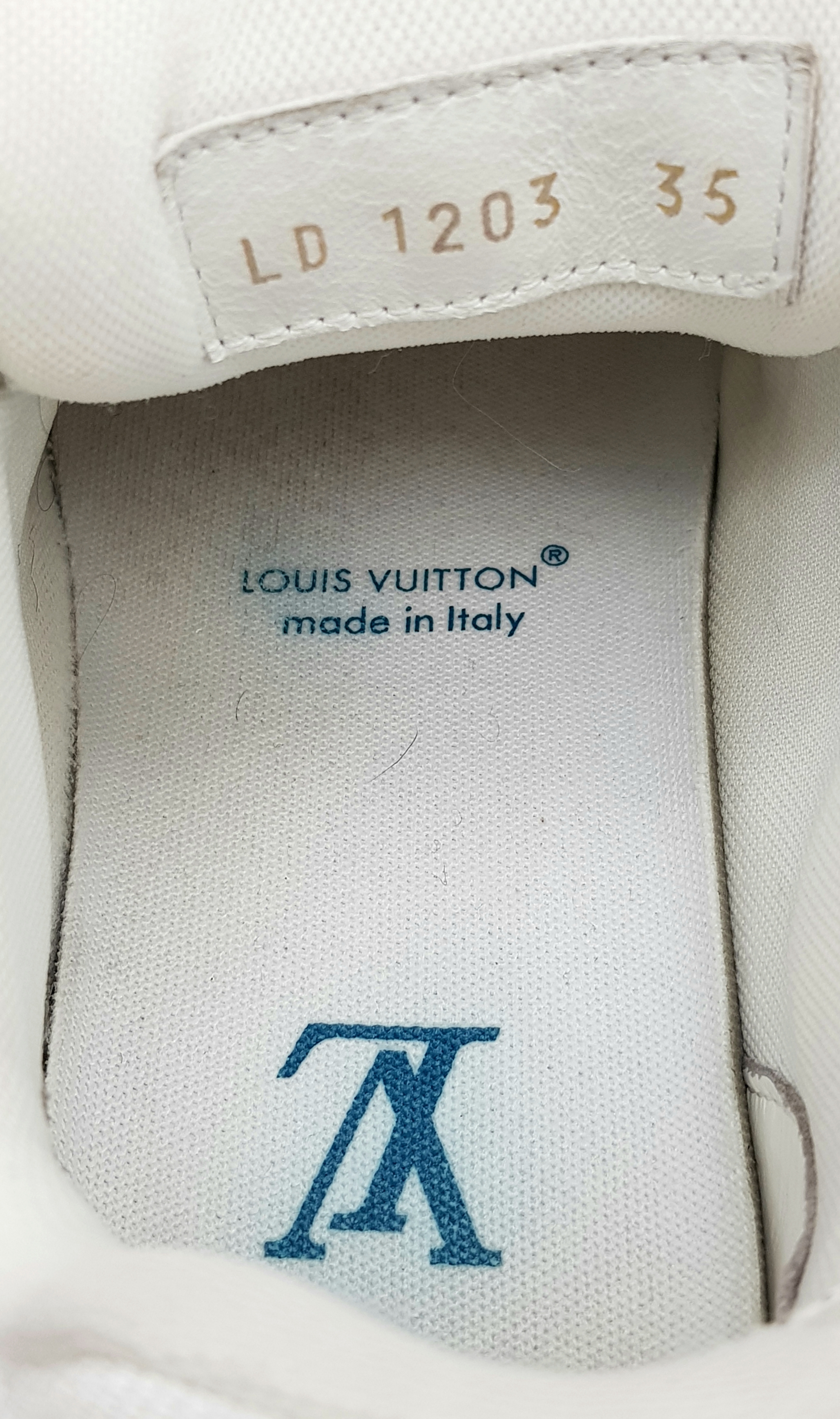 A pair of Louis Vuitton embossed monogram denim sneakers. White leather and monogram denim exterior. Size 35. Signs of used and light wear visible to soles, midsoles, and insoles, with some fraying and faint marks to the interior lining. Please see photos or request a condition report. Ref: J245