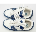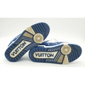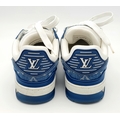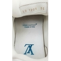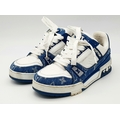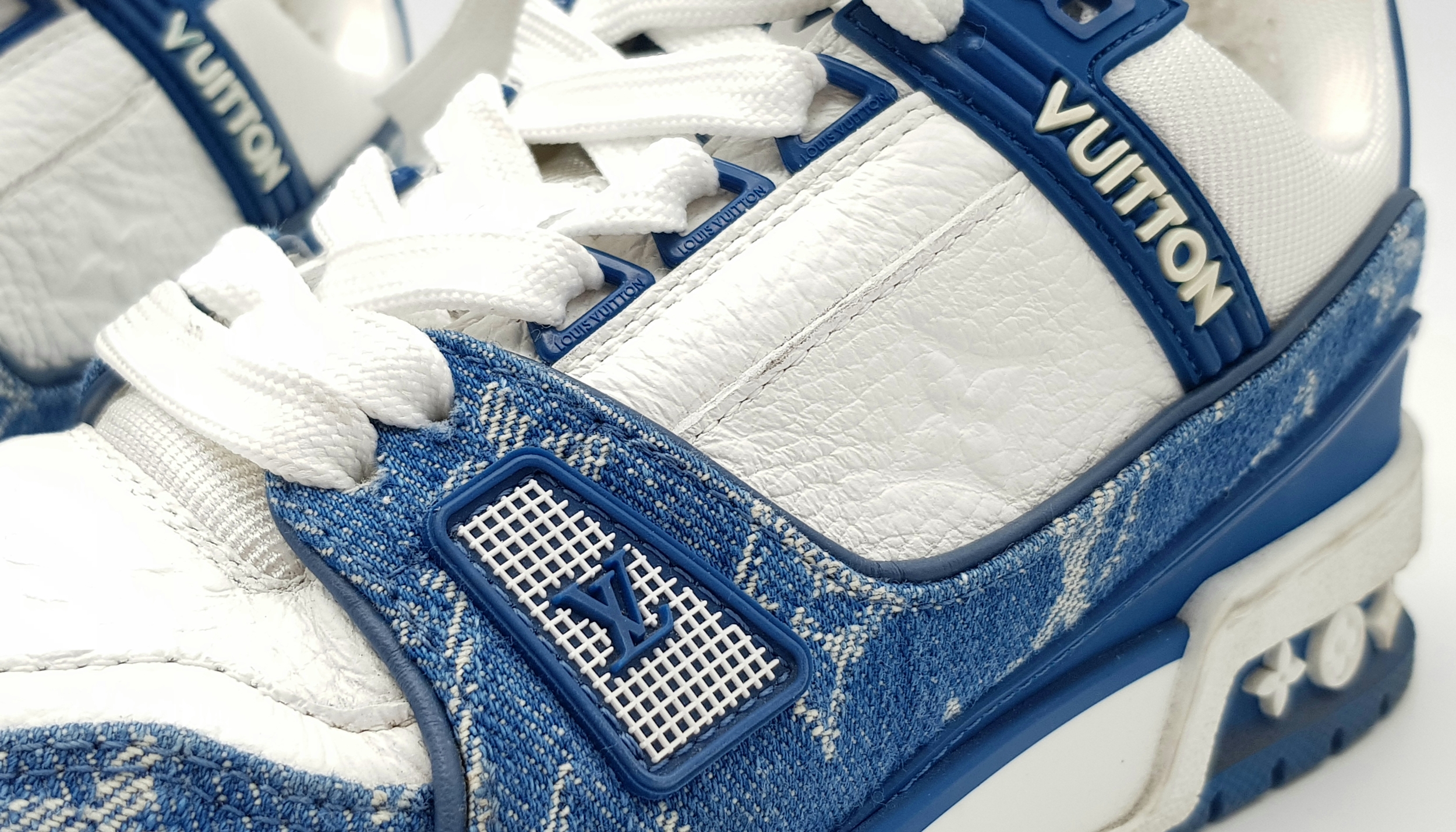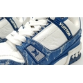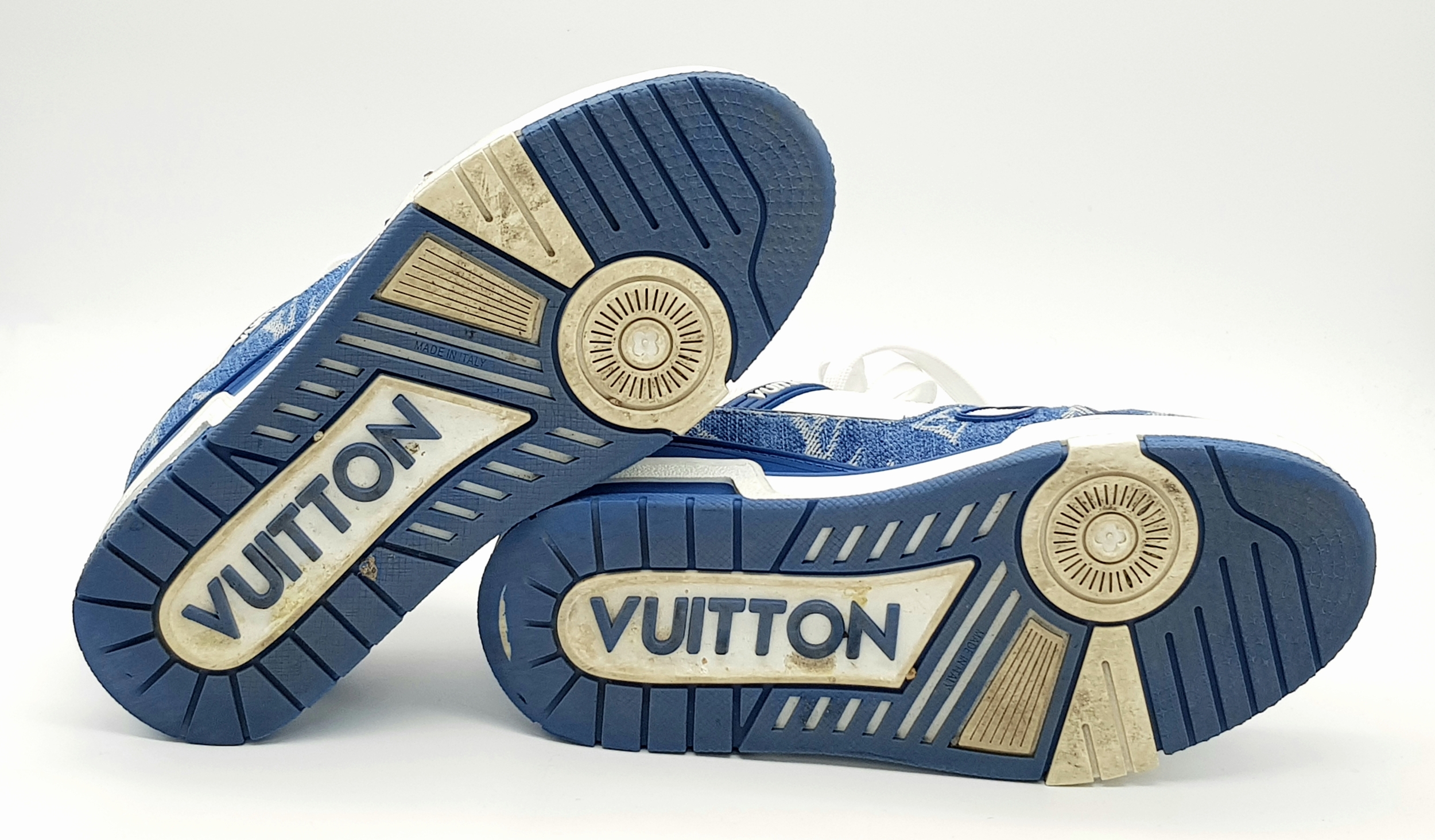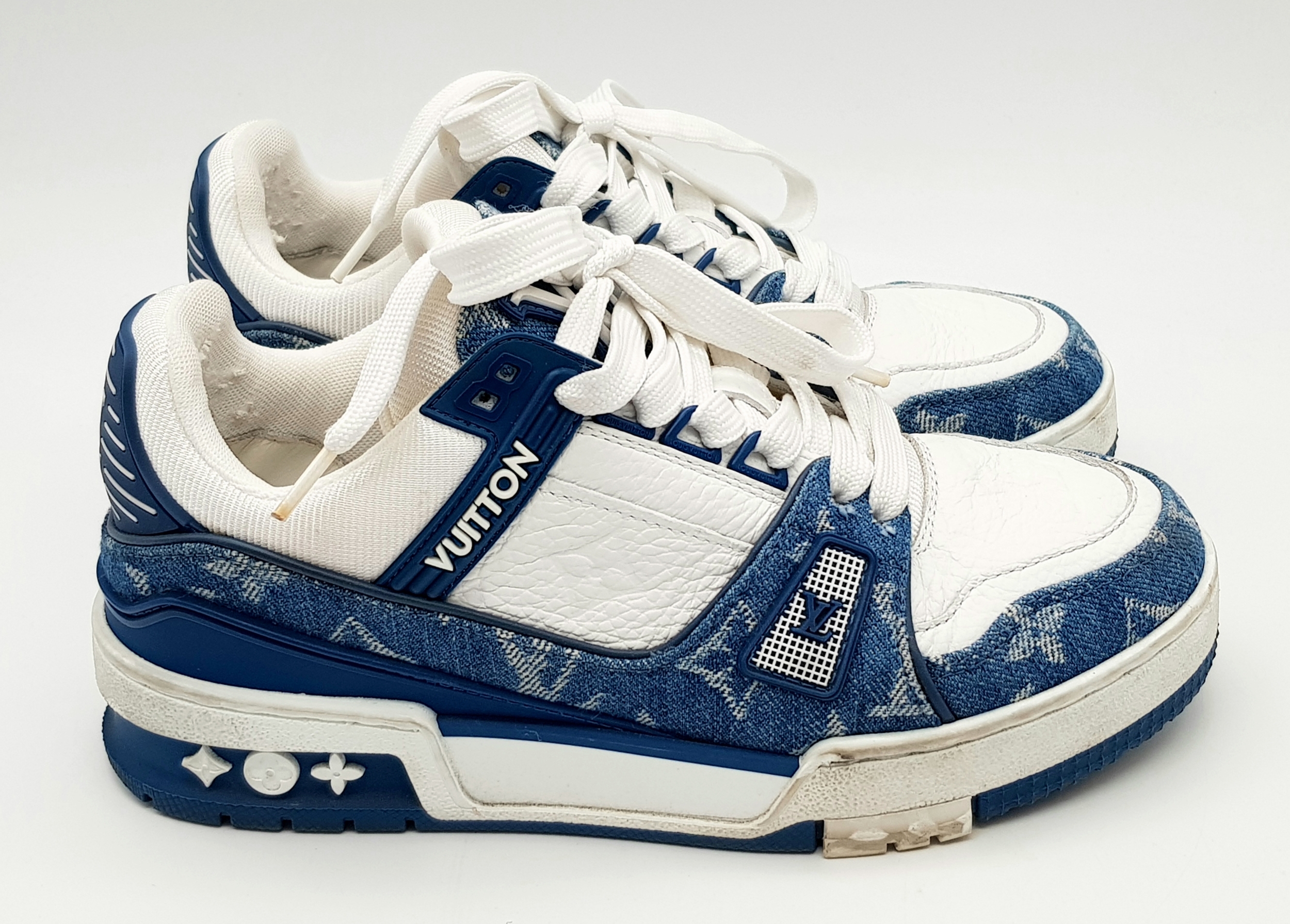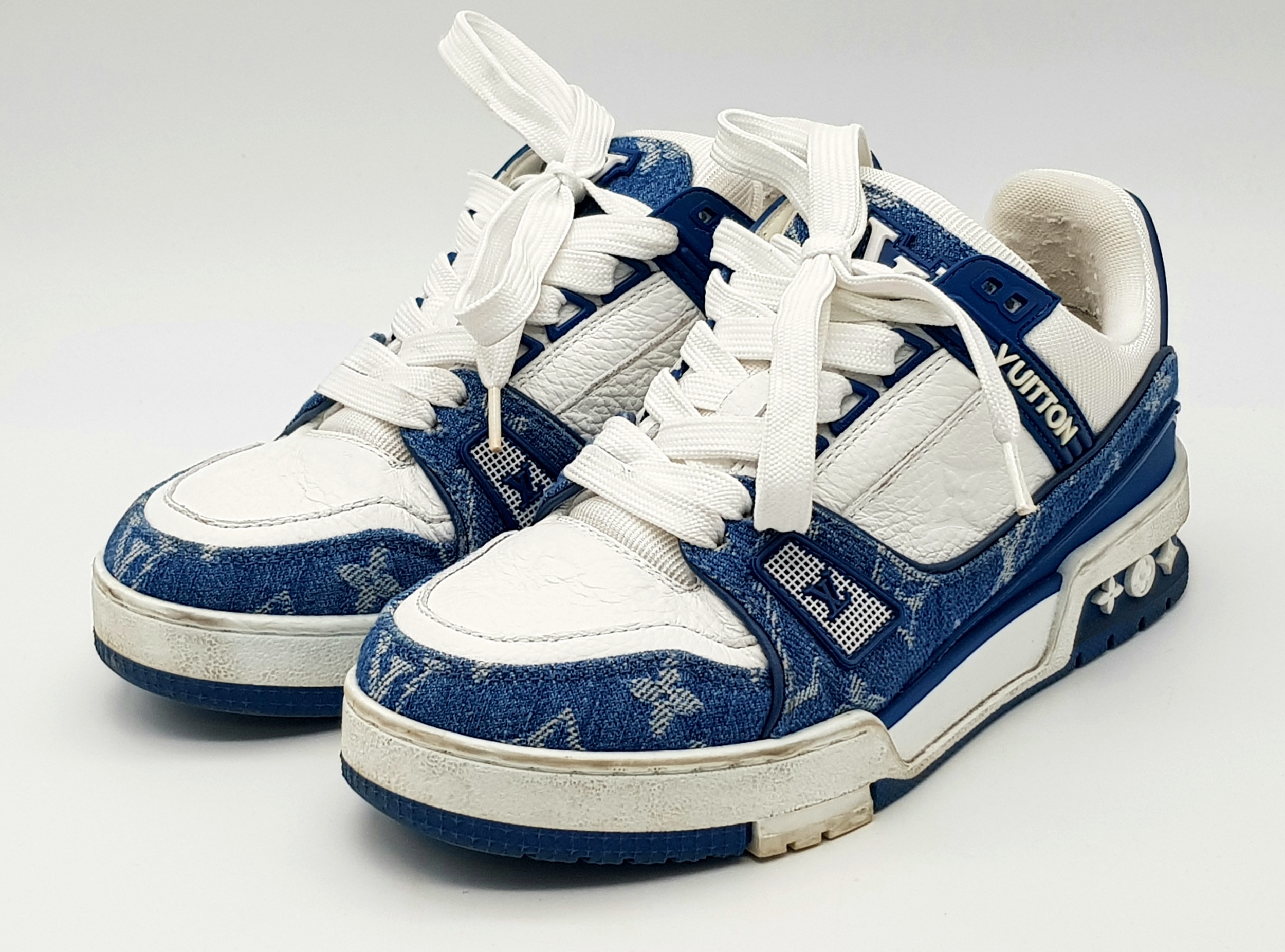 A pair of Louis Vuitton embossed monogram denim sneakers. White leather and monogram denim exterior. Size 35. Signs of used and light wear visible to soles, midsoles, and insoles, with some fraying and faint marks to the interior lining. Please see photos or request a condition report. Ref: J245