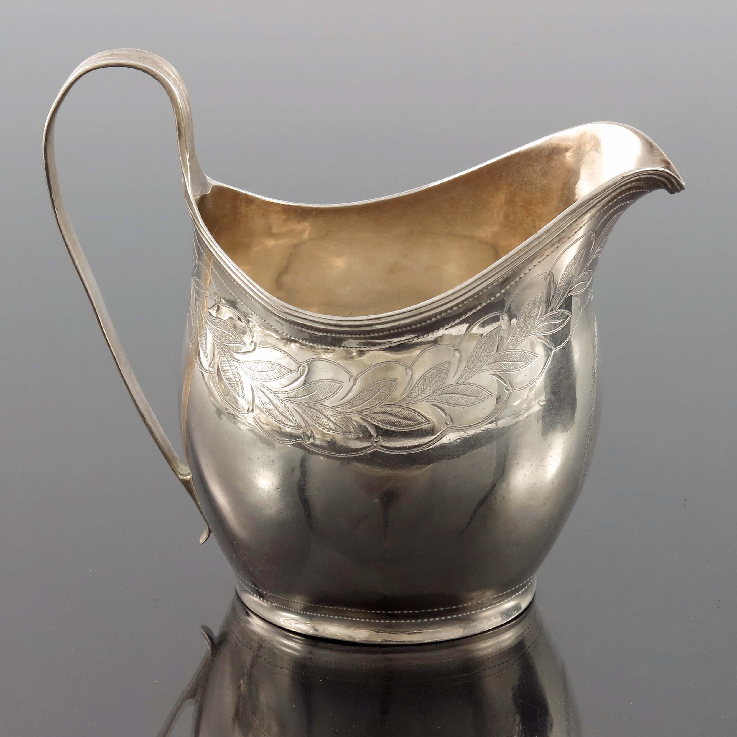 A George III silver jug, Peter and William Bateman, London 1805, ovoid helmet form, bright cut engraved with a band of laurel leaves, above a vacant oval stippled cartouche, fluted strap handle, 10.5cm high
