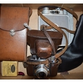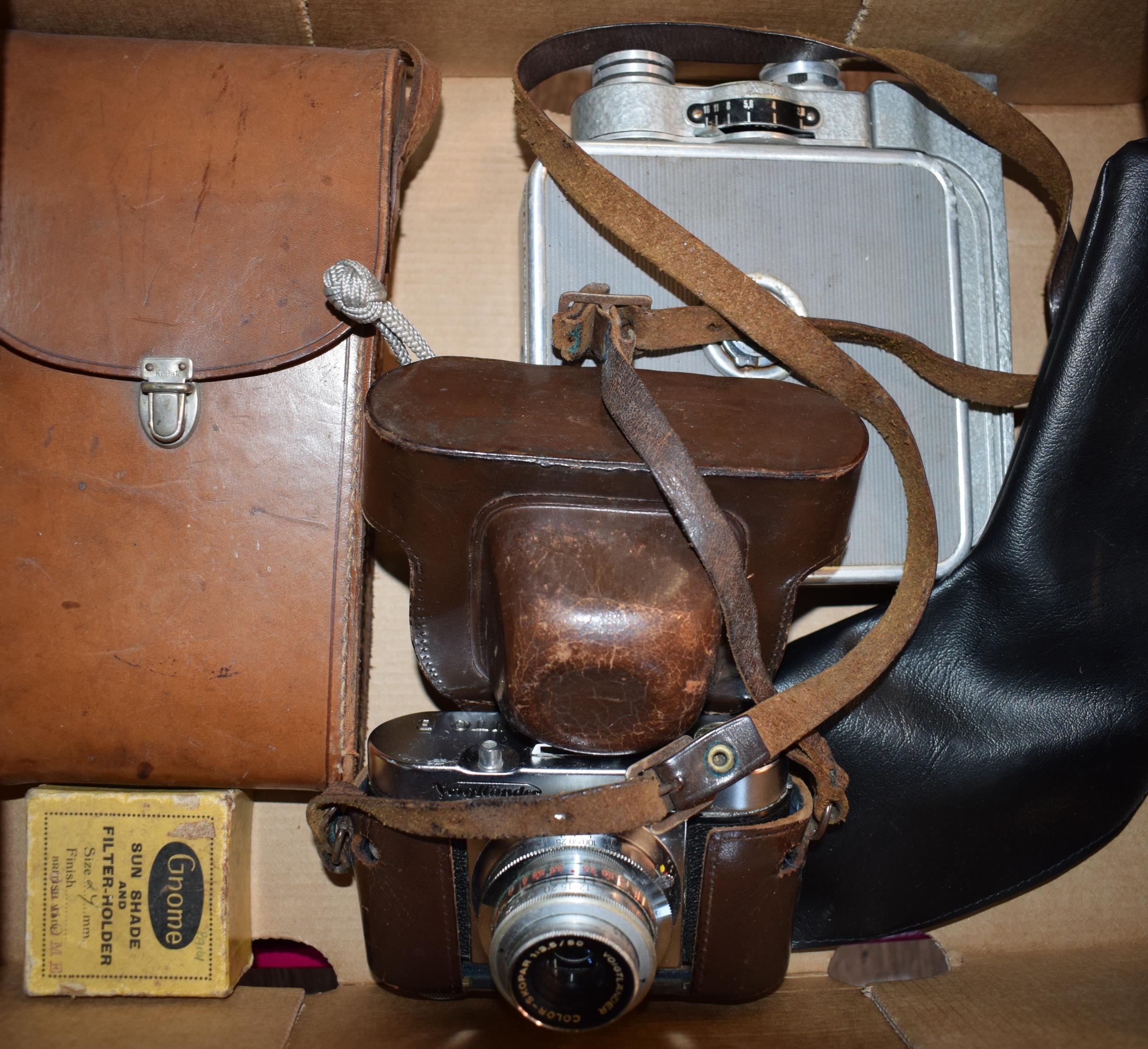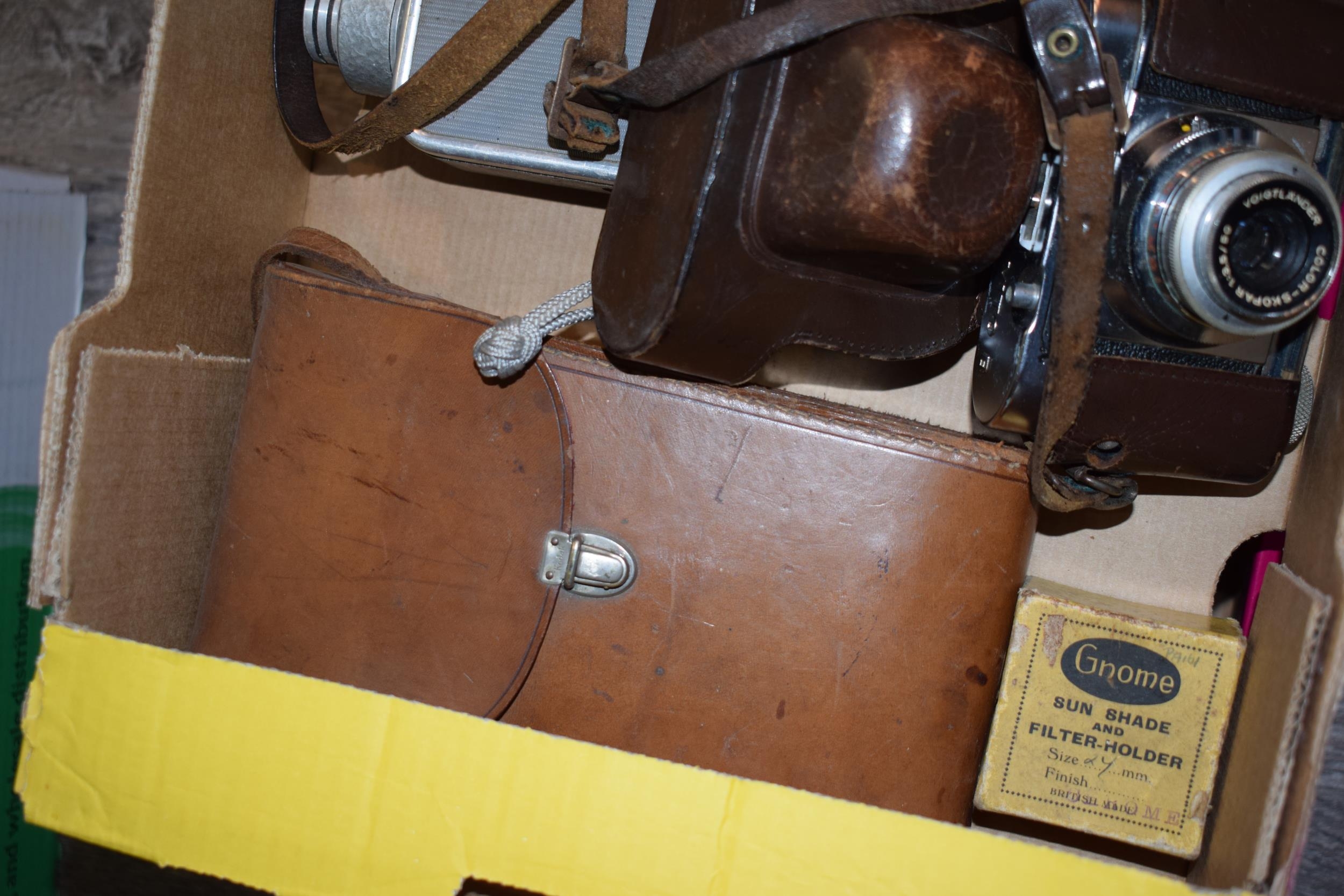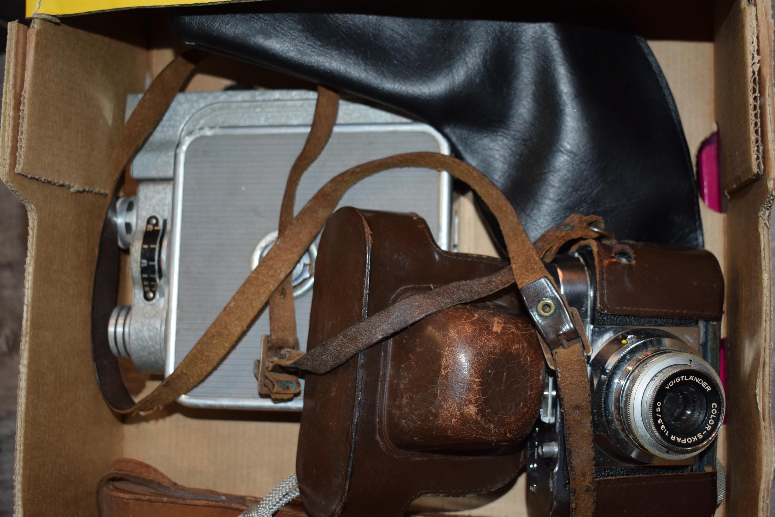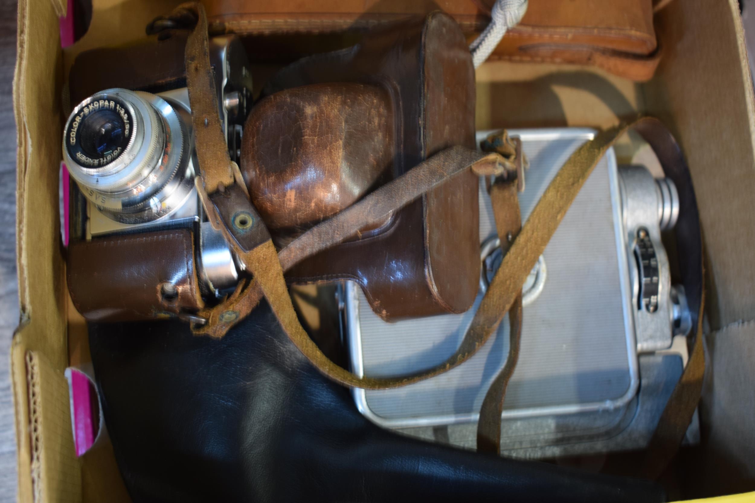 A mixed collection of vintage cameras to include a Voigtlander in original leather case. (Qty)