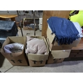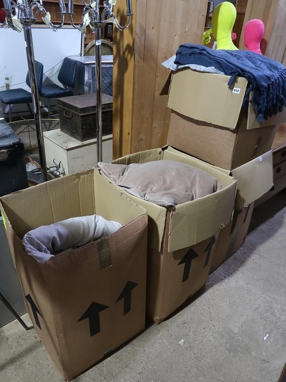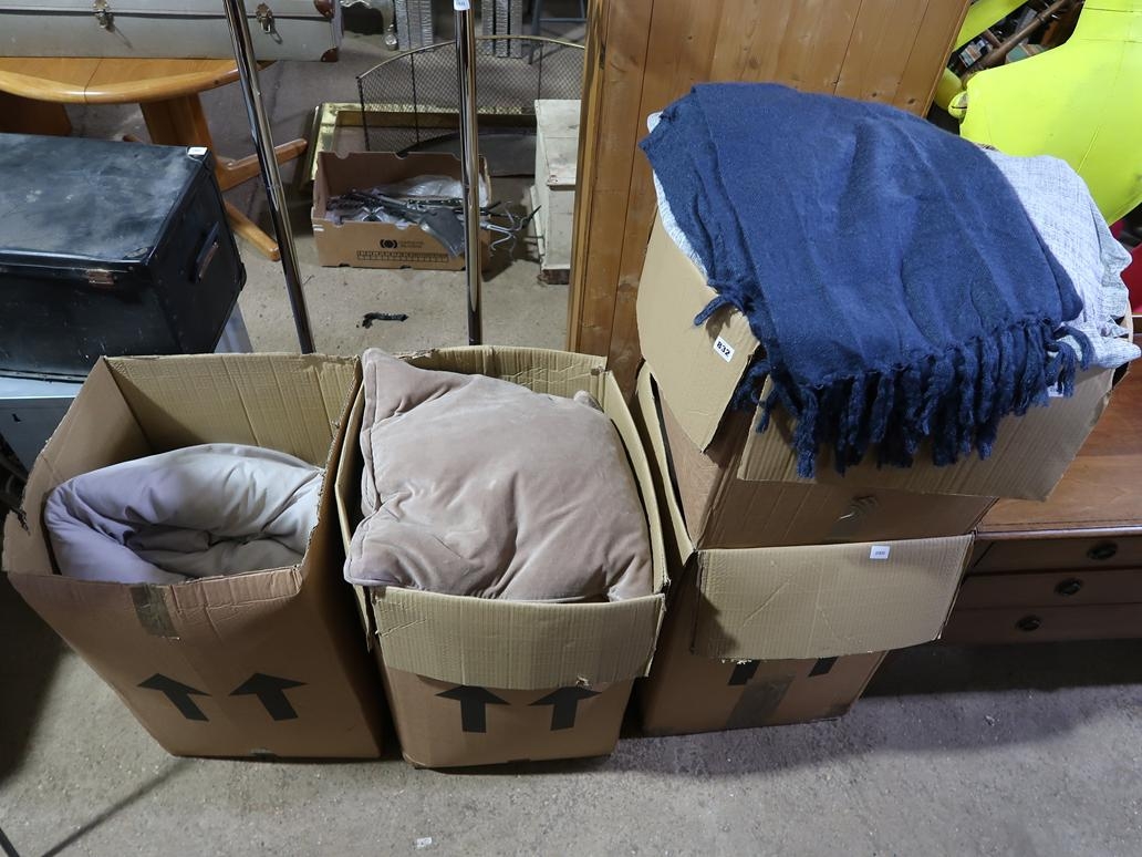 FOUR BOXES OF CUSHIONS, THROWS, DUVETS ETC