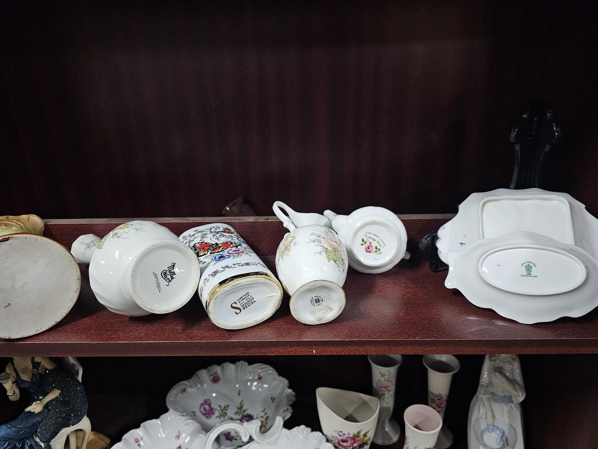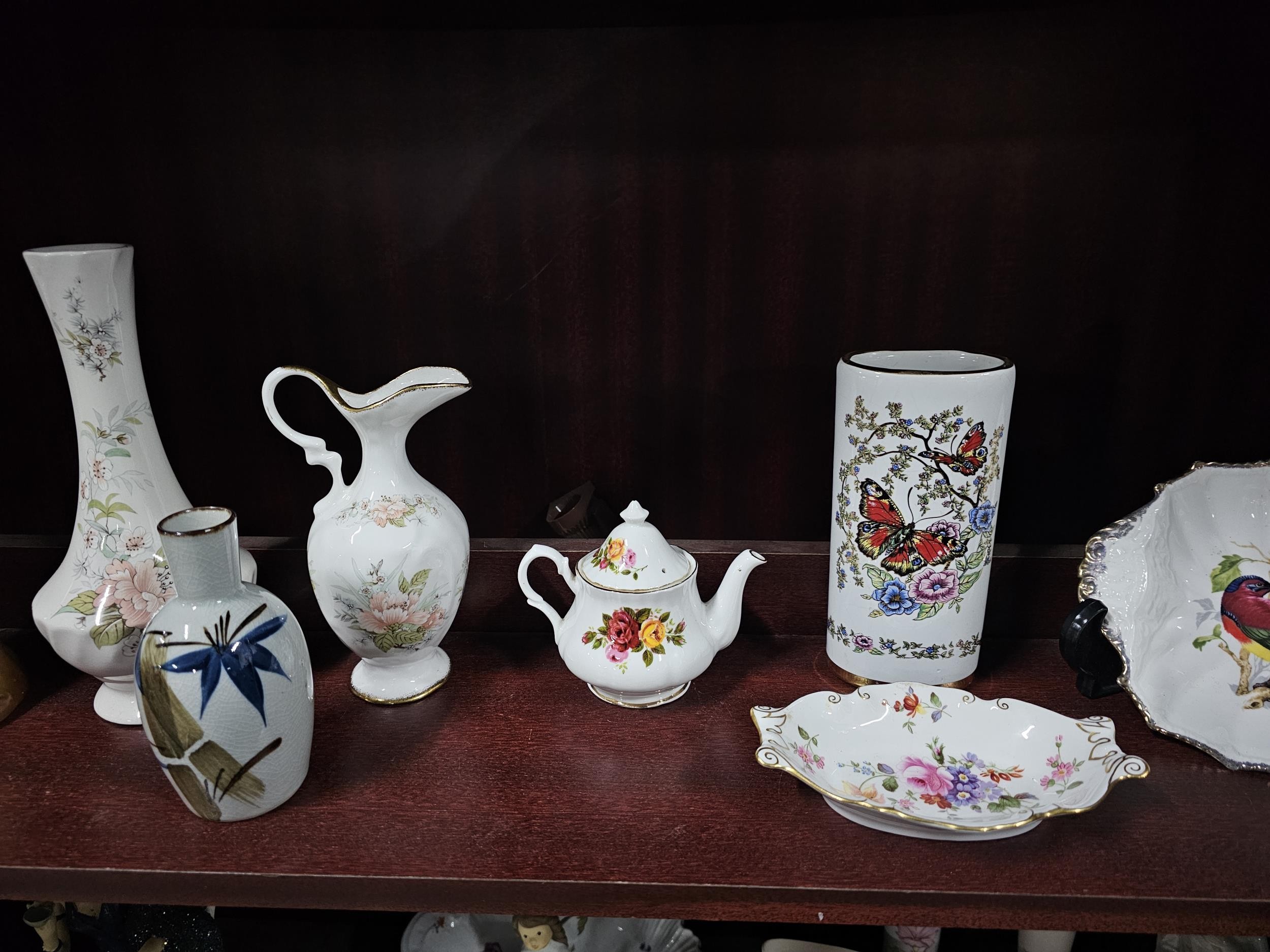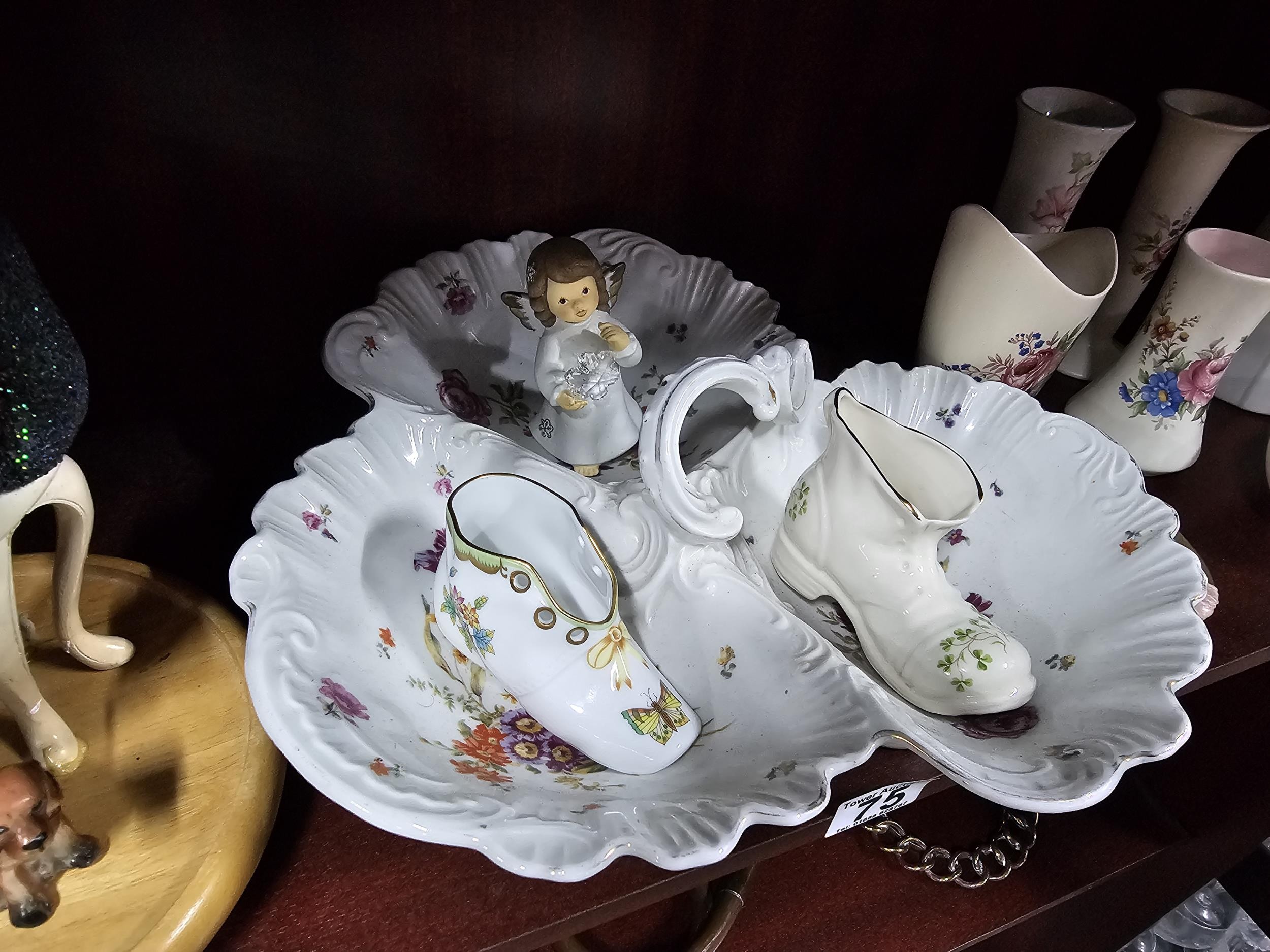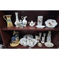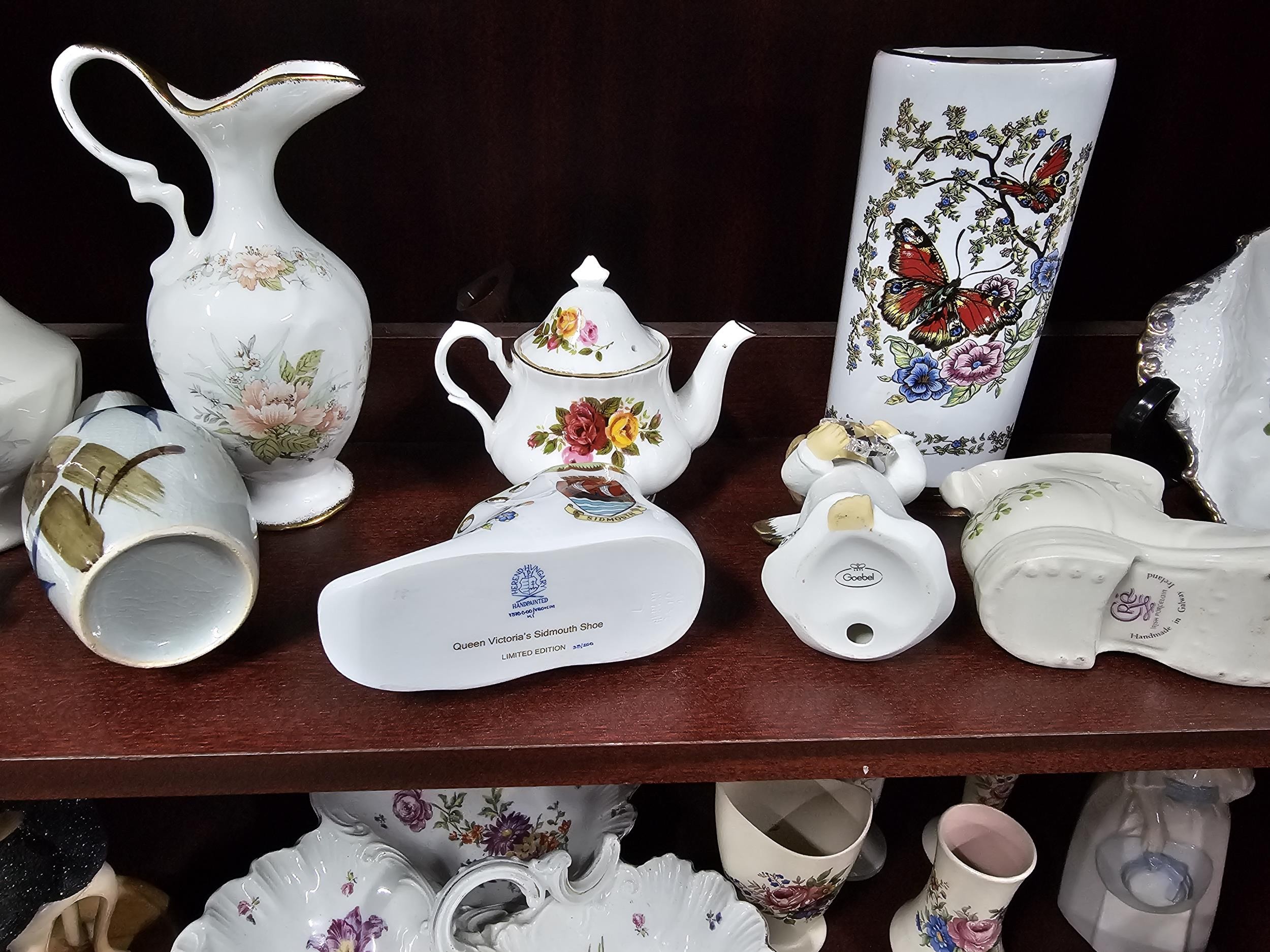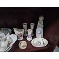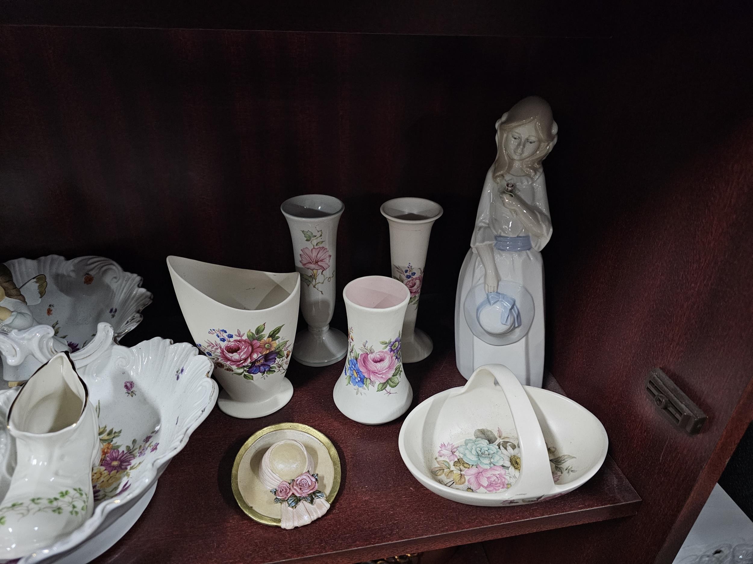 A large collection of assorted ceramics to include a trefoil dish, a Goebel angel figure, a Nadal lady figurine along with a quantity of Axe Vale Devon pottery pieces, Purbeck potter pieces along with a Royal Crown Derby floral pin dish etc, all pieces are in good order, tallest pice has a height of 28cm