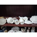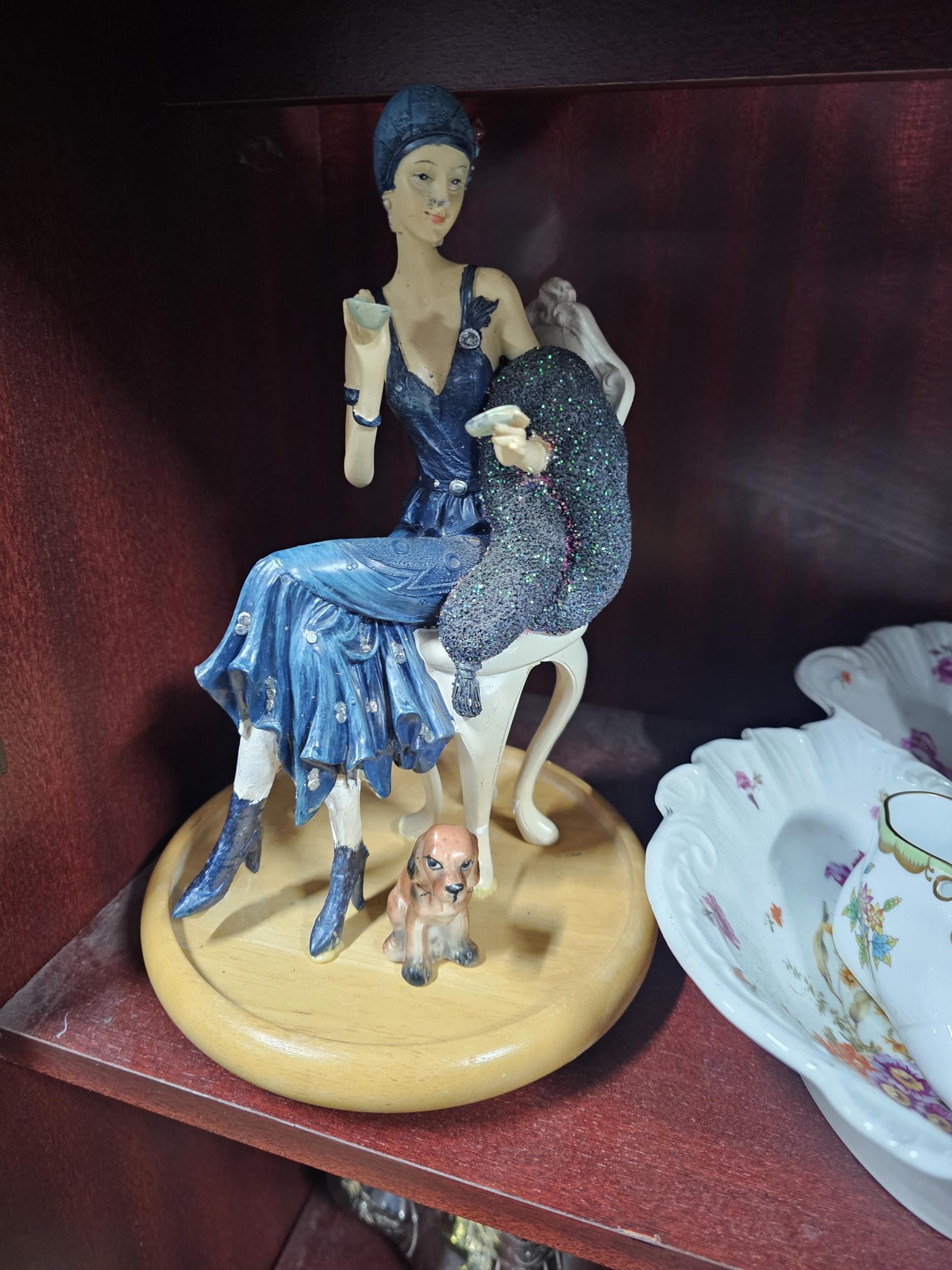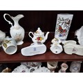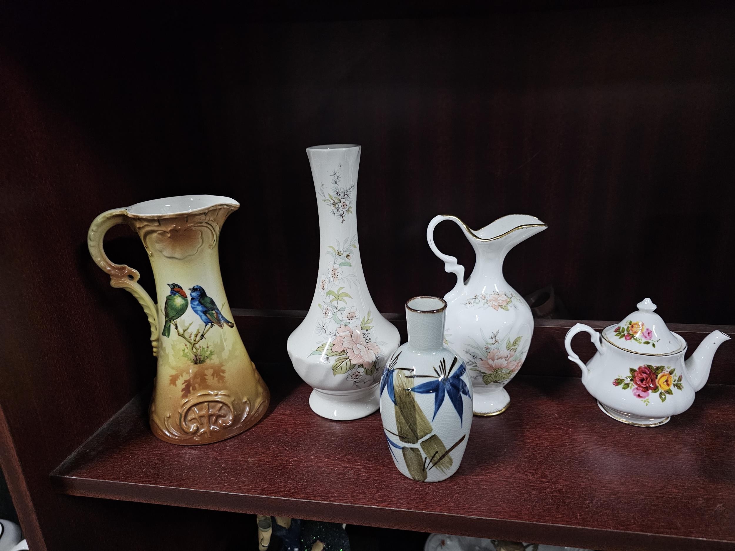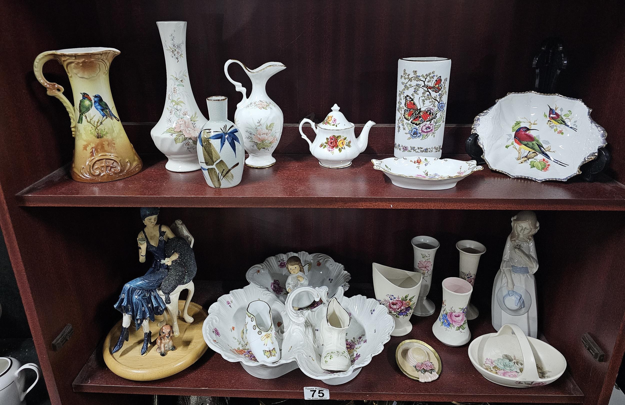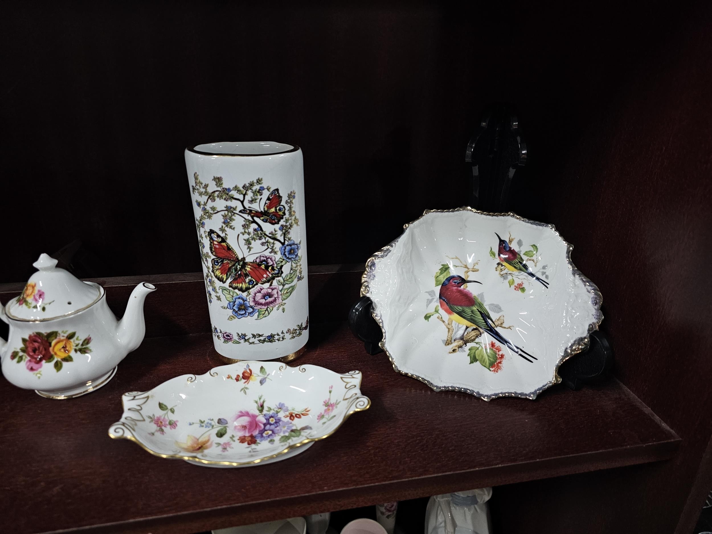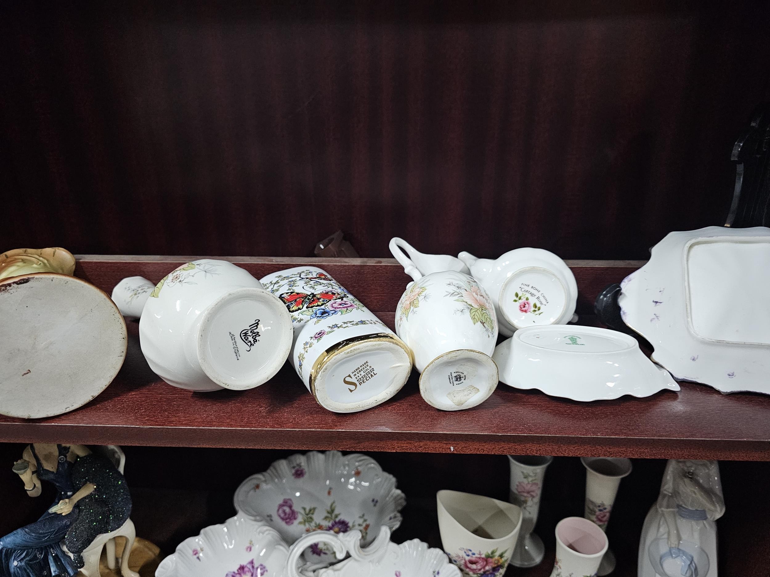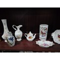 A large collection of assorted ceramics to include a trefoil dish, a Goebel angel figure, a Nadal lady figurine along with a quantity of Axe Vale Devon pottery pieces, Purbeck potter pieces along with a Royal Crown Derby floral pin dish etc, all pieces are in good order, tallest pice has a height of 28cm