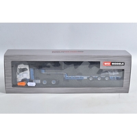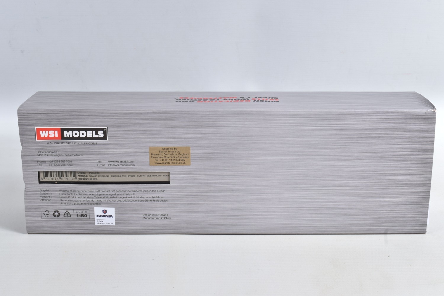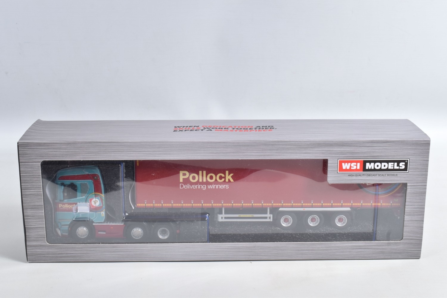 A BOXED WSI MODELS SCANIA S HIGHLINE I CS20H 6x2 TWIN STEER + 3 AXLE CURTAINSIDE TRAILER - POLLOCK, No.02-3345, 1/50 scale, limited edition with Certificate of Authenticity No.122 of 170, appears largely complete and in very good condition, box complete but has some minor damage, marking and wear