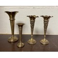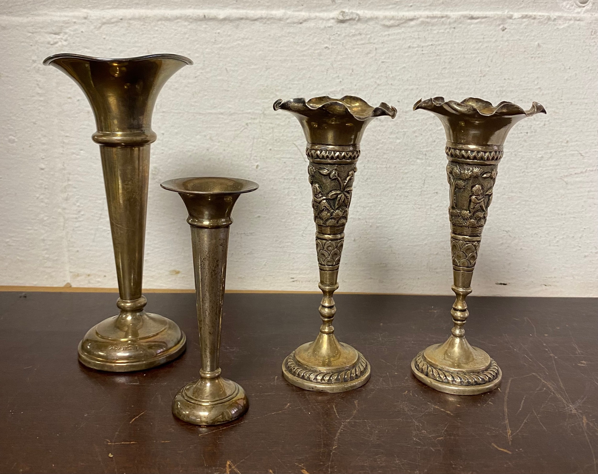 Two English silver bud vases, together with a pair of white metal vases (4) -