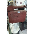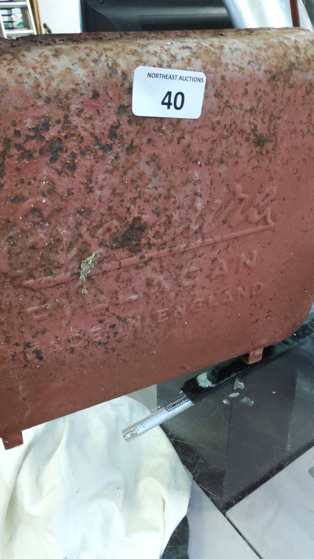 Vintage red painted pressed-steel petrol can, integral handle and curved pouring spout