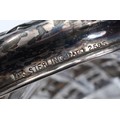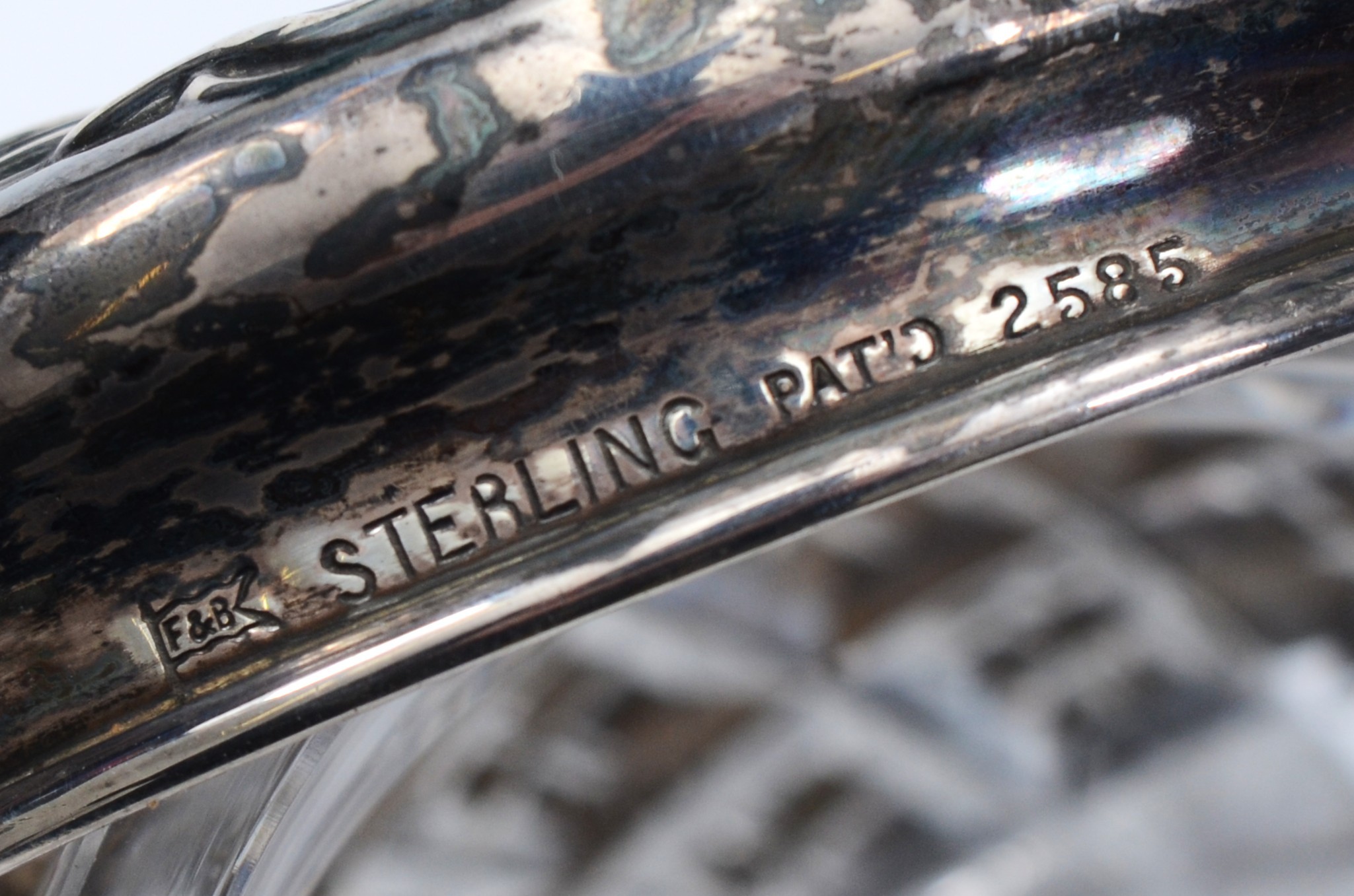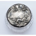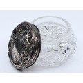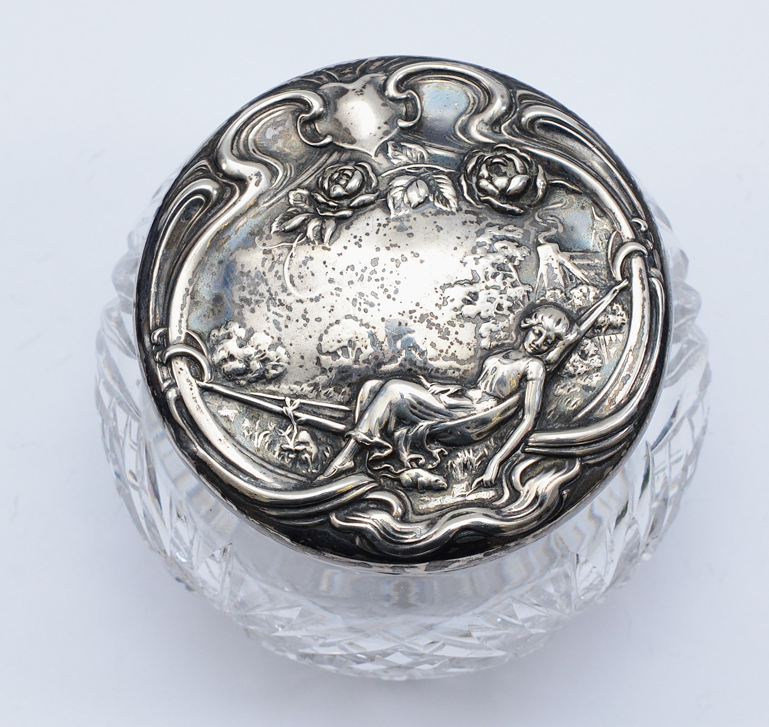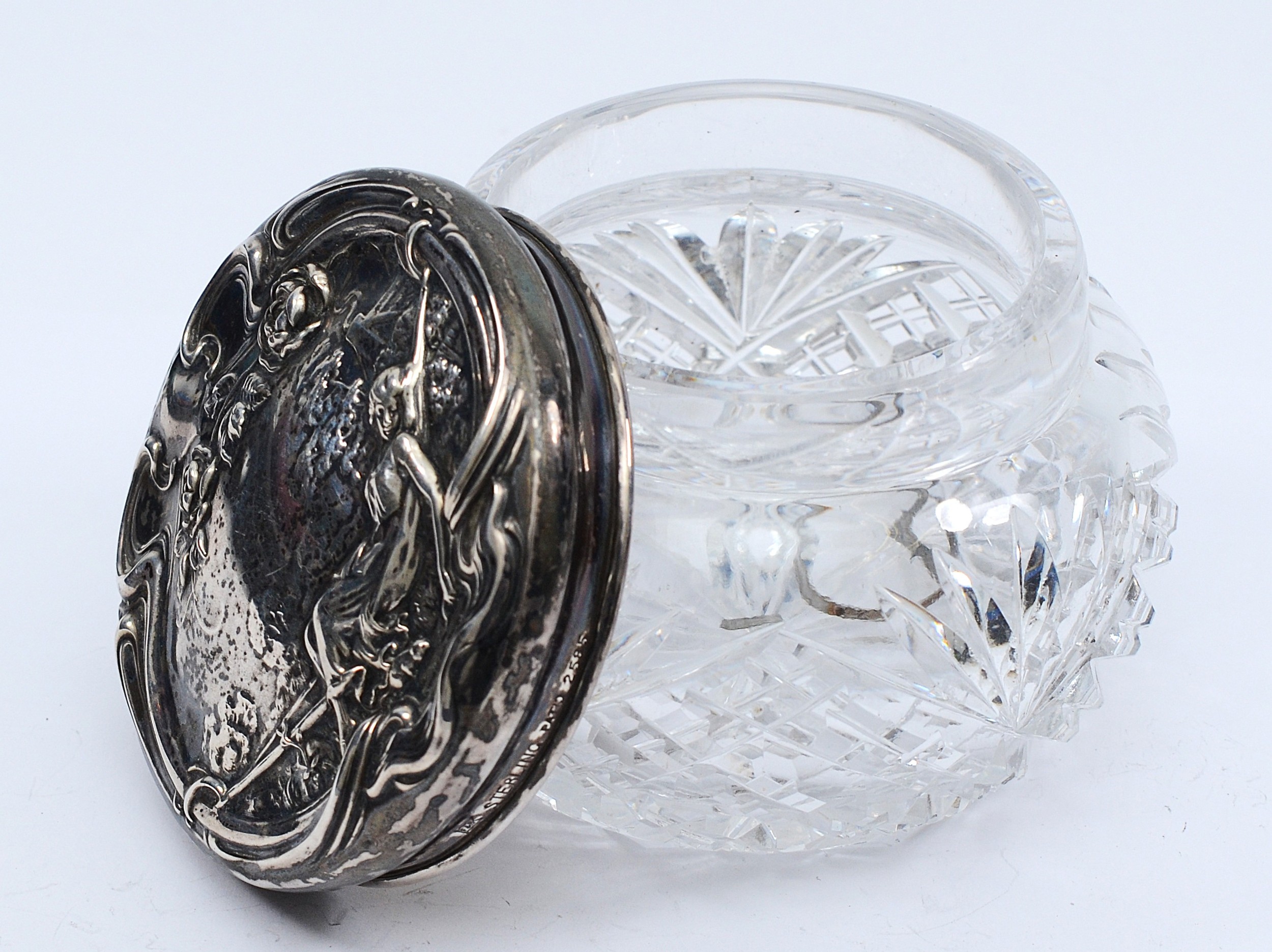 A cut glass powder jar, with embossed silver lid of a lady in a hammock, marked sterling silver, lid weighing 25gm, 7cm tall.