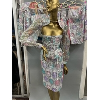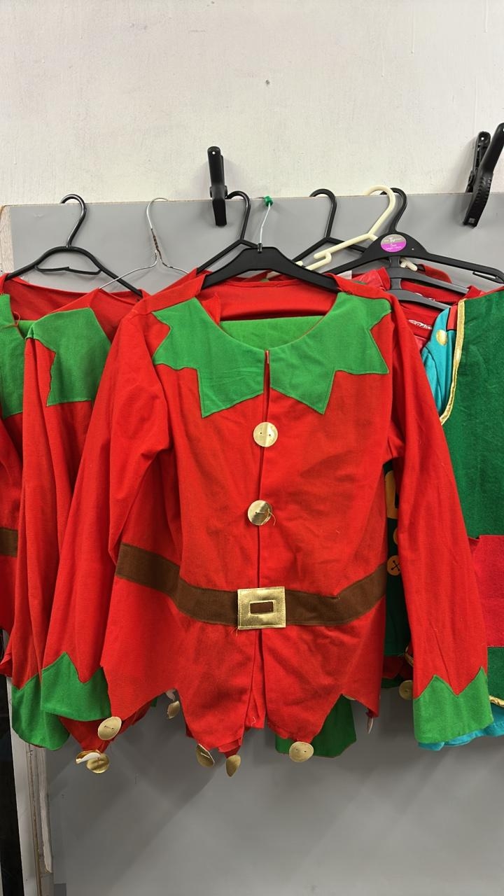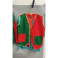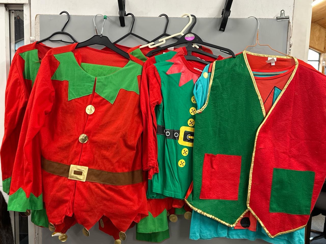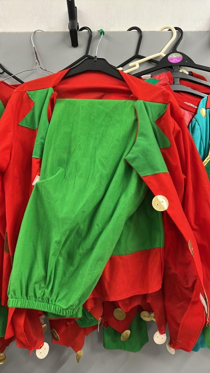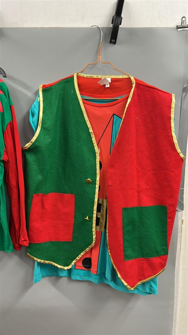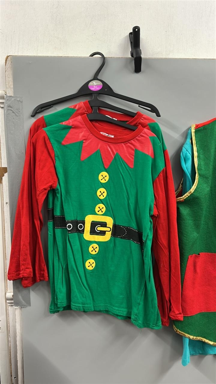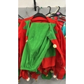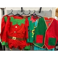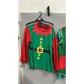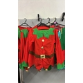 A collection of elf costumes, lot to include 5 matching jackets and trousers, a spare jacket, two childrens elf t-shirts and an adults 'elf style' waist coat and t-shirt. /Rail 2