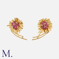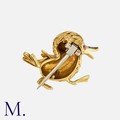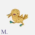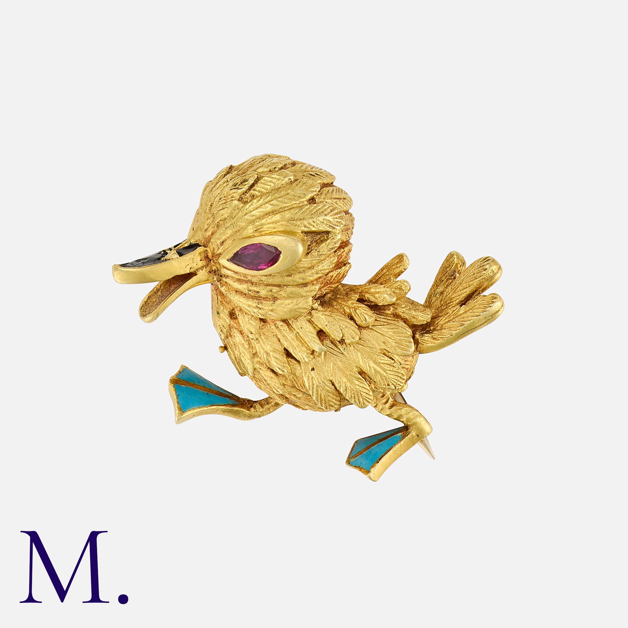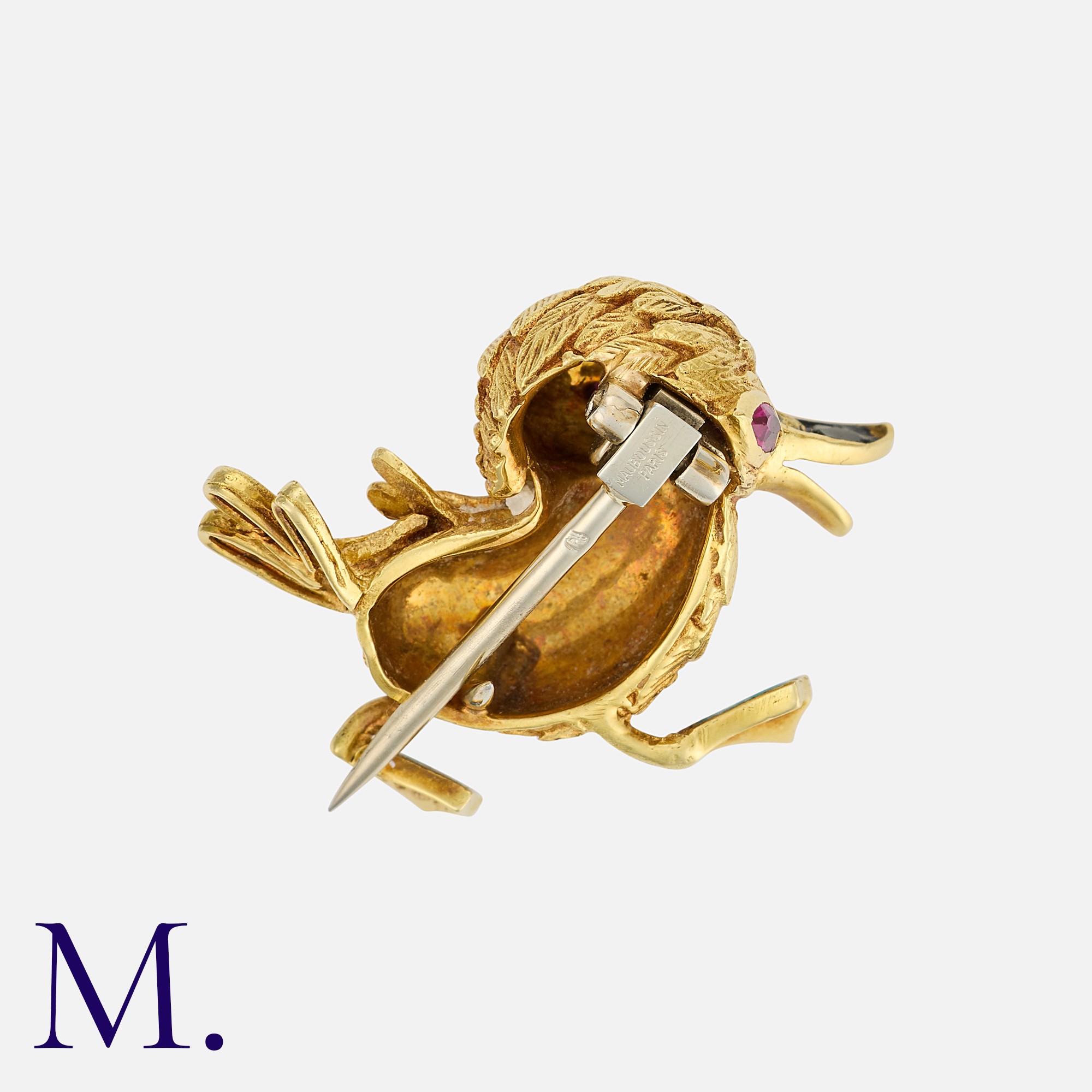MAUBOUSSIN. A Chick Brooch in 18K yellow gold, the eye set with a marquise cut ruby and blue enamel accents to the feet. Signed Mauboussin Paris and serial numbered.