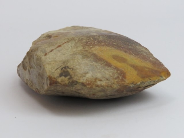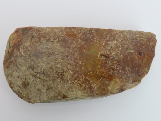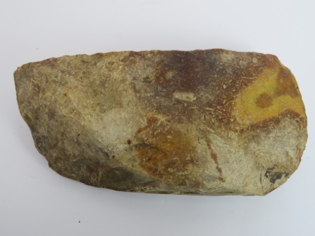 A Neolithic knapped and polished burnt orange flint axe head. Of Scandinavian origin. Provenance: Acquired from the private Danish collection of Tom Holck. 17 cm length.