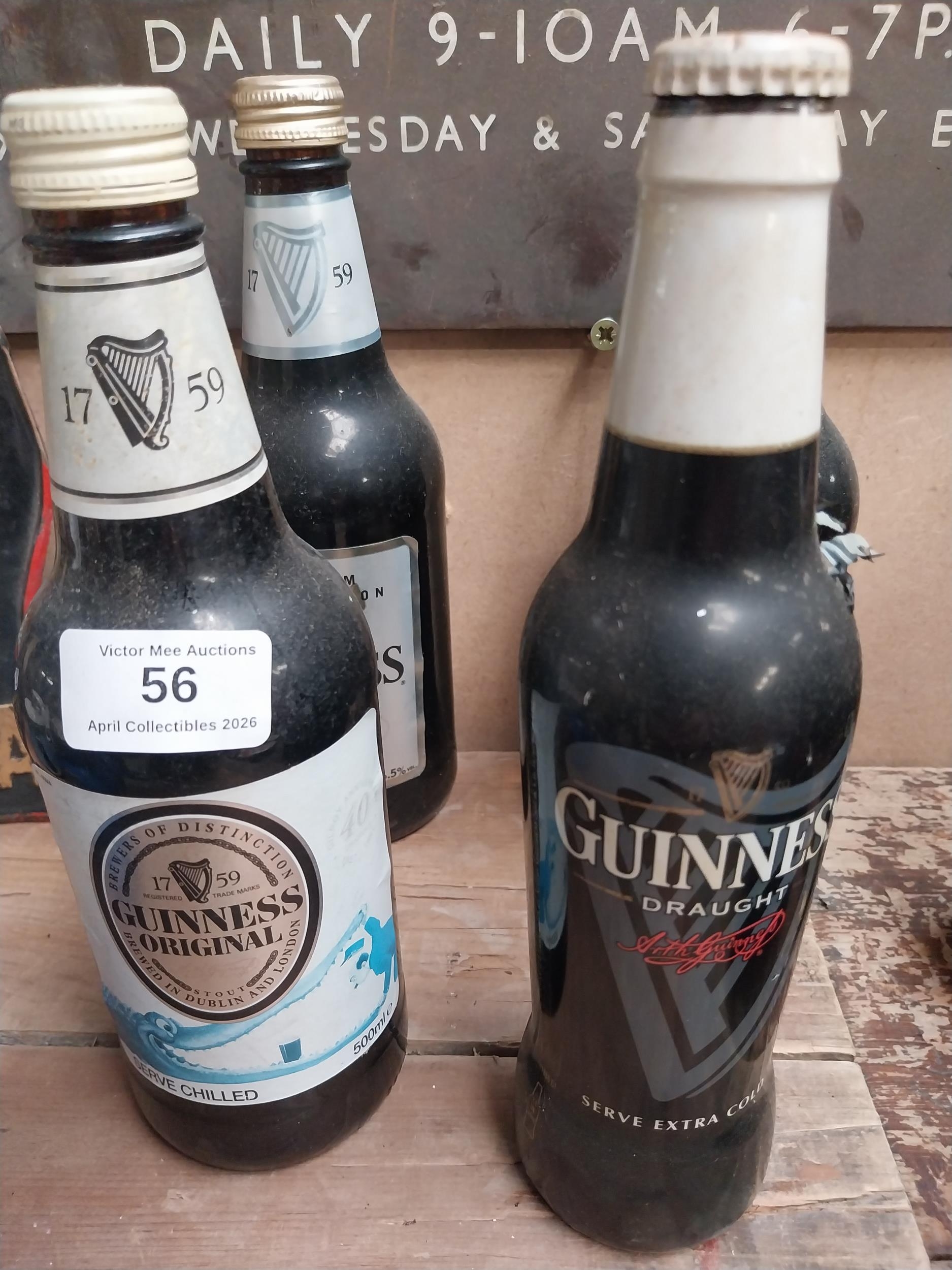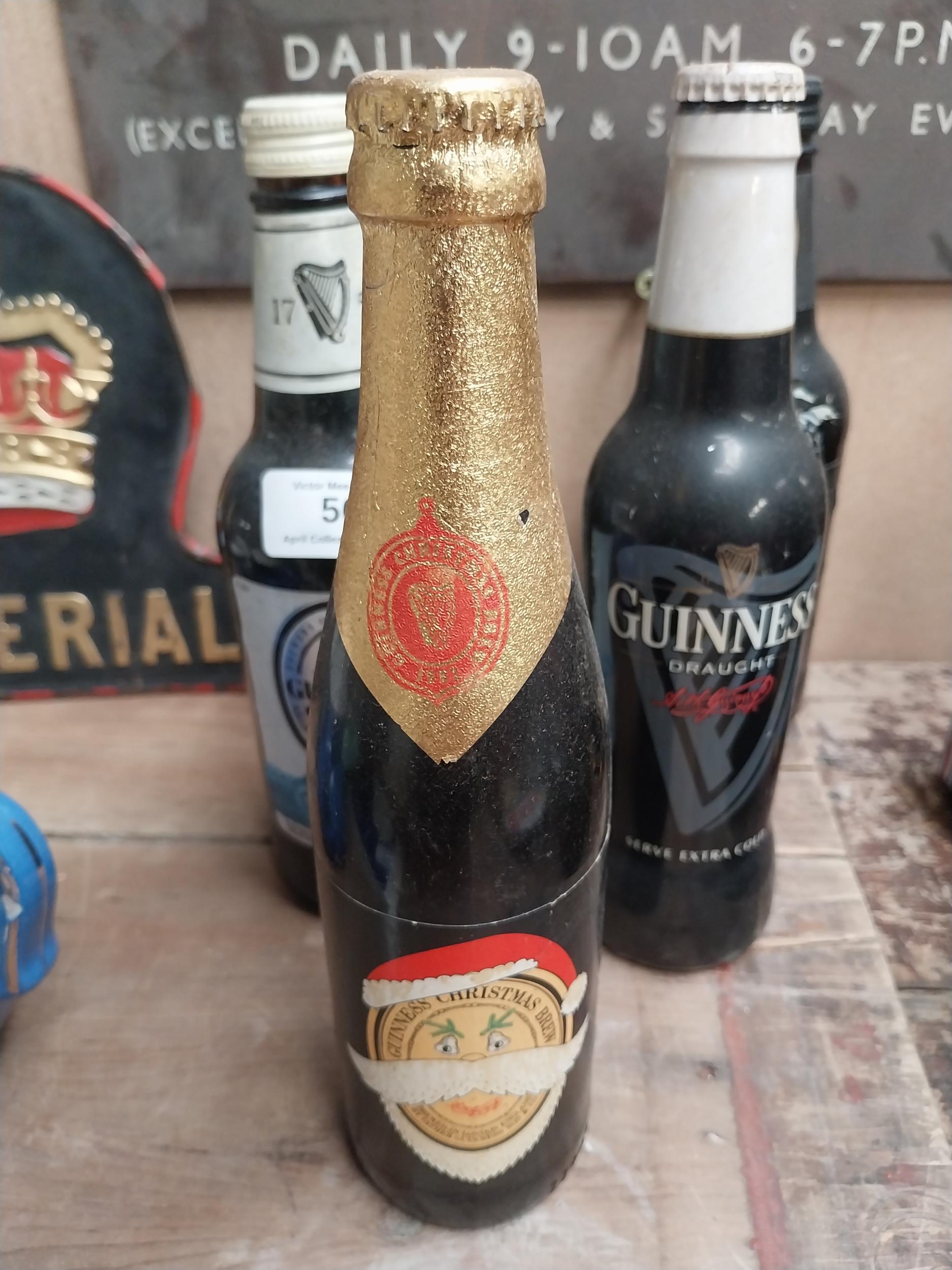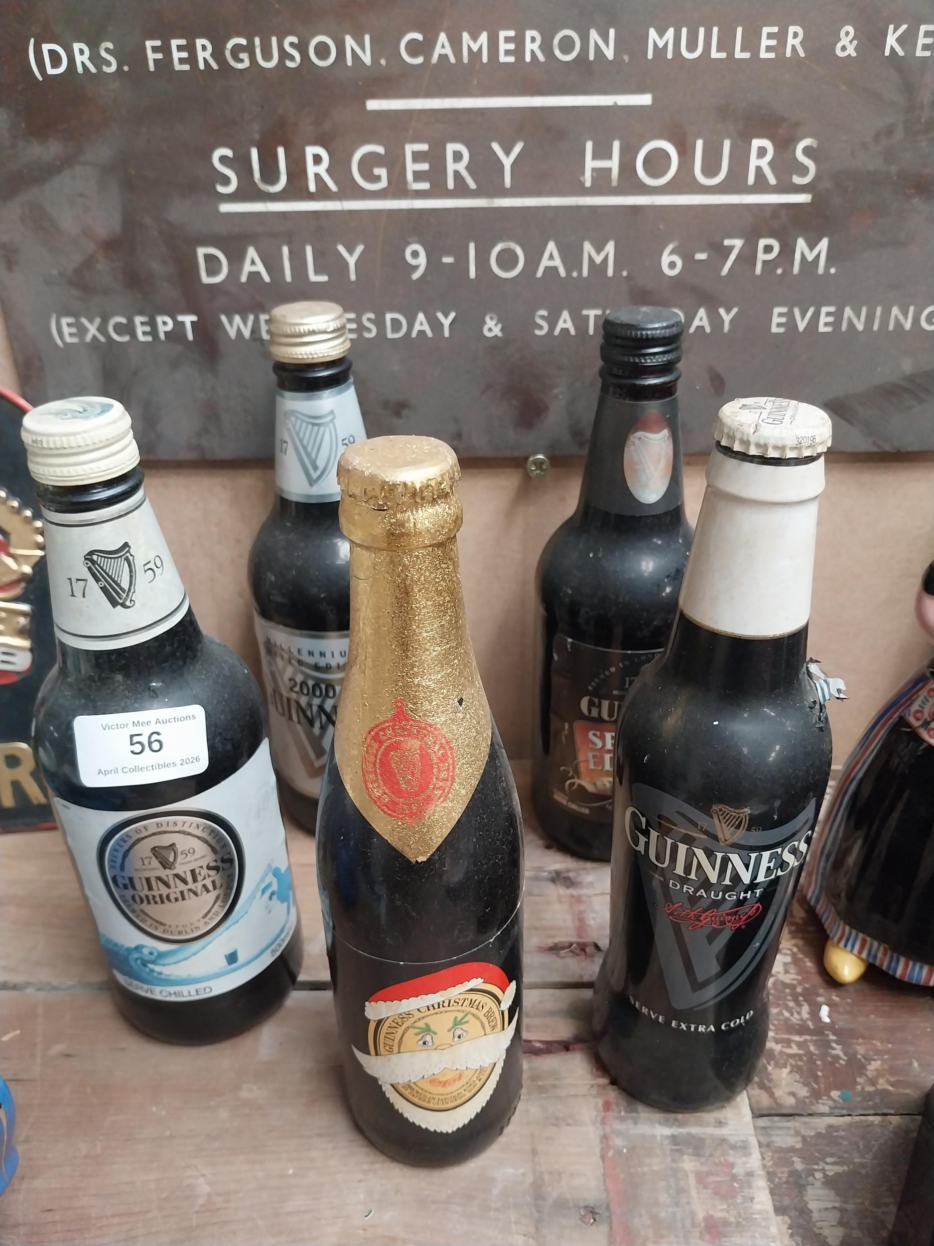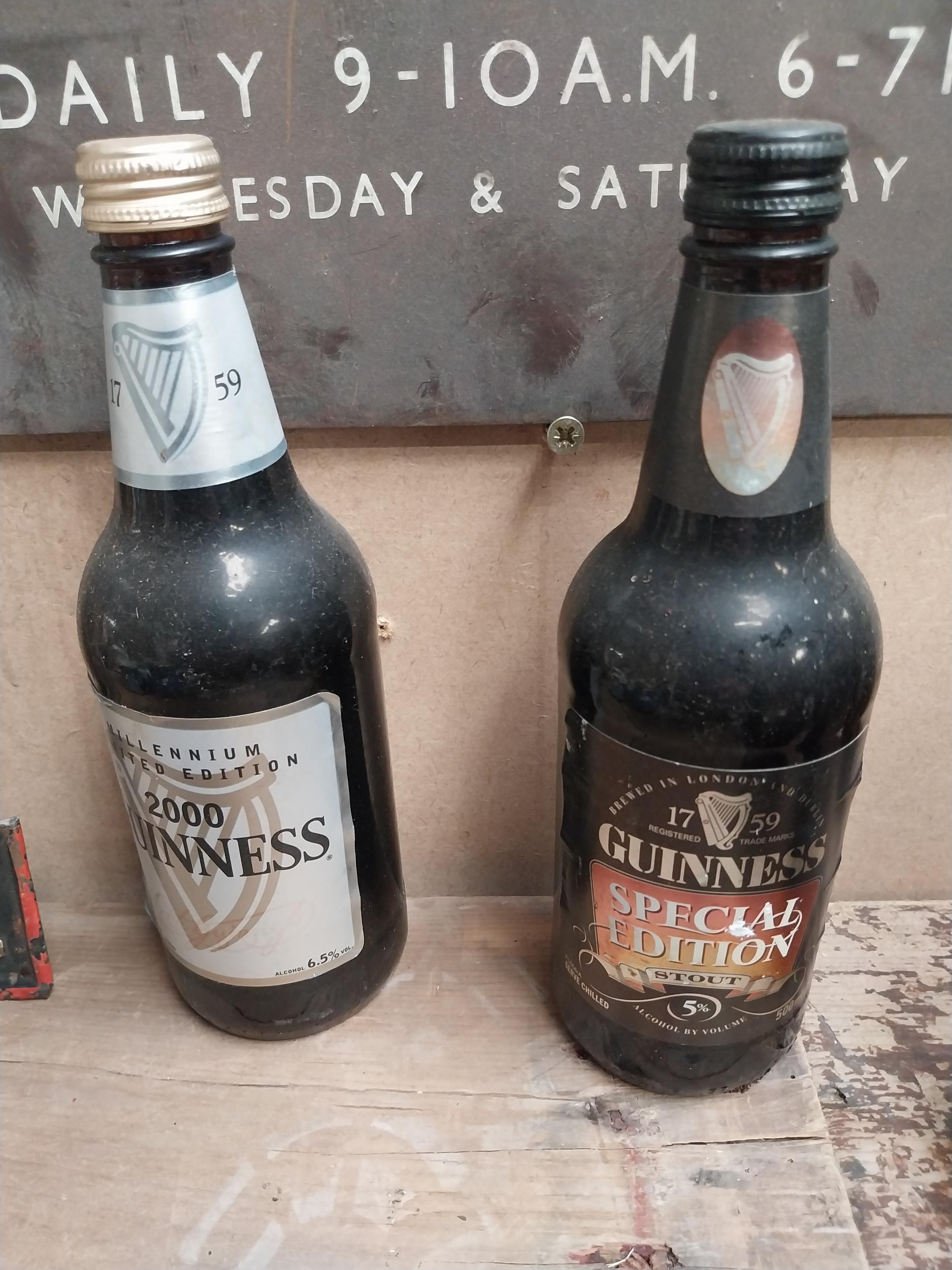 Five bottles of Guinness incuding a Christmas bottle and Year 2000 bottle. {23 cm H x 7 cm Dia.}.