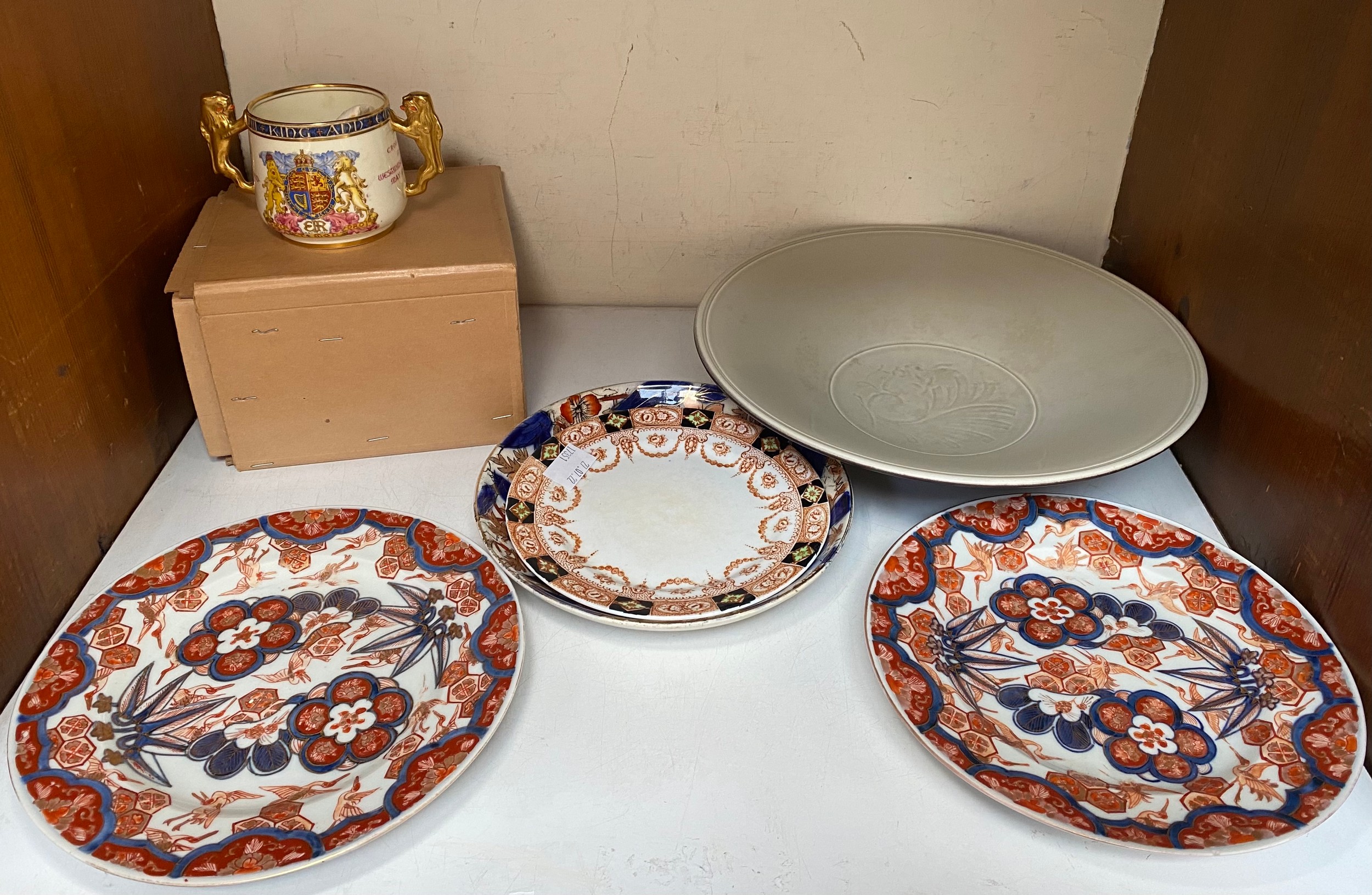 A pair of Japanese Imari plates decorated with storks and flowers, together with some further plates, coronation mug and a large Danish bowl with an impressed squirrel (Section 5)