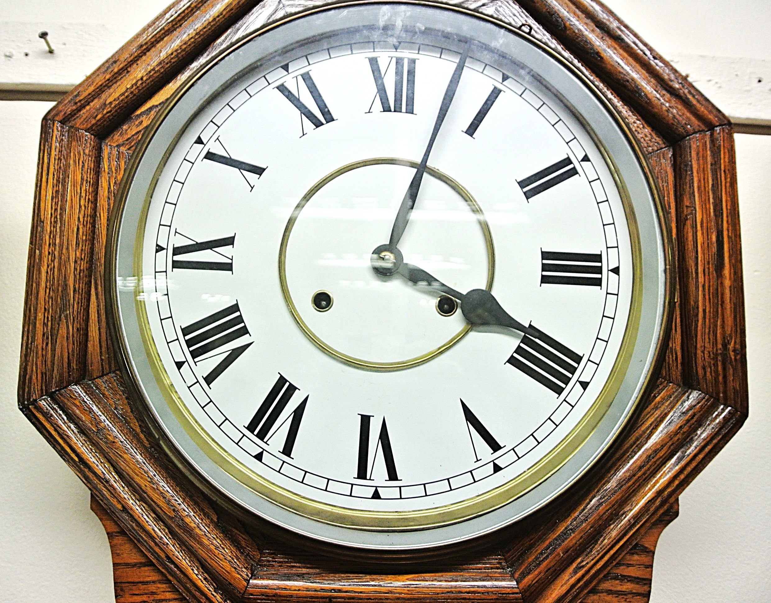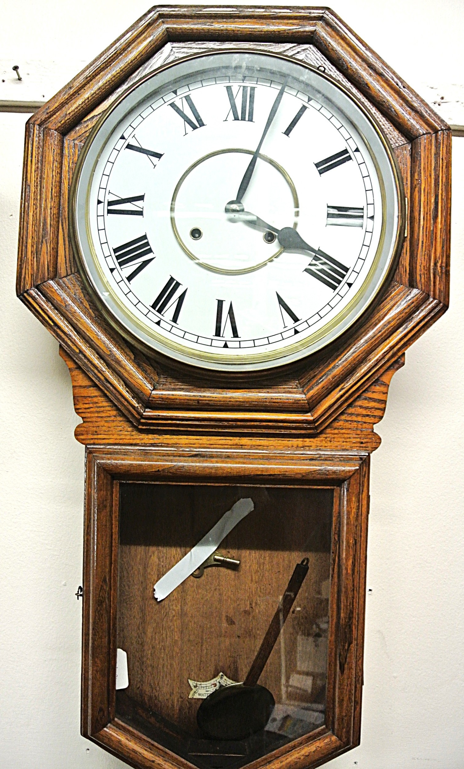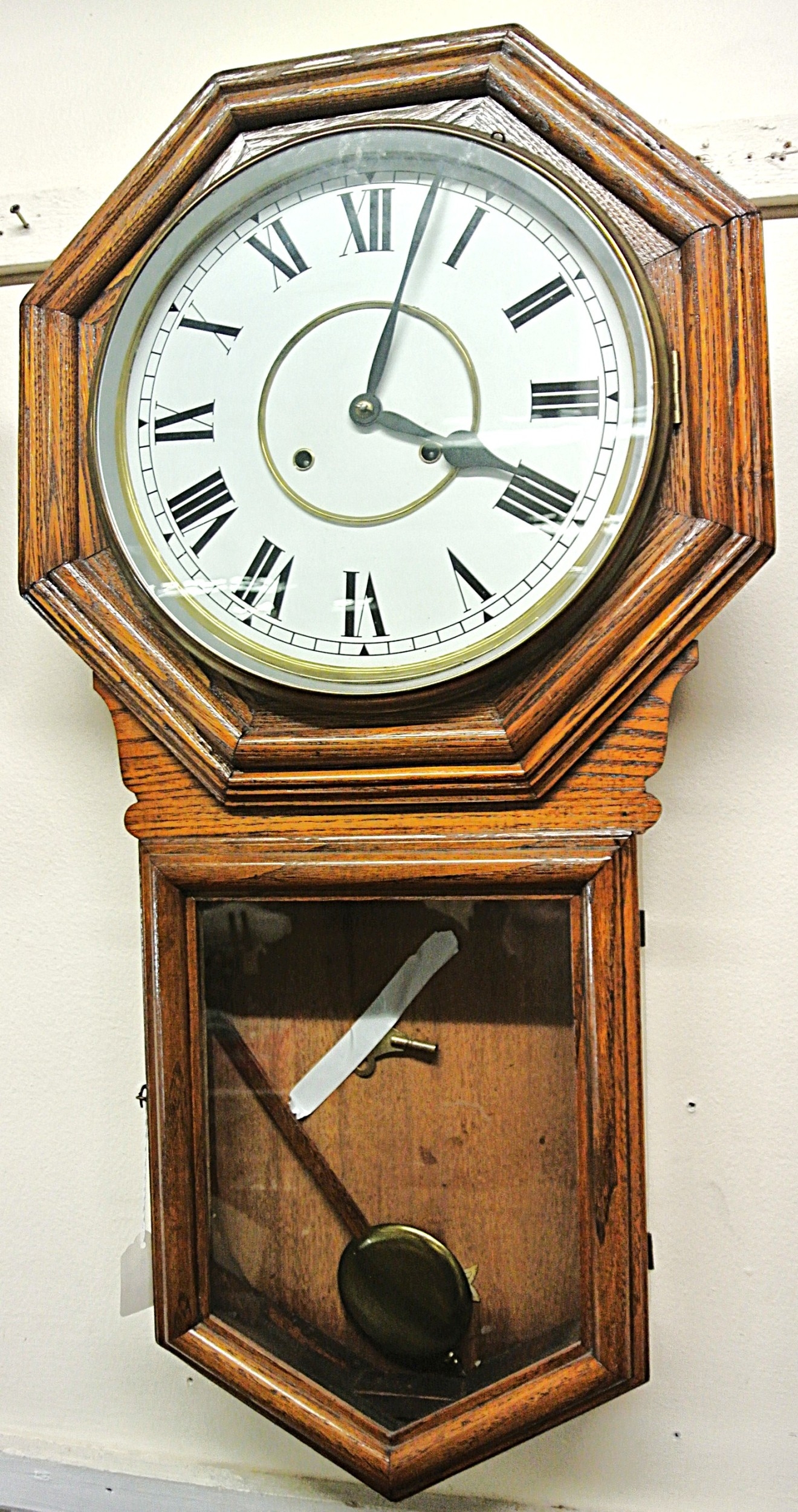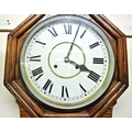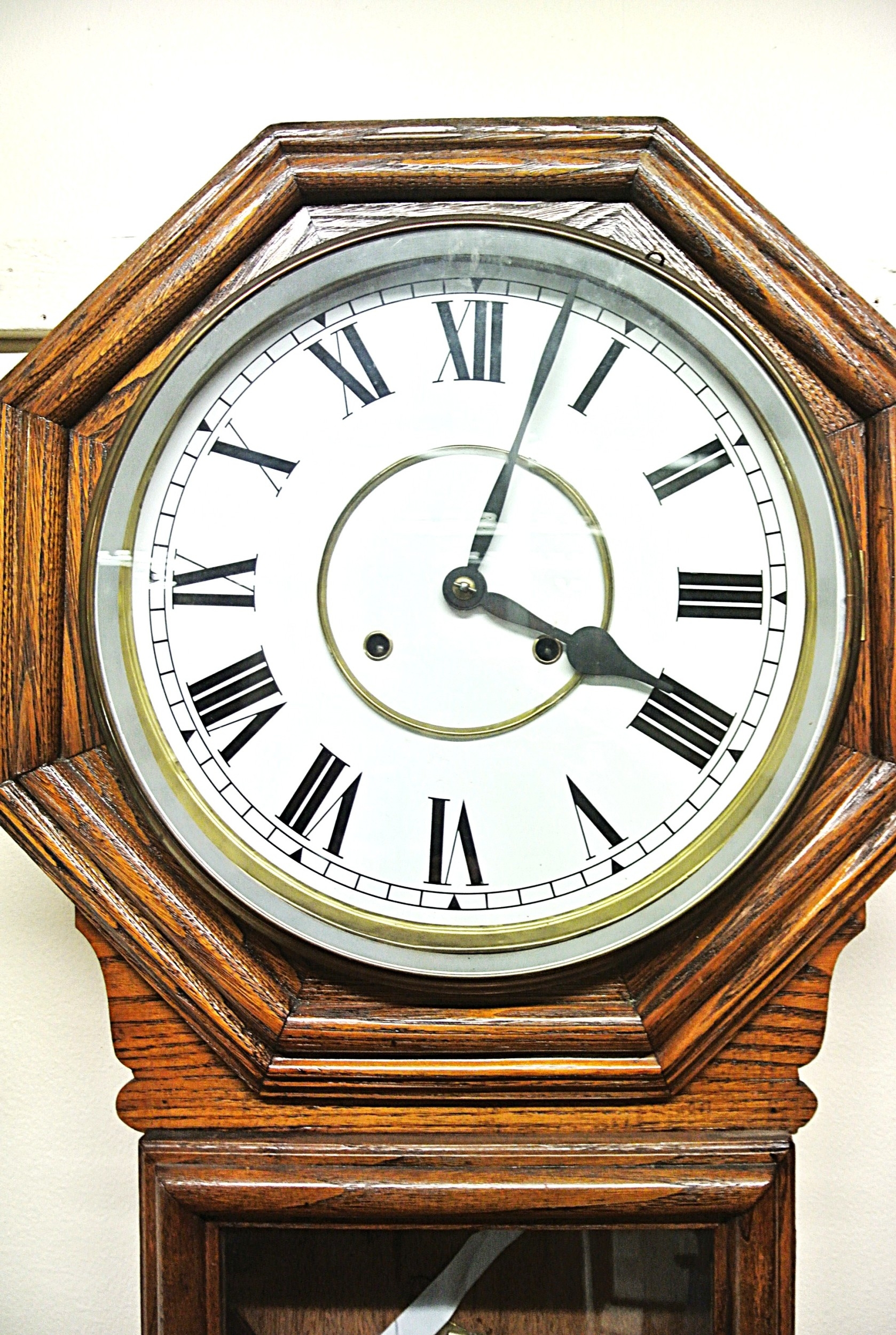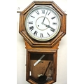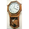 Victorian style regulator wall clock with hexagonal top, brass framed dial and pendulum