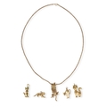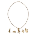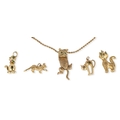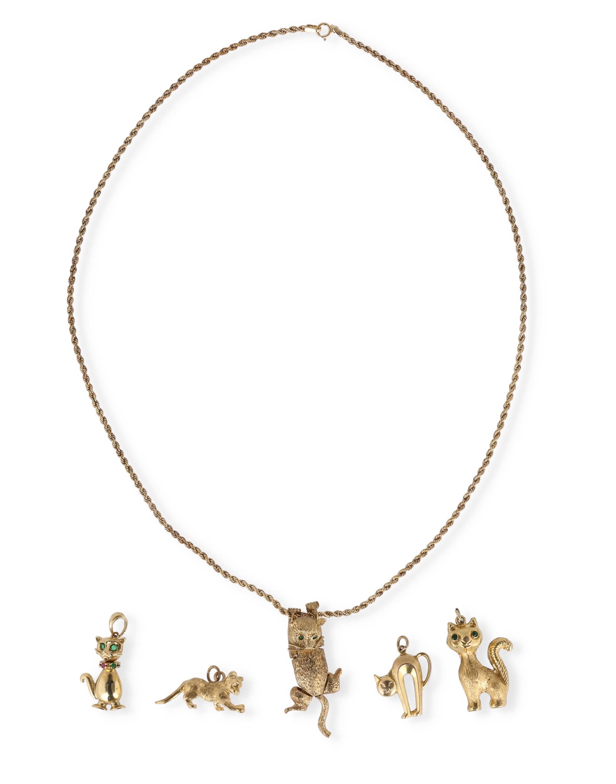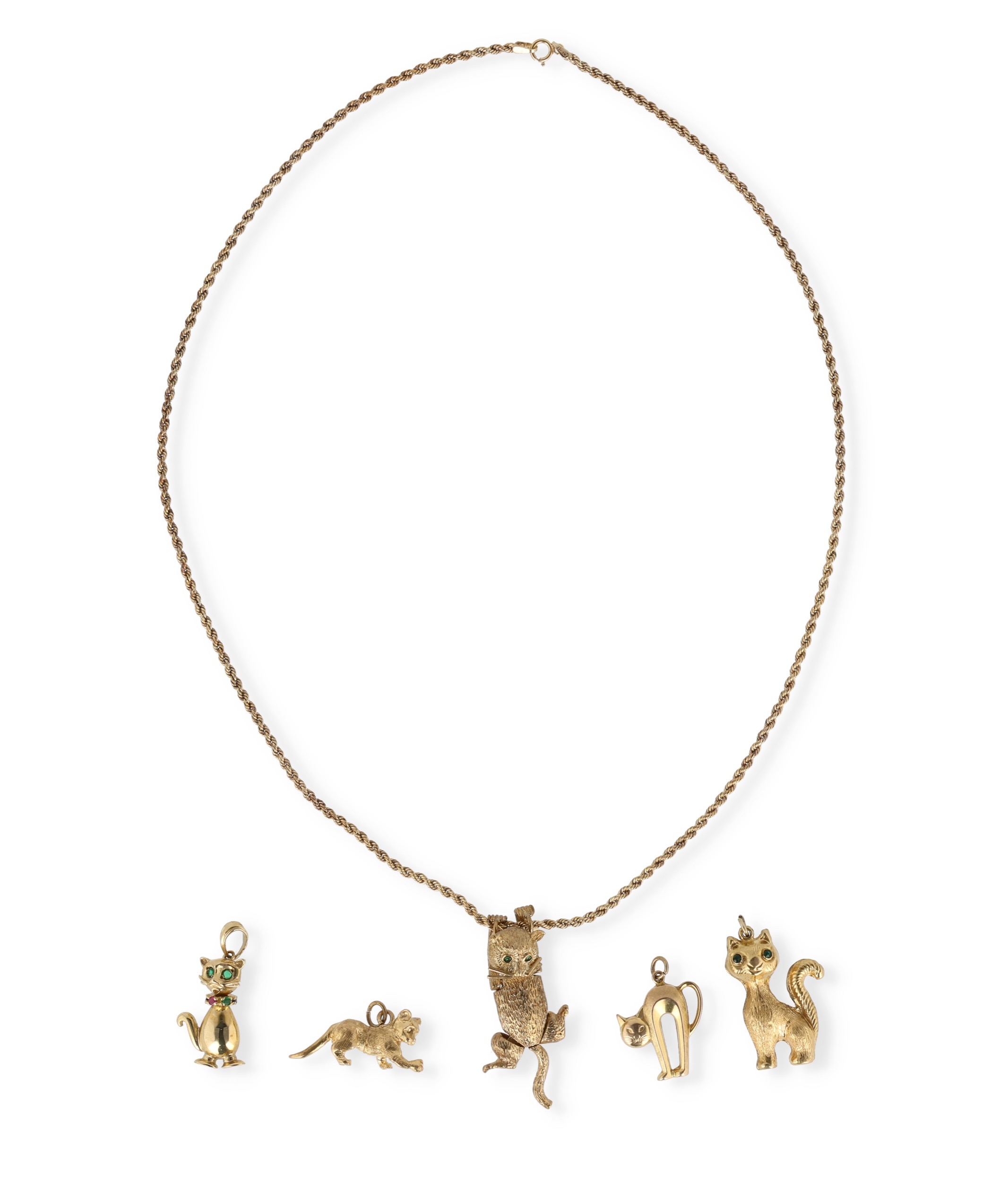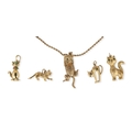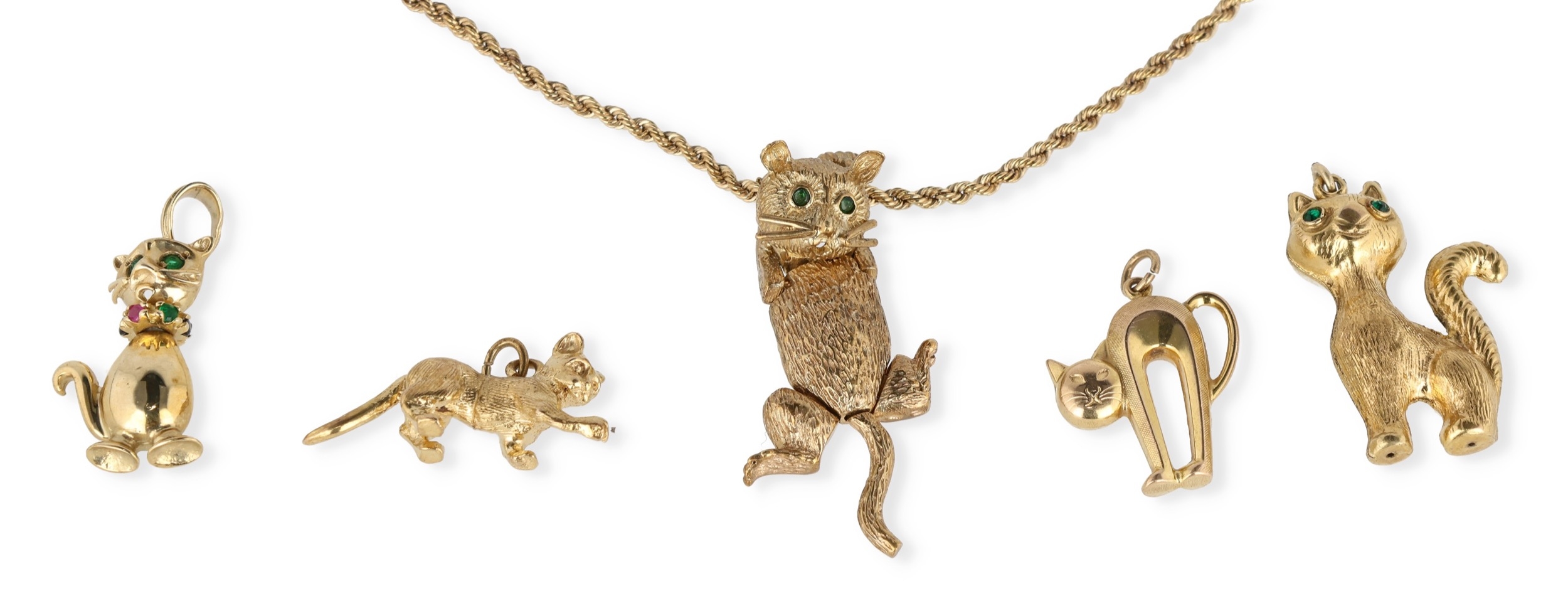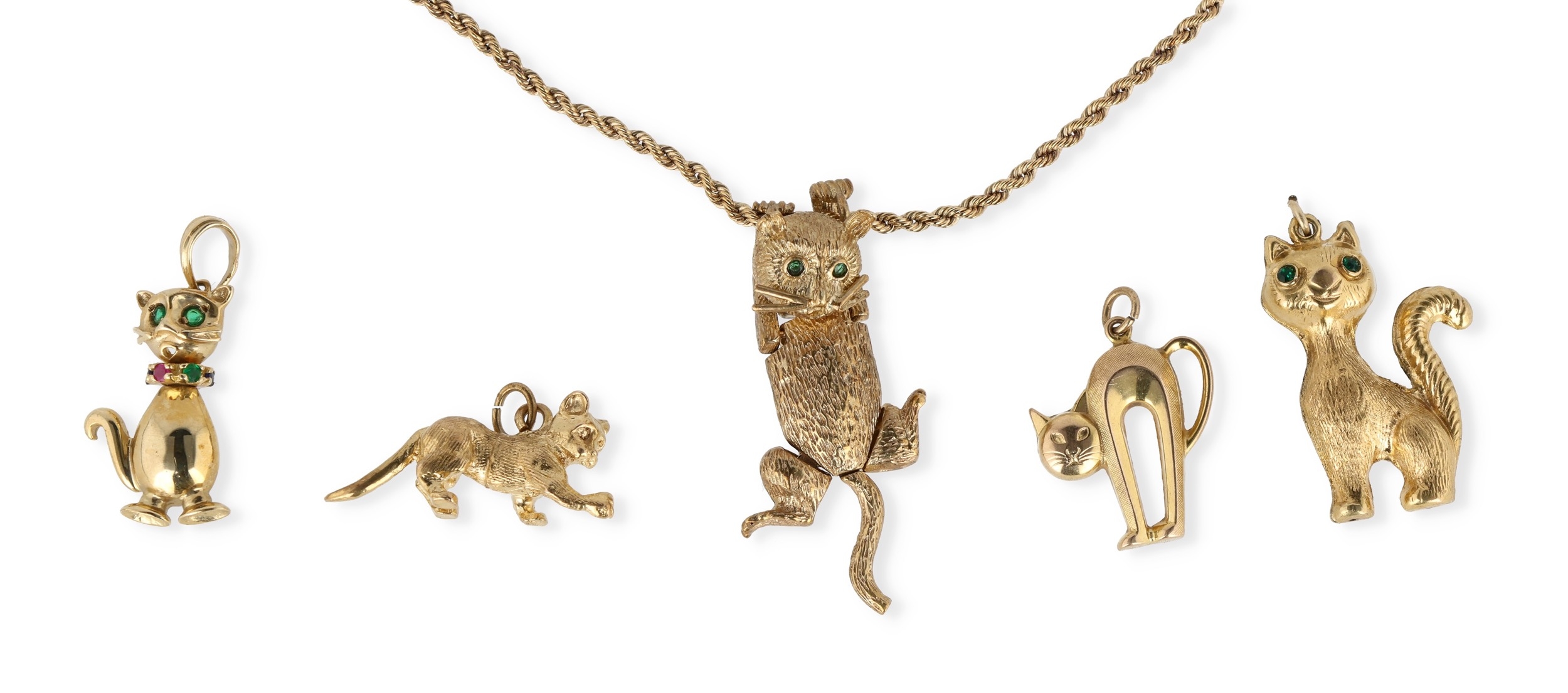 A MODERN 9CT GOLD ARTICULATED PENDANT IN THE FORM OF A CAT, WITH STONE SET EYES, ON A 9CT GOLD TWISTED LINK NECK CHAIN, TOGETHER WITH FOUR OTHER GOLD CAT PENDANTS