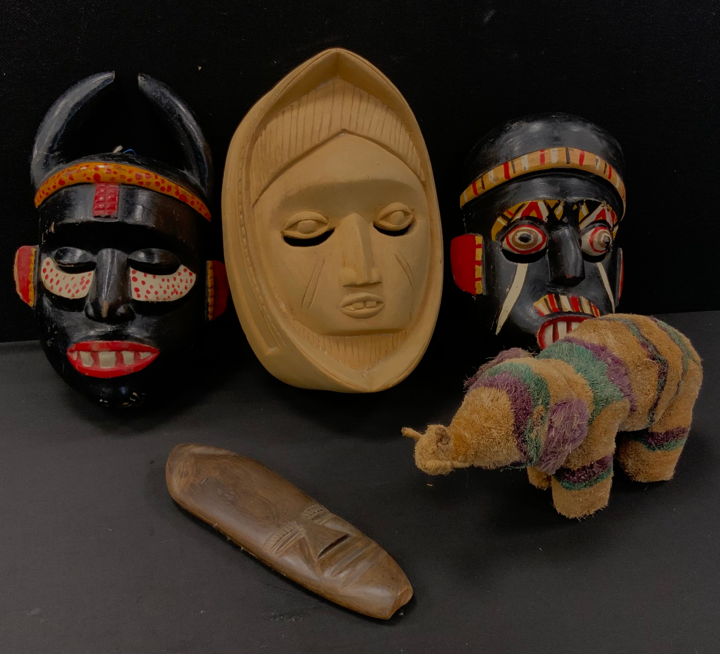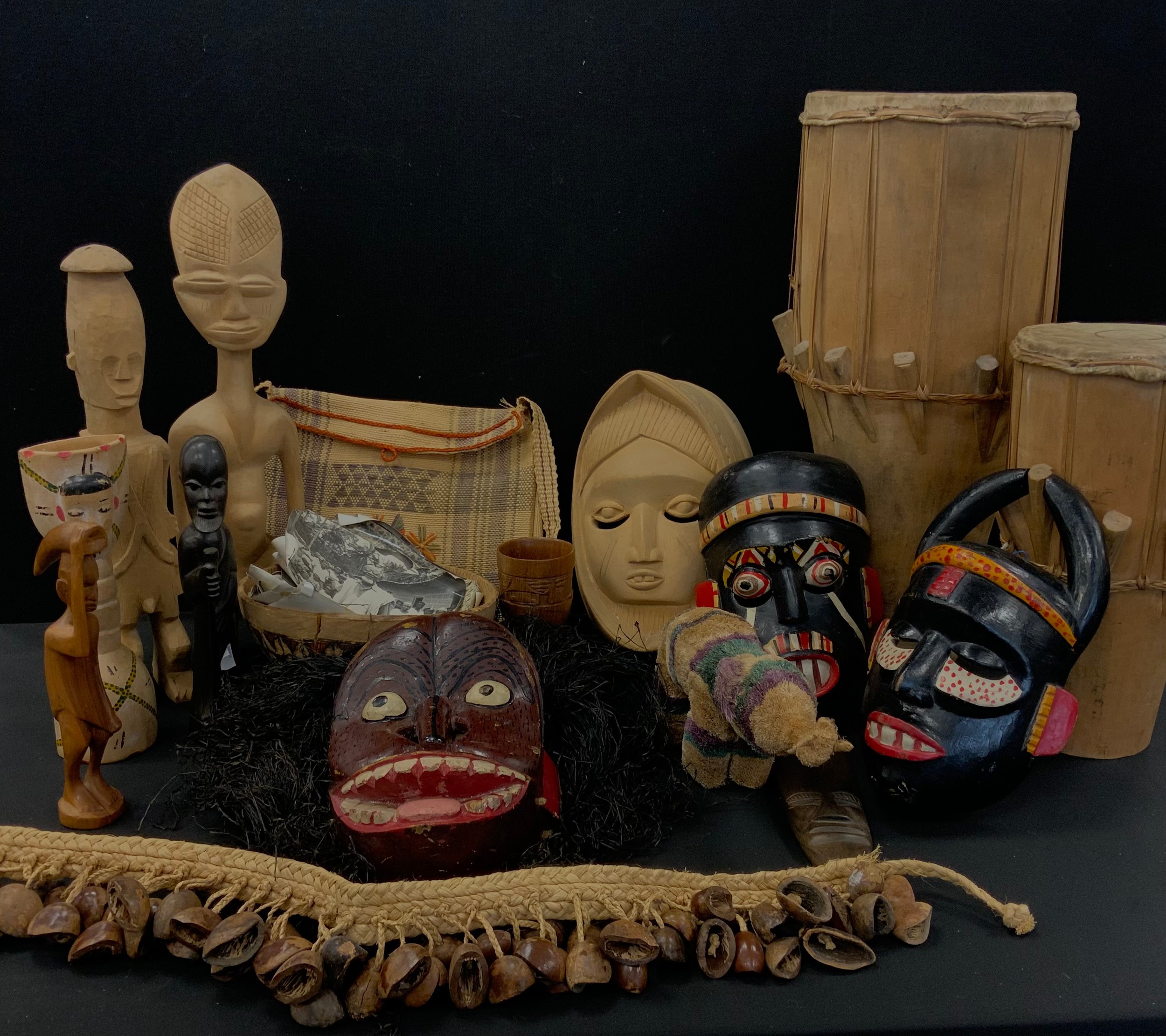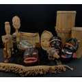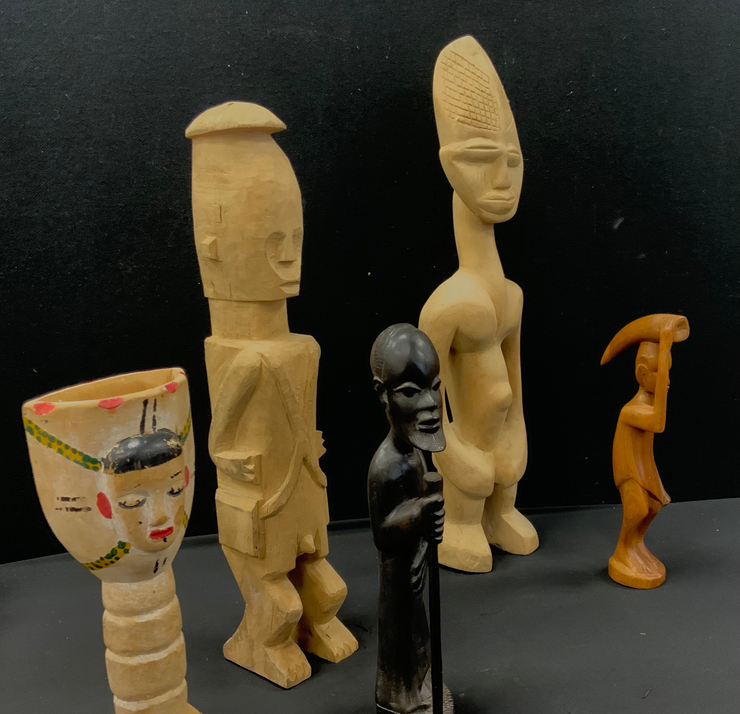 Tribal Art Items - a collection African Nigerian and other tribal items, including Fertility figures, masks, pair of graduated drums, bowls, snakeskin etc qty my father was a missionary in Nigeria Africa in 1960-61 He worked with the tribes and carried out missionary work. The items were given to him as gifts after he retired in England. There is a photo of 1 item a man was carving for him also photo of man and woman of the tribes in Nigeria etc